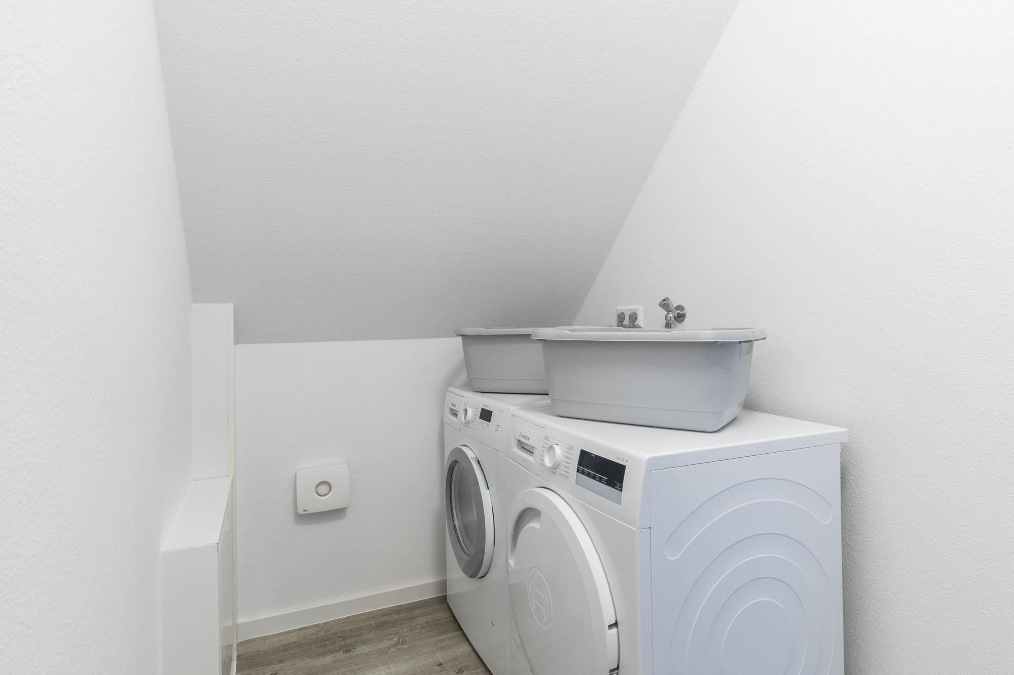 Ein separater Waschraum mit Waschmaschine, Wäscheständer und Trockner befindet sich ebenfalls auf dieser Etage.