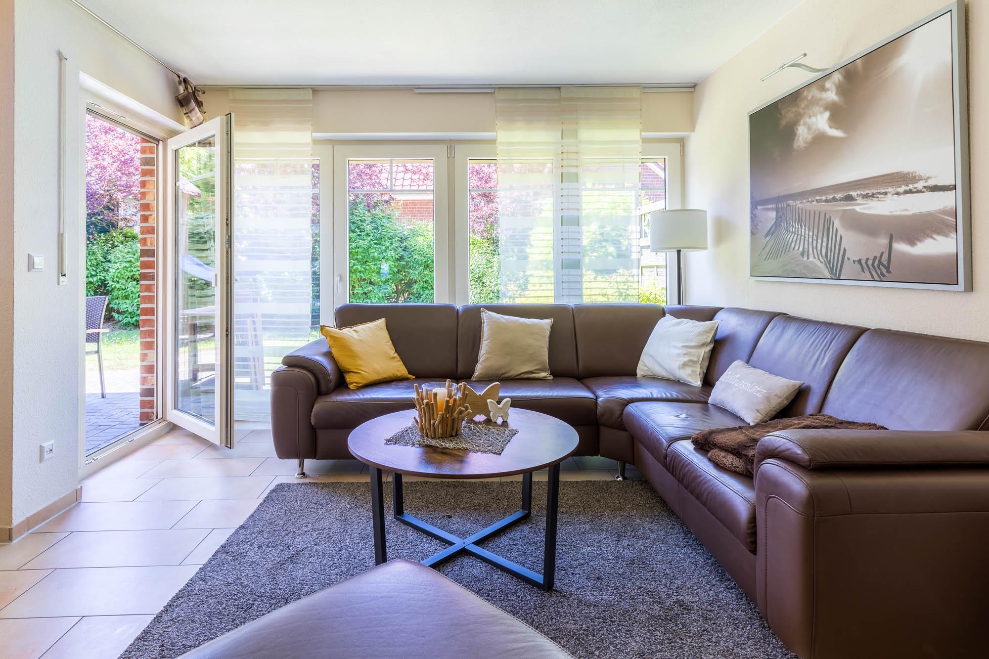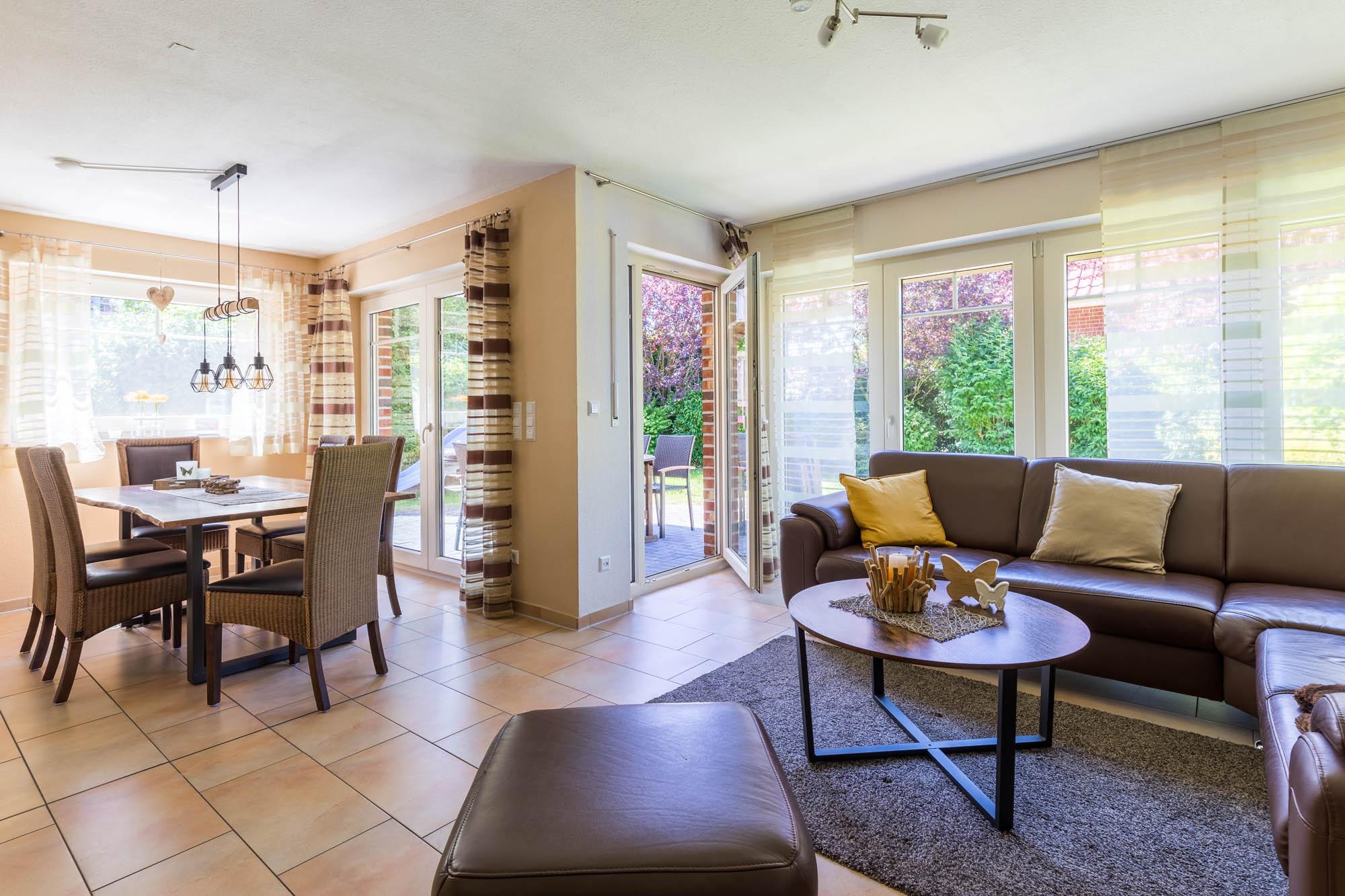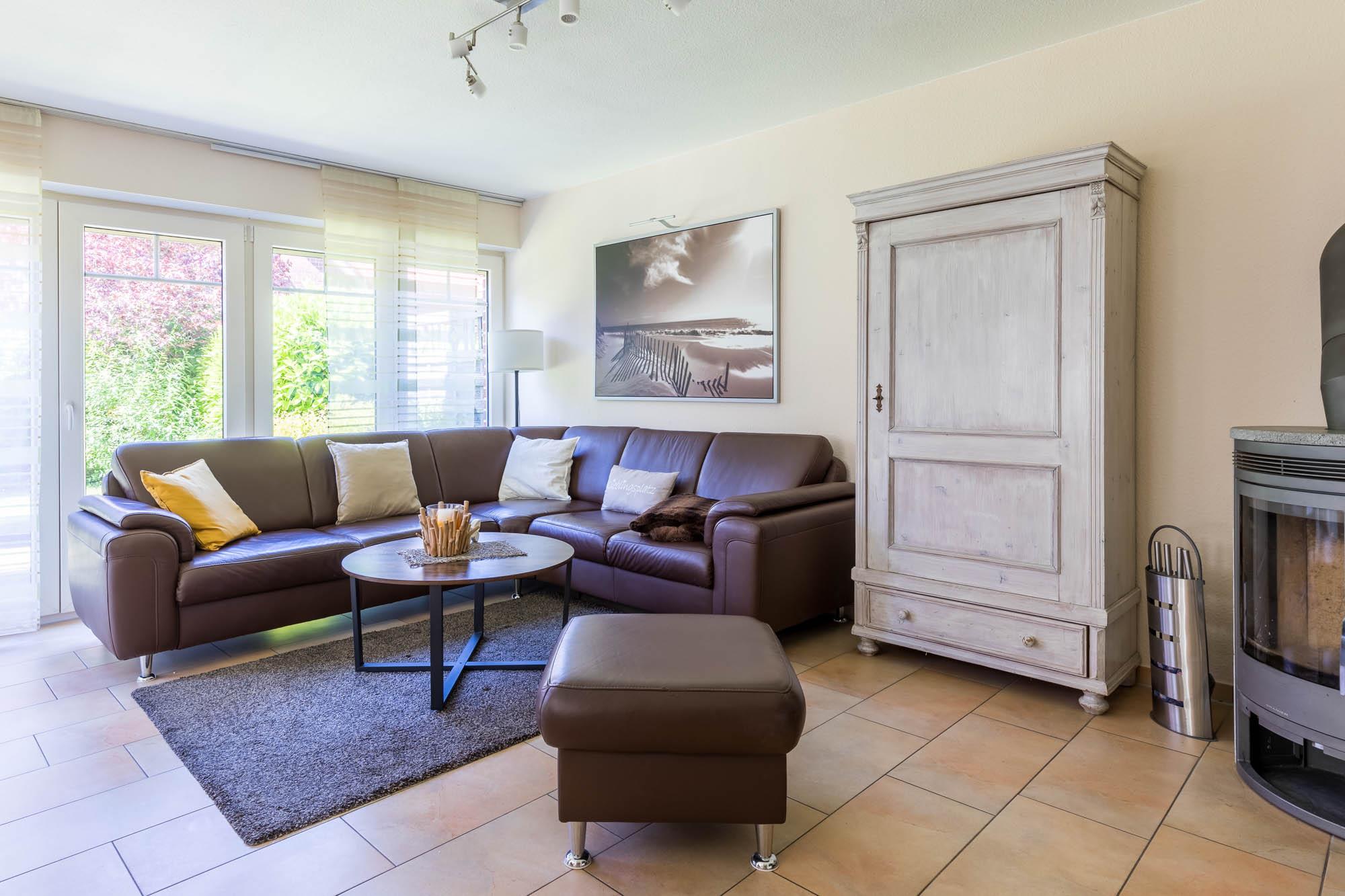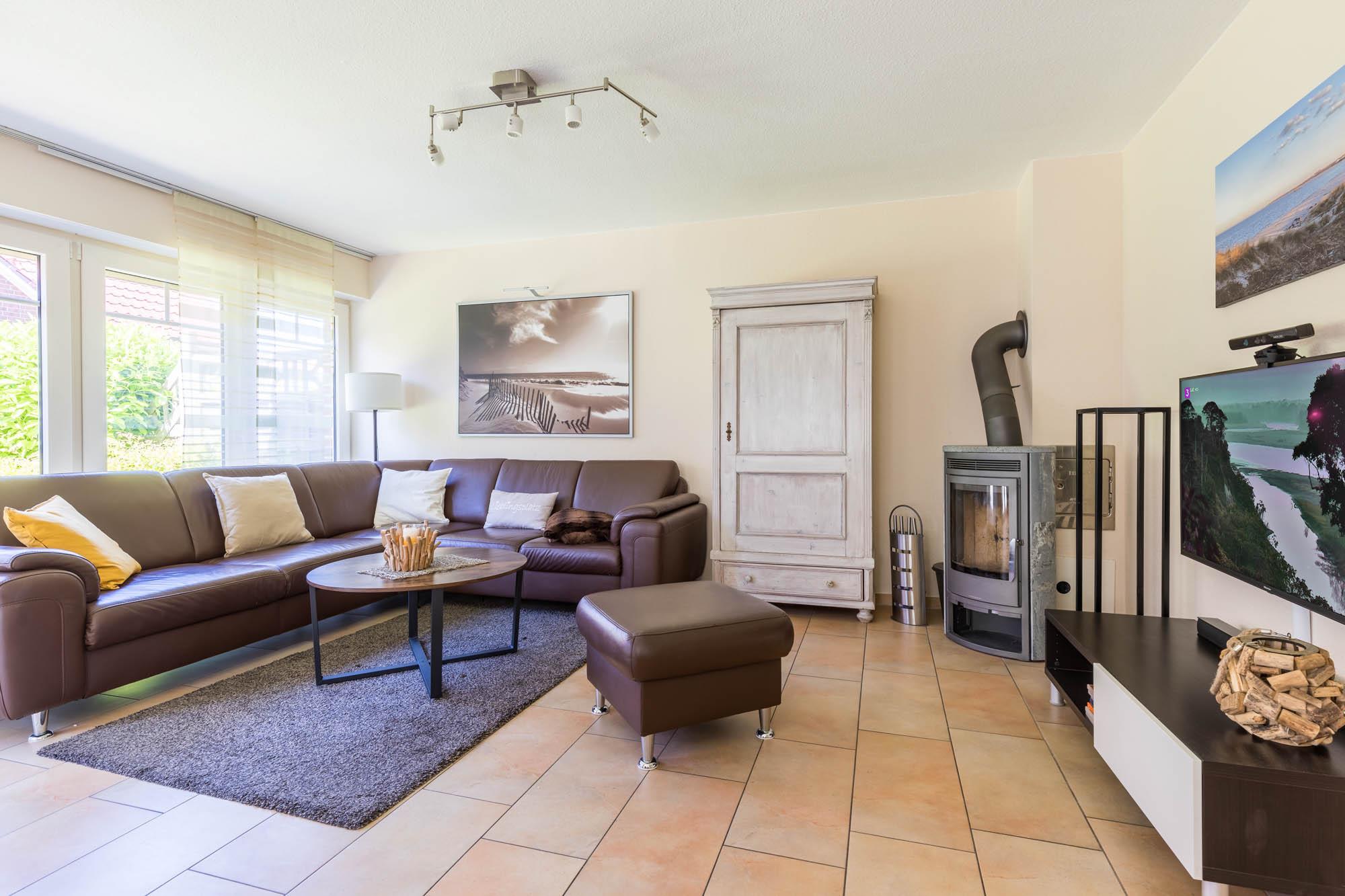 Das behagliche Wohnzimmer lädt zu ruhigen und entspannten Stunden zu Hause ein. An kälteren Tagen sorgt hier neben der Fußbodenheizung auch ein Kamin für wohlige Wärme. Durch Flatscreen-TV, CD-Player oder auch der Playstation kommt auch an regnerischen Tagen keine Langeweile auf.