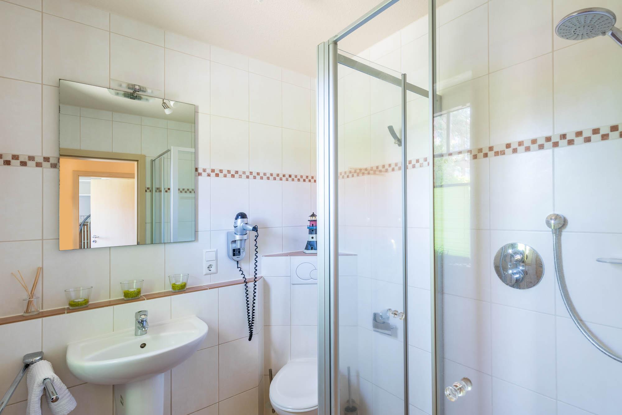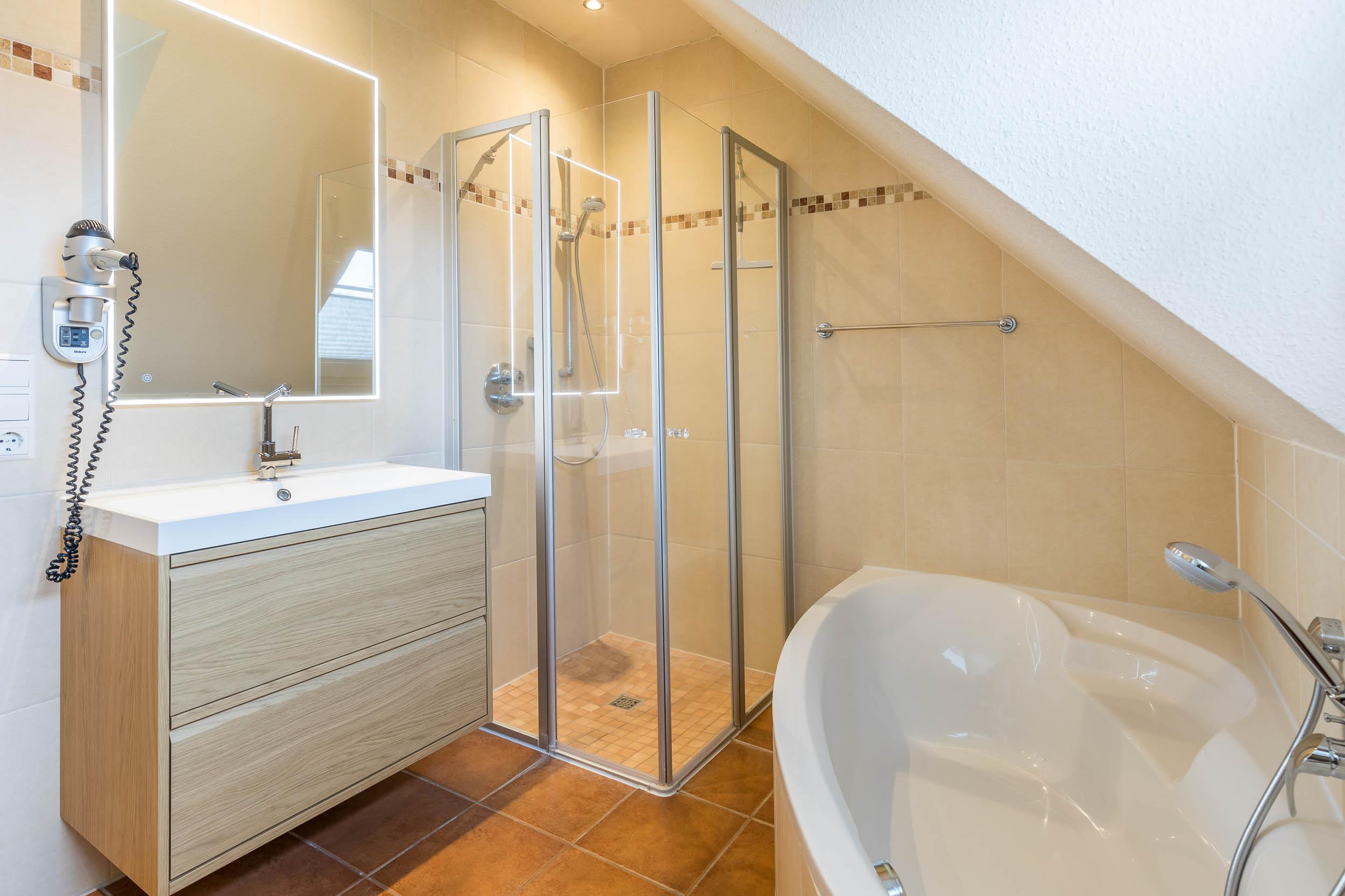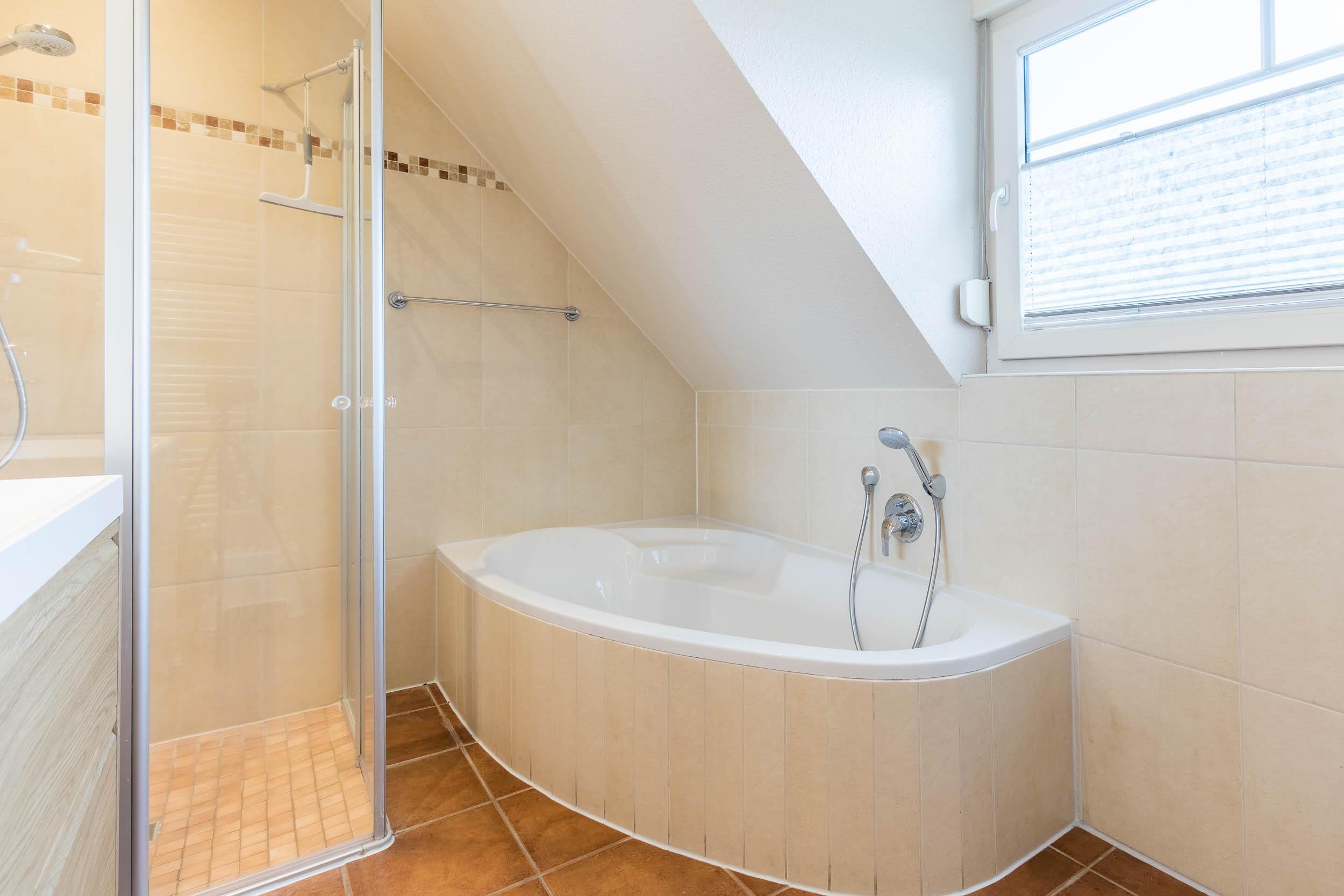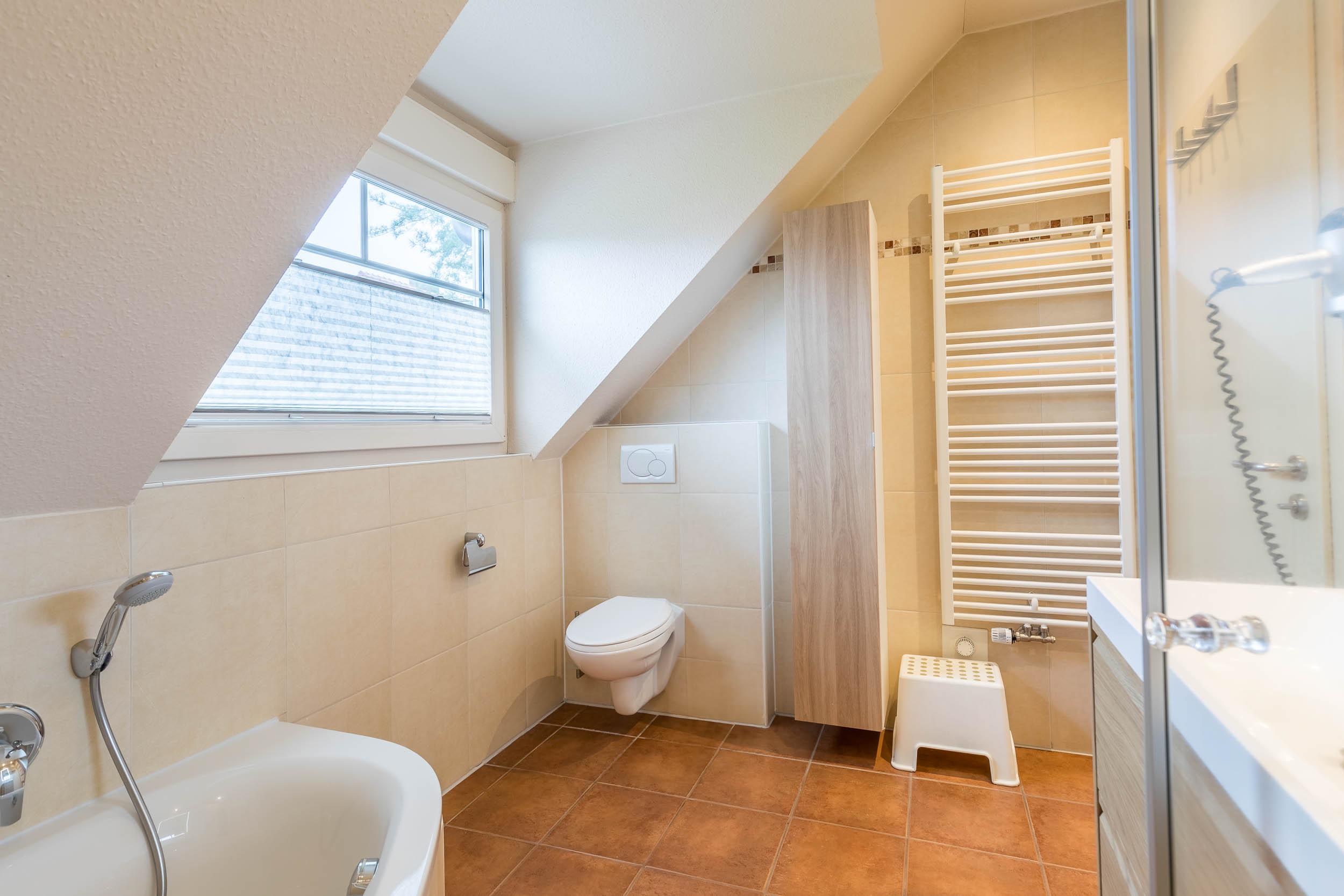 Das Badezimmer, ebenfalls mit Fenster, im Obergeschoss hat neben einer Dusche und WC auch eine Badewanne.