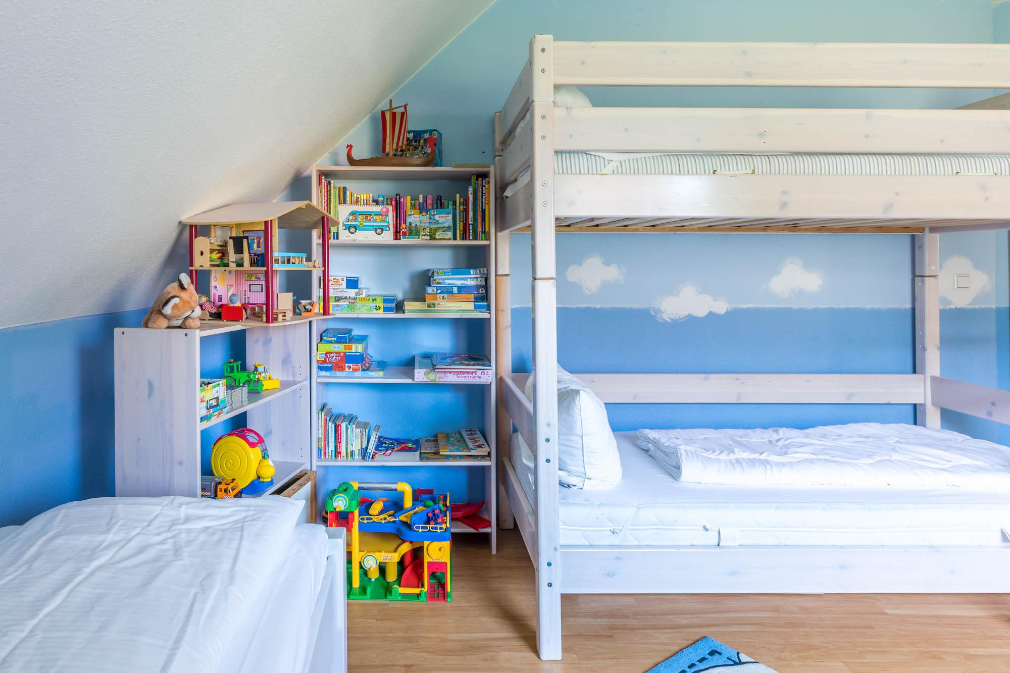 Ein Highlight des Ferienhauses ist für Kinder definitiv das liebevoll eingerichtete Gäste-/ Kinderzimmer: es beinhaltet ein Etagenbett und ein Einzelbett. Langeweile kommt hier nicht auf, denn der Raum bietet mit einer eigenen Spielecke den Kleinen genügend Platz zum Spielen. In allen drei Schlafräumen befindet sich außerdem ein Kleiderschrank für Ihre Garderobe.
