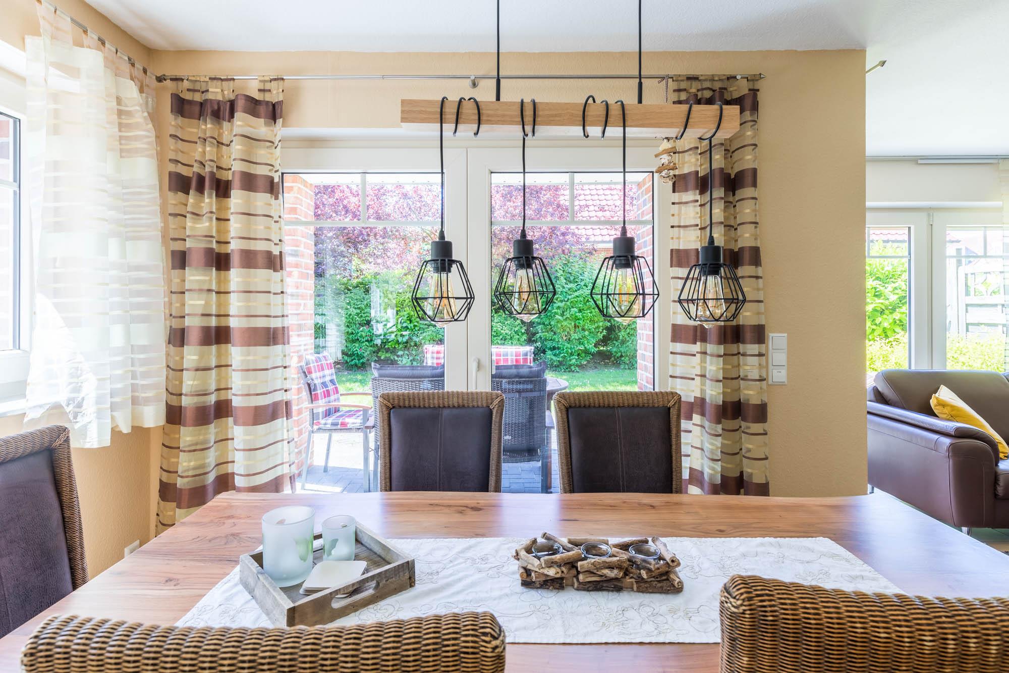 Der Wohn- und Essbereich im Erdgeschoss ist offen miteinander verbunden und grenzt an die beeindruckende Küche im amerikanischen Stil.