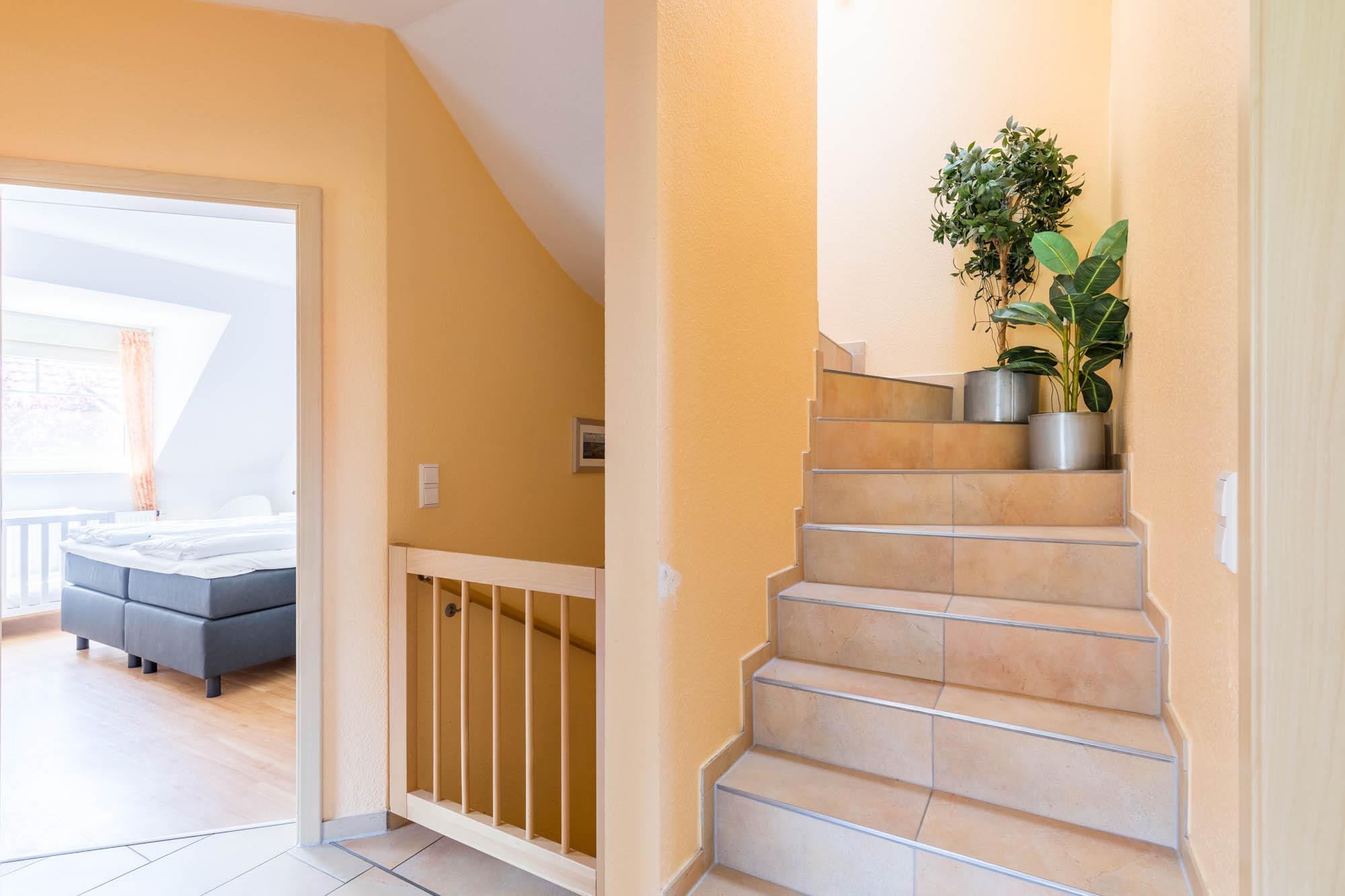 Vom Flur aus führt Sie eine Treppe ins 1. Obergeschoss. An der oberen Treppe ist ein Treppenschutzgitter angebracht.