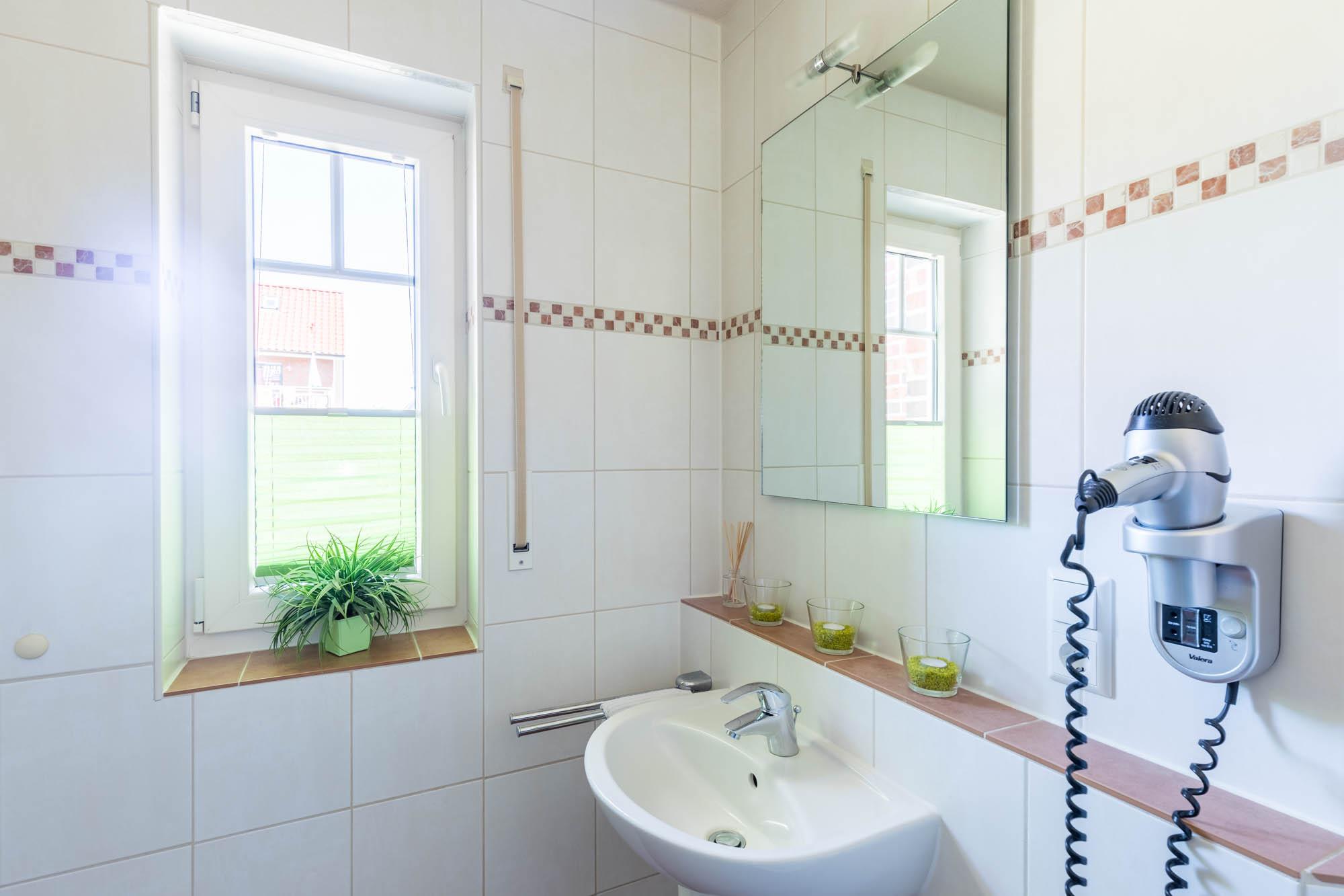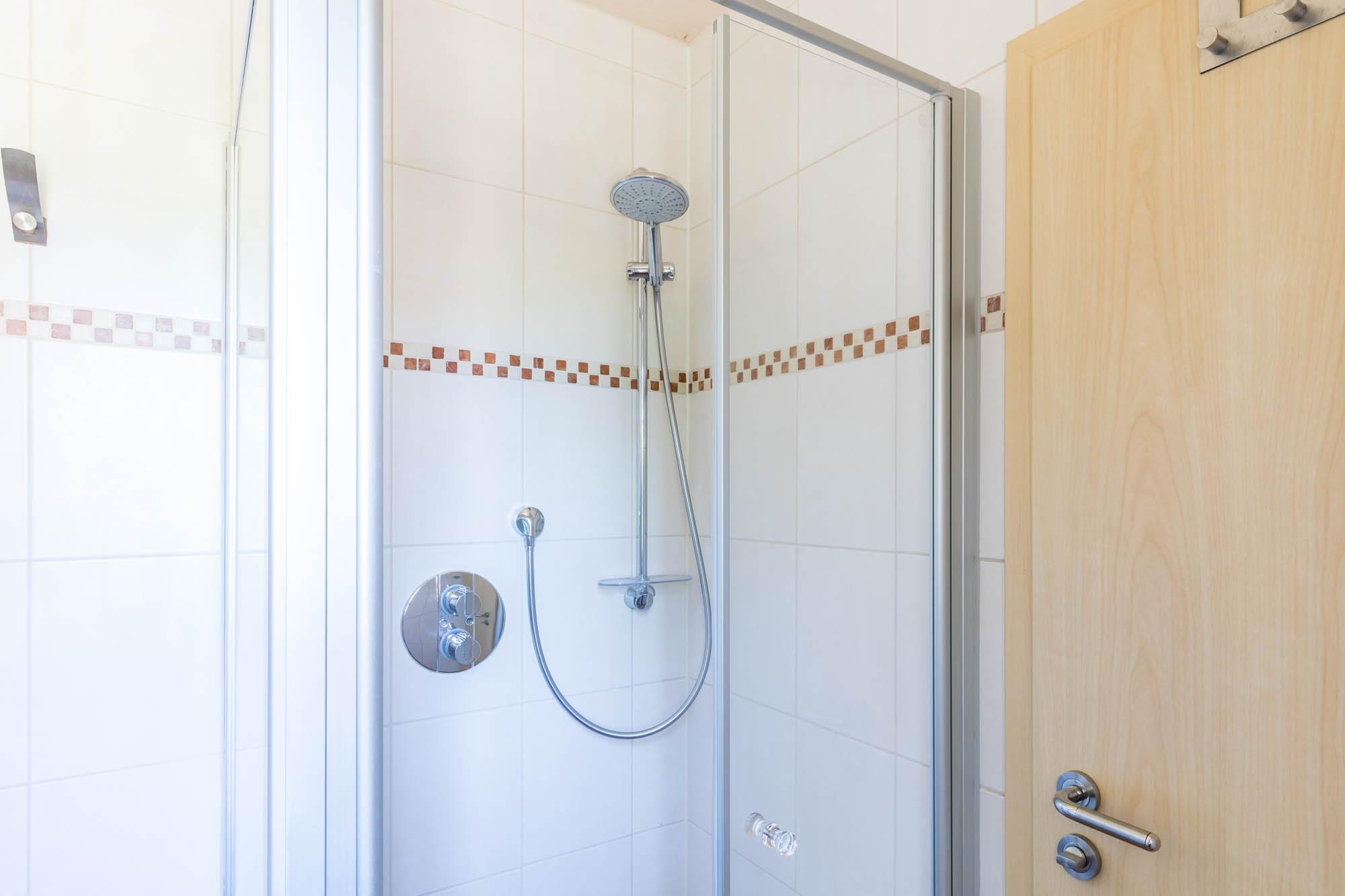 Auch eines der beiden Badezimmer befindet sich im Erdgeschoss. Es ist mit Dusche und WC ausgestattet, ein Fenster sorgt für zusätzliches Tageslicht.
