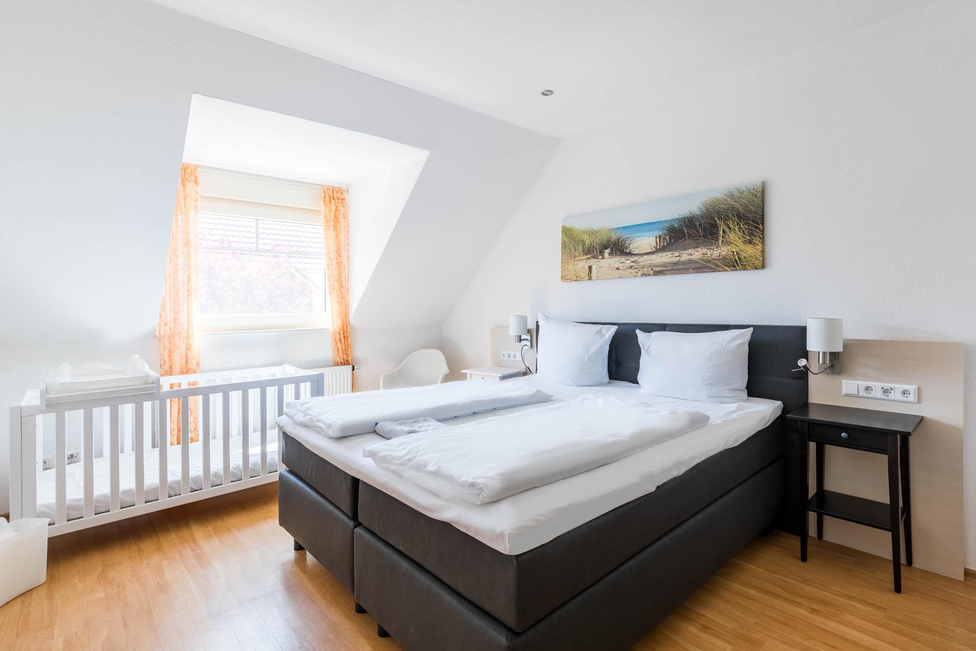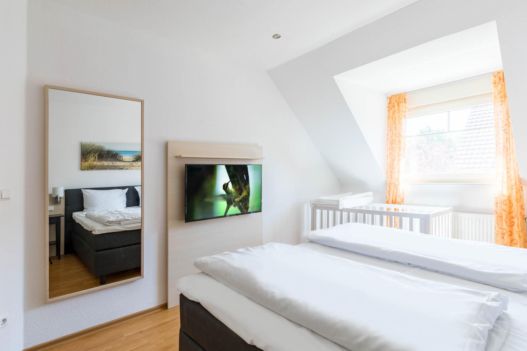 Auch diese Etage verfügt über eine moderne Ausstattung. Im ersten Schlafzimmer stehen ein geräumiges Doppelbett sowie ein festes Holzgitterbett für die Kleinsten und ein Fernseher. Auch das zweite Schlafzimmer ist mit einem bequemen Doppelbett ausgestattet.