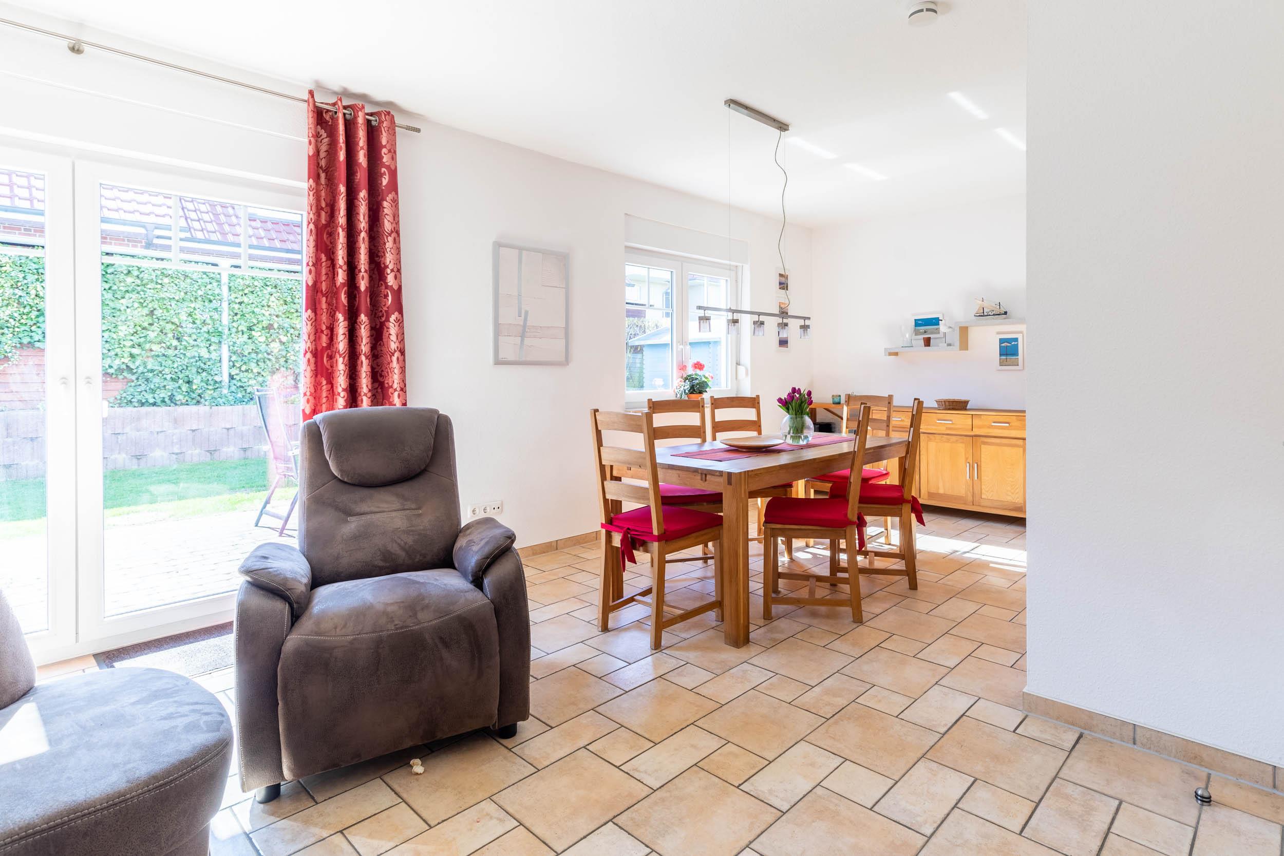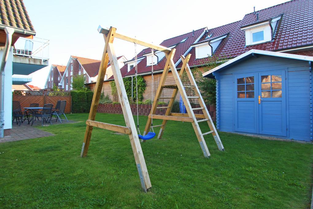 Die großzügige Südterrasse mit angrenzendem Rasengrundstück bietet bequeme Gartenmöbel für 8 Personen, einen Grill sowie einen Blick auf den hauseigenen, kleinen Kinderspielplatz für unsere kleinsten Gäste.