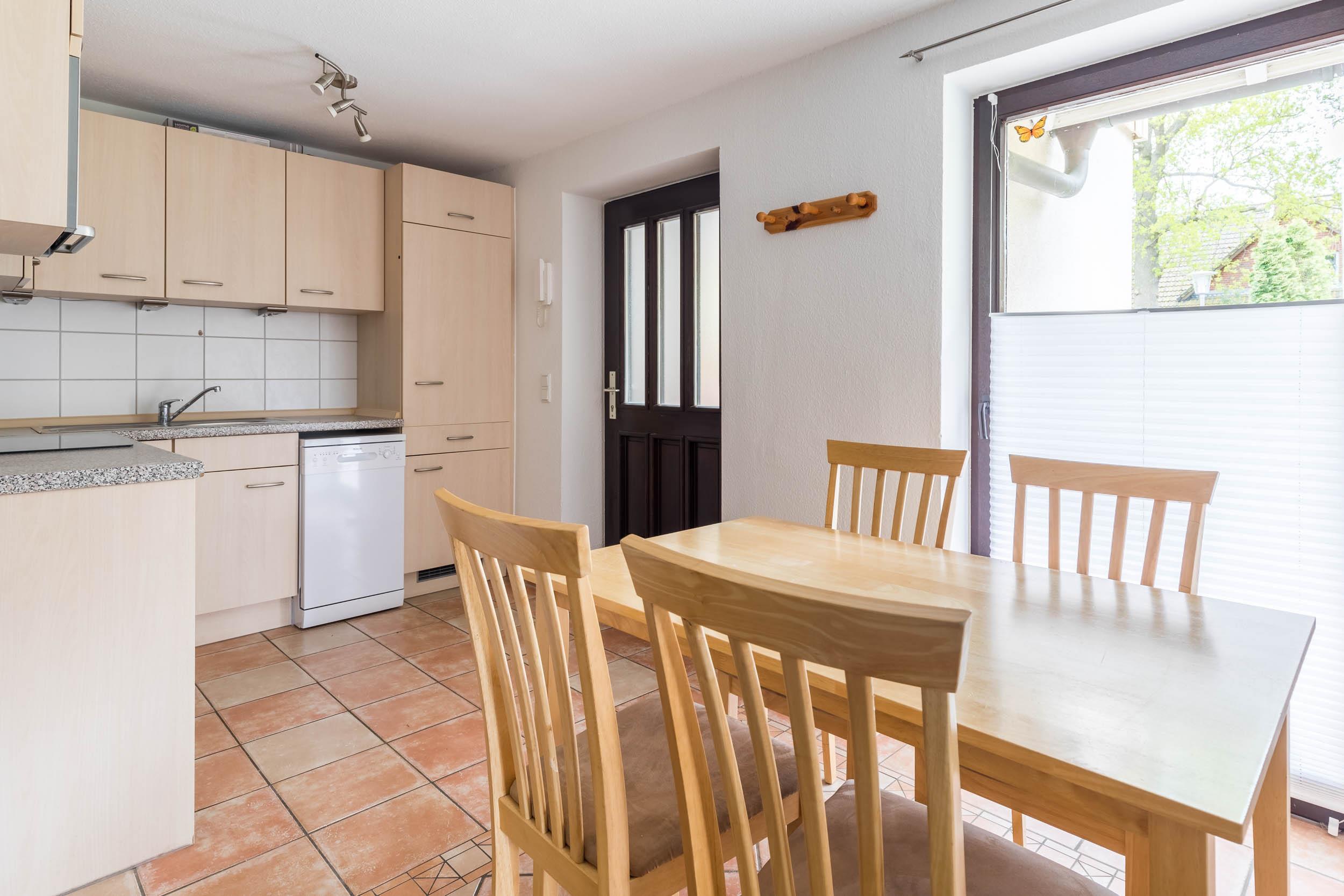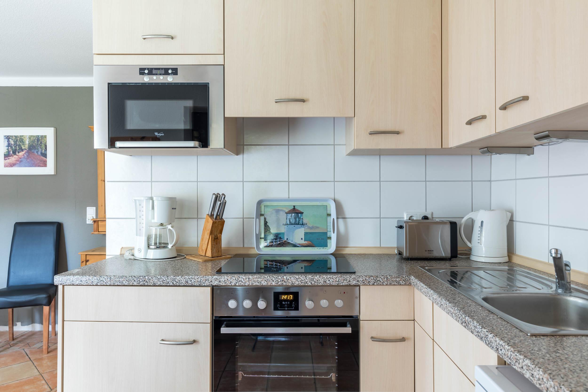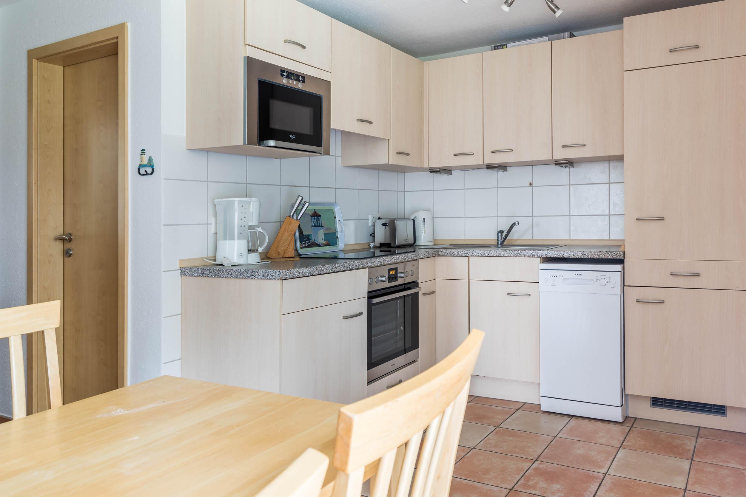 Im Eingangsbereich werden Sie von einer modernen, offenen Küchenzeile empfangen. Hier finden Sie neben einem Herd mit Backofen einen Kühlschrank mit Gefrierfach, eine Spülmaschine, einen Toaster, einen Wasserkocher und eine Kaffeemaschine. An der separaten Essecke können Sie gemütlich zusammen speisen.