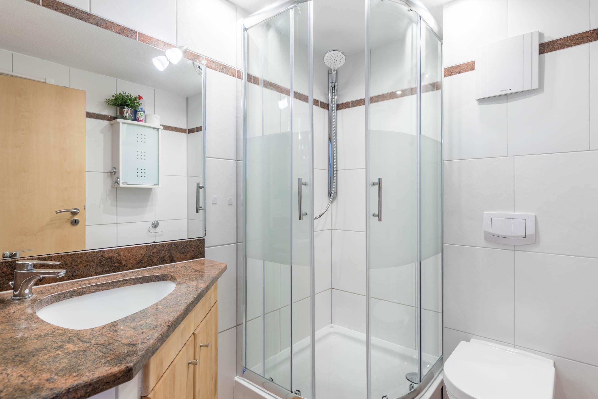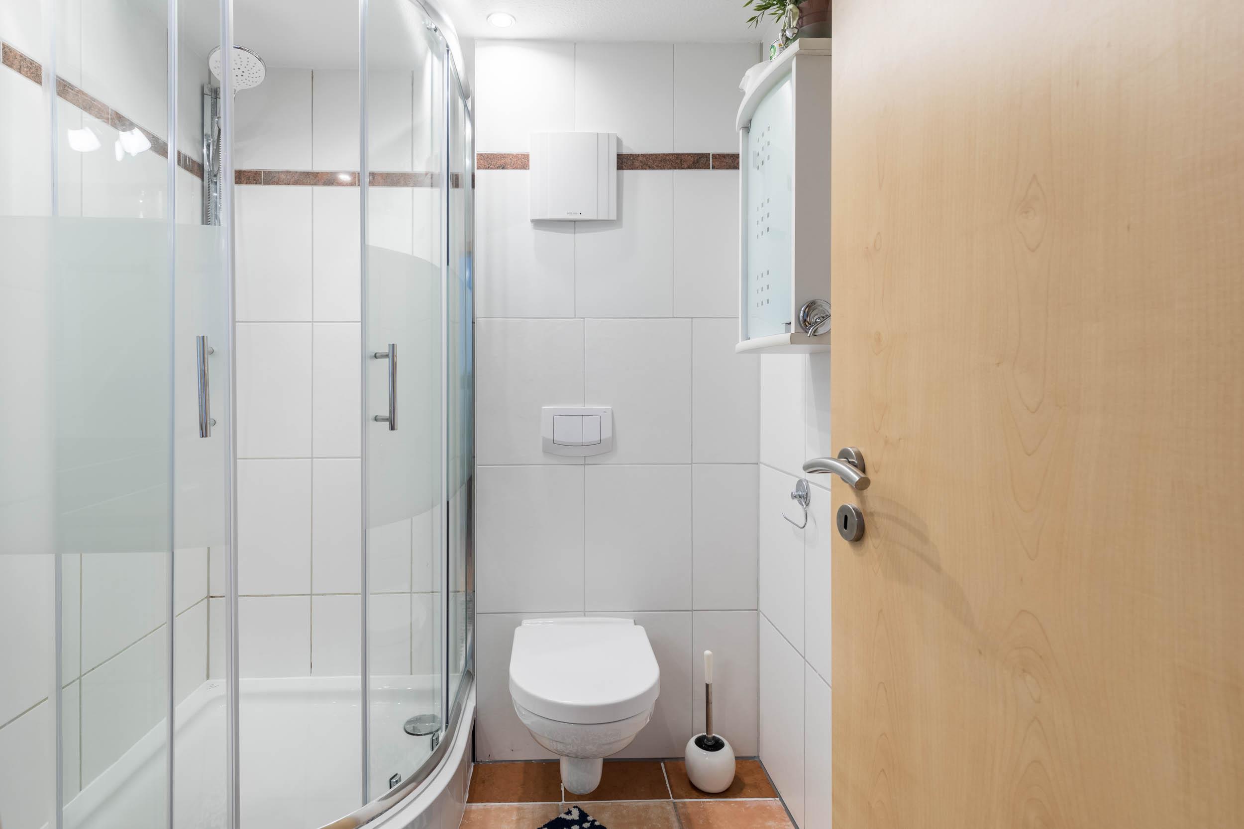 Das geflieste Bad bietet eine Dusche und WC.