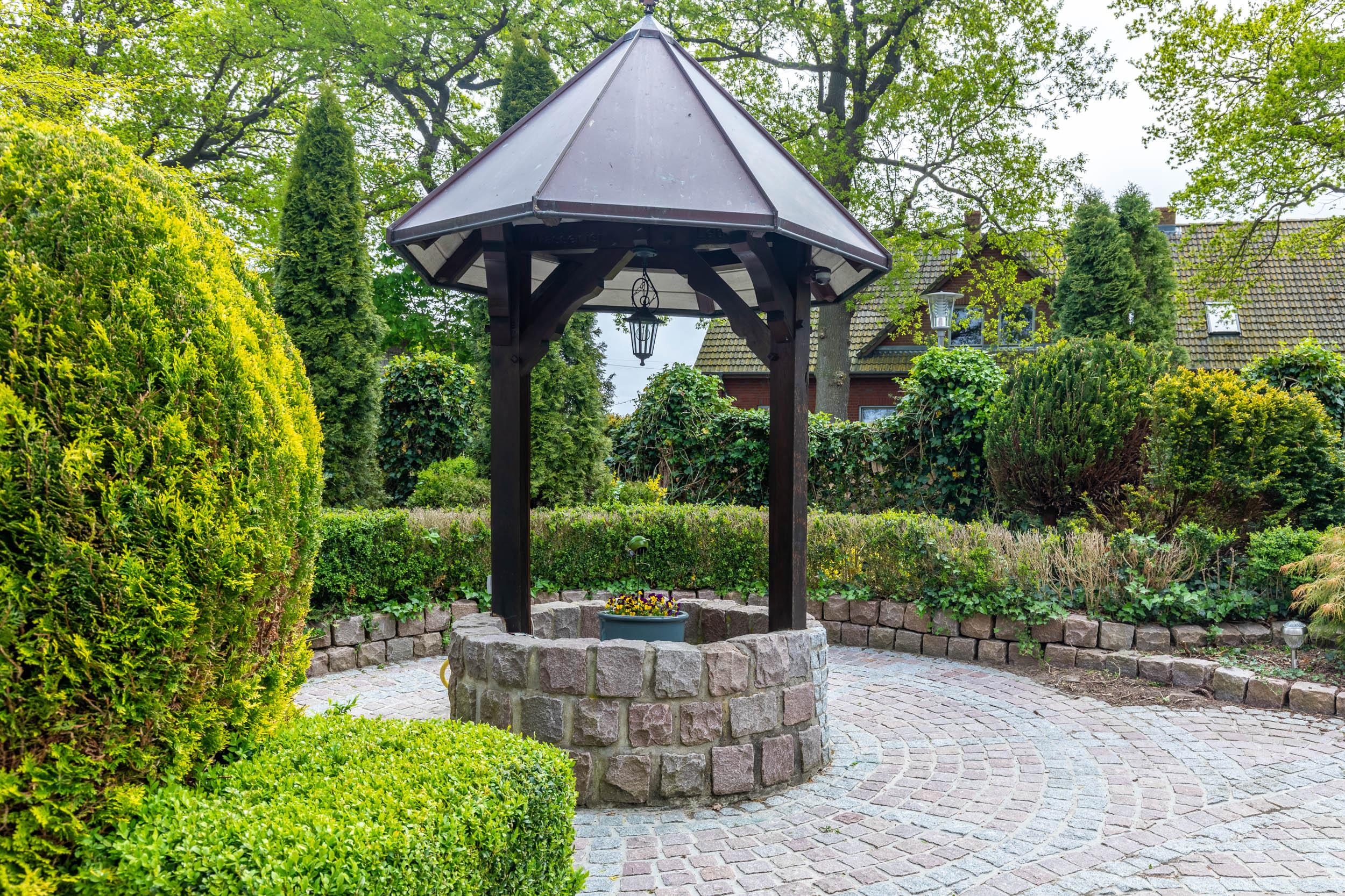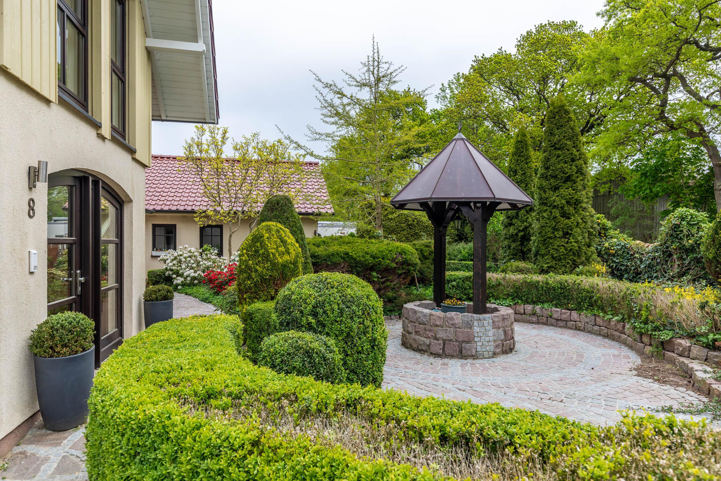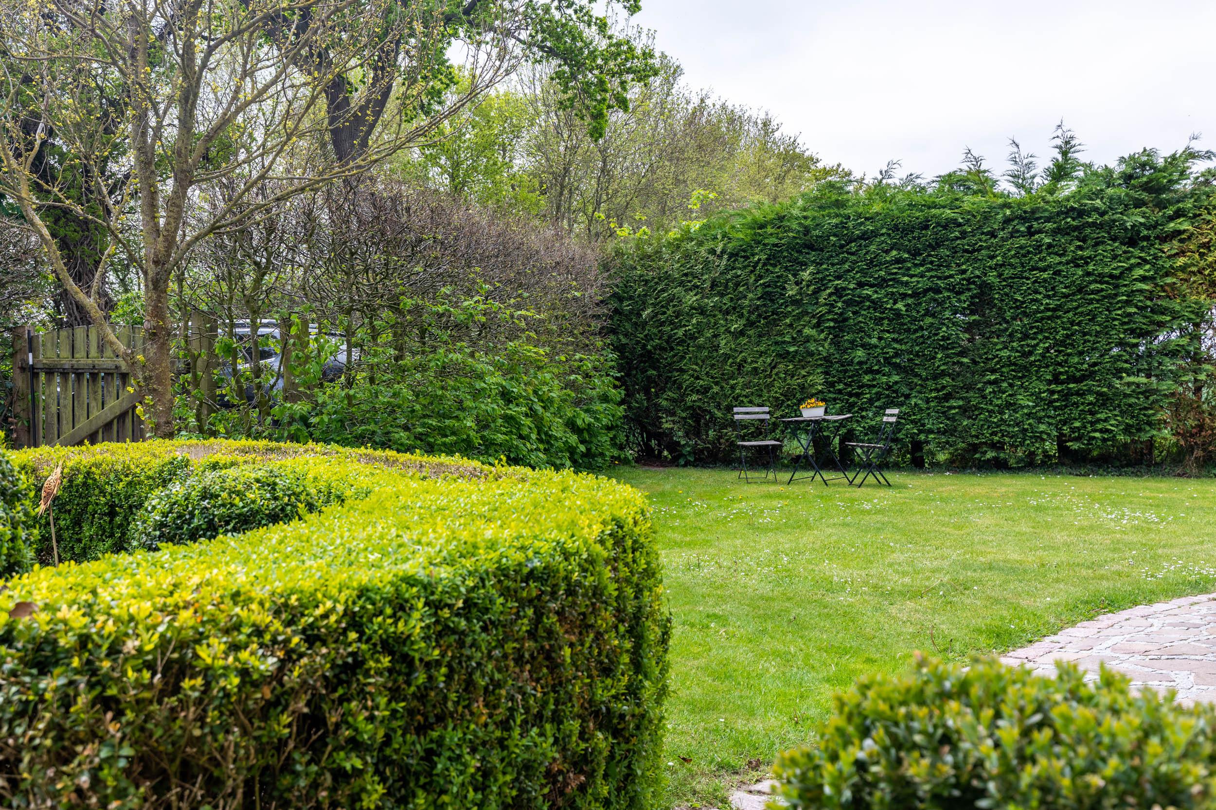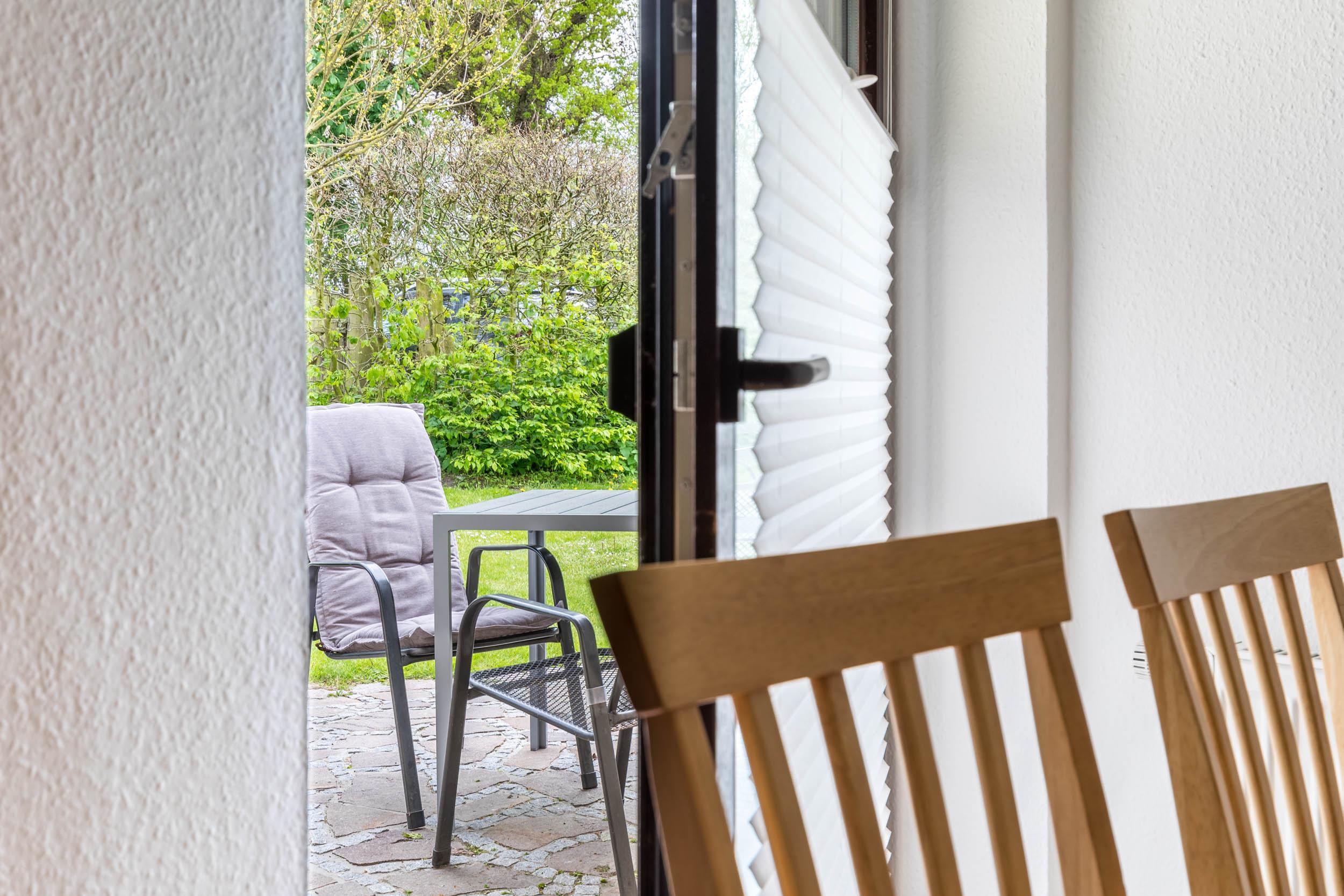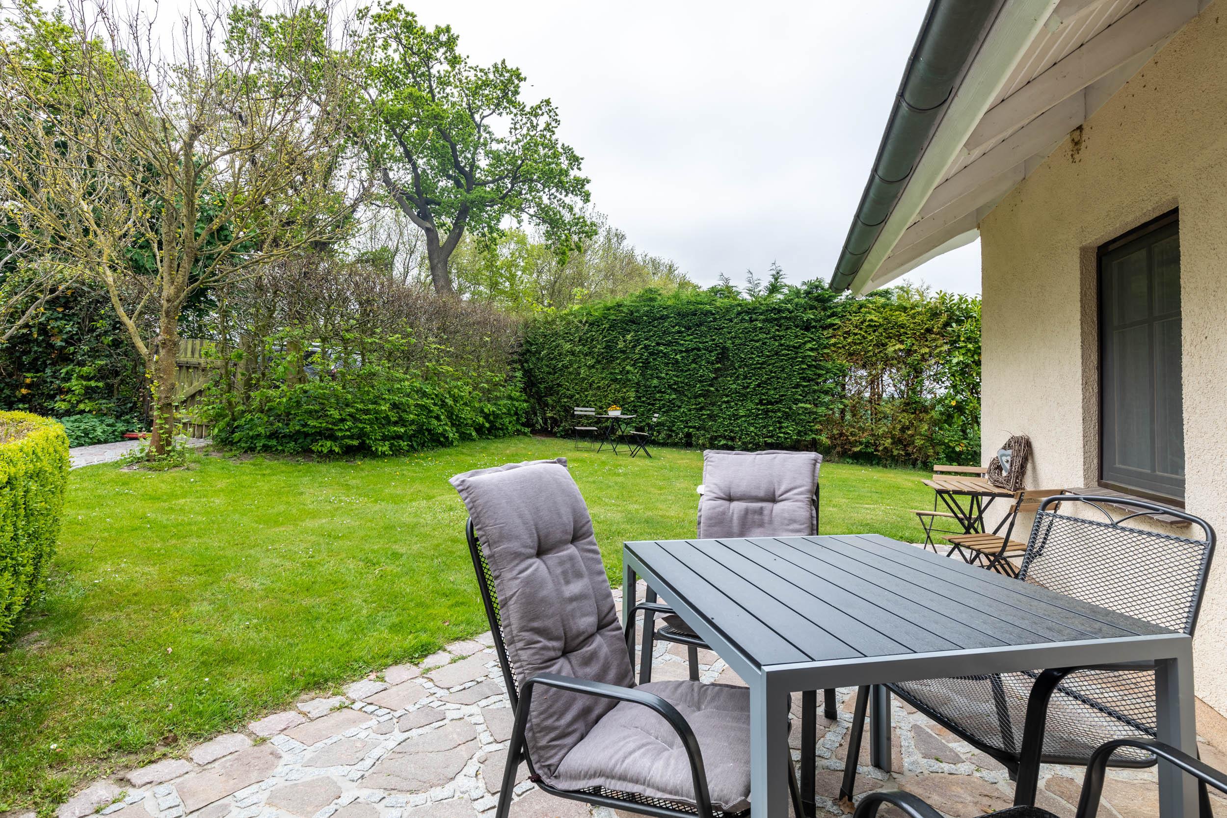 Vom Essbereich aus können Sie auf die möblierte Südost-Terrasse gelangen. Das schöne begrünte Grundstück des Hauses ist eingezäunt, z.T. durch Hecke, z.T. durch Zaun. Hier können Sie entspannt Ihren Urlaub genießen, das Grundstück grenzt an ein Feld.