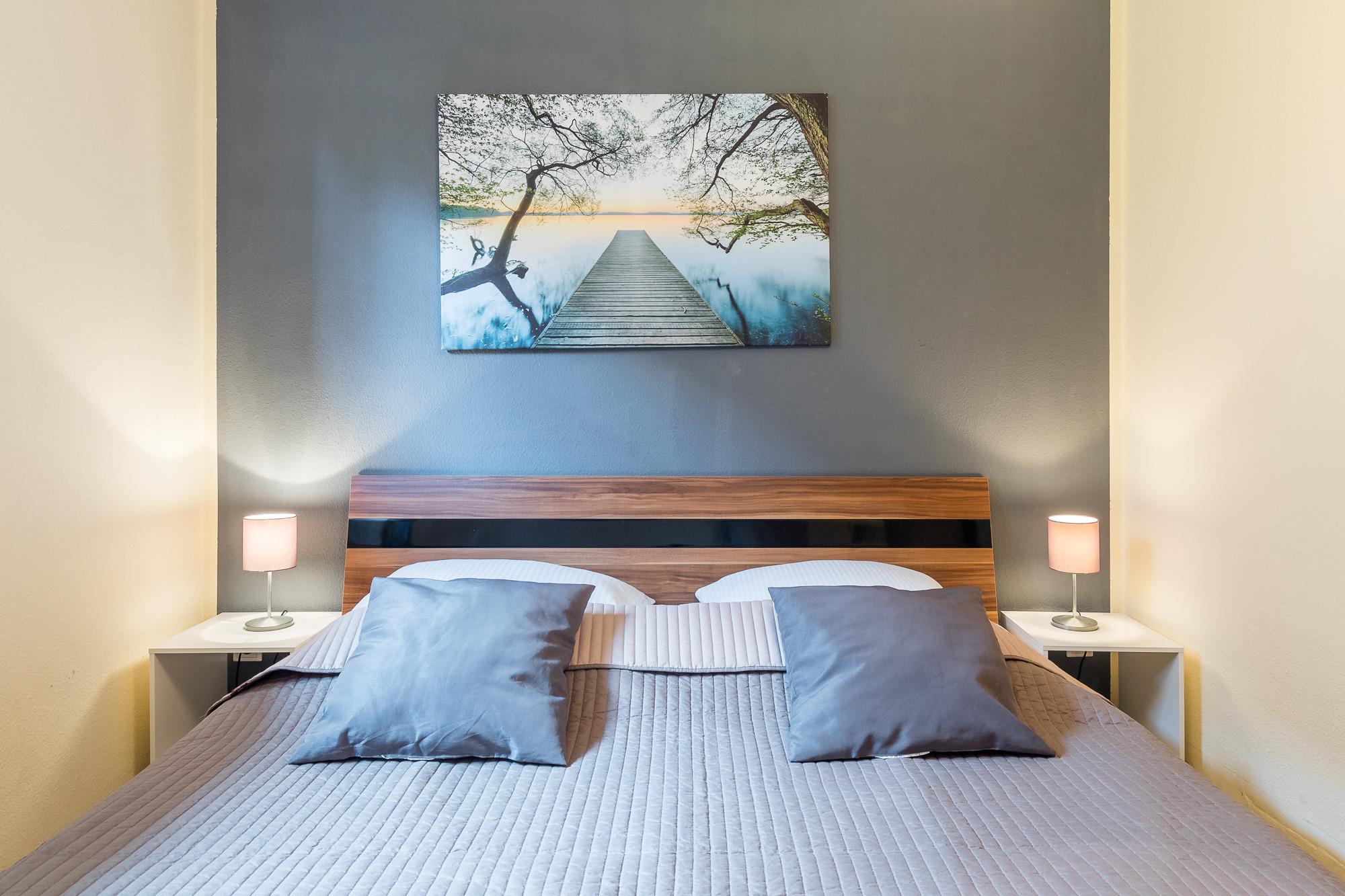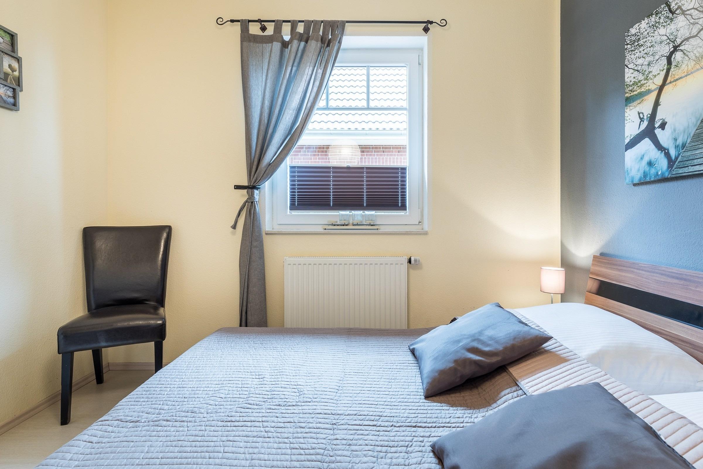 Das Schlafzimmer ist mit einem bequemen Doppelbett und einem großen Kleiderschrank eingerichtet.