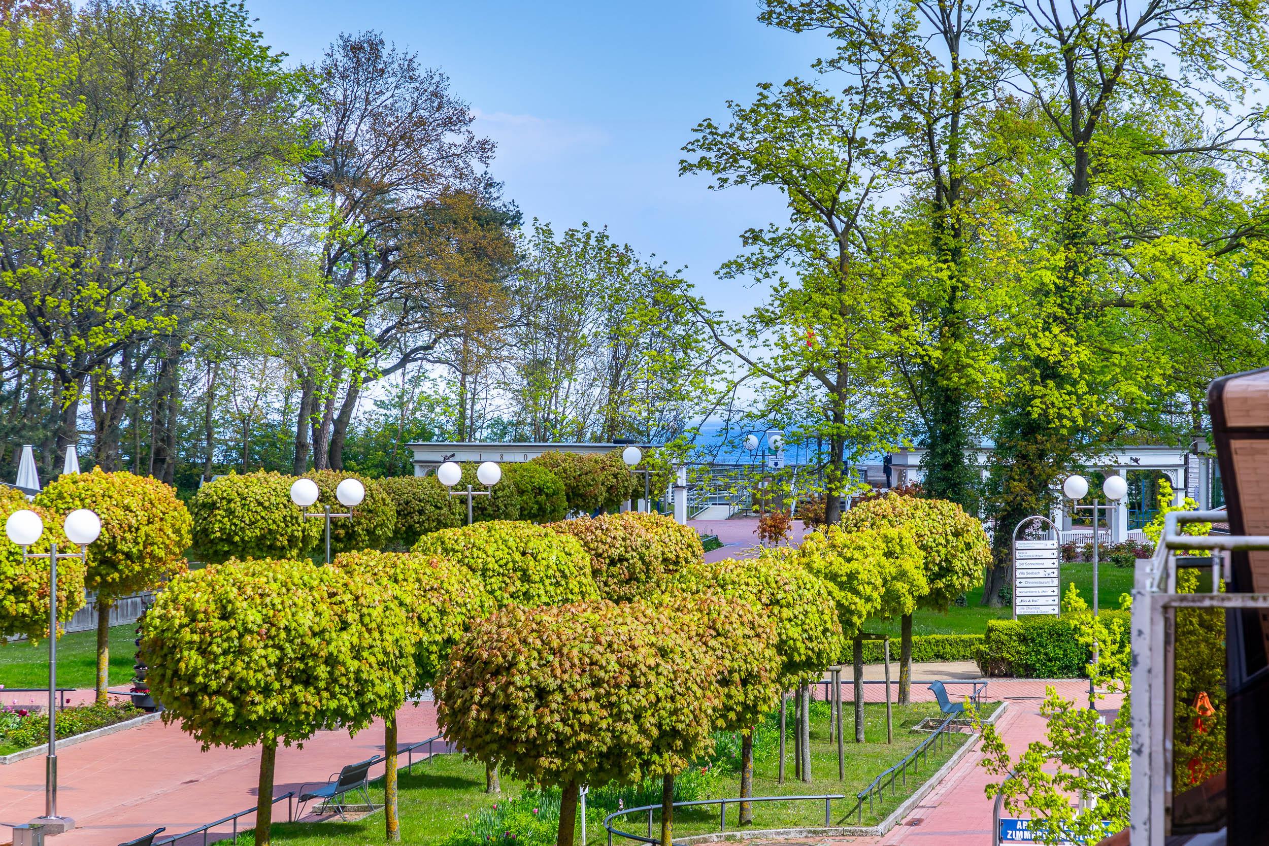 Wenn Sie ungestört in der Sonne baden oder Ihr Mahl an frischer Luft mit grünem Ausblick zu sich nehmen möchten, ist der möblierte Nordwest-Balkon mit seitlichem Blick zur Seebrücke der Ferienwohnung genau der richtige Platz dafür. Im Winter können Sie sogar bis zur Ostsee blicken.