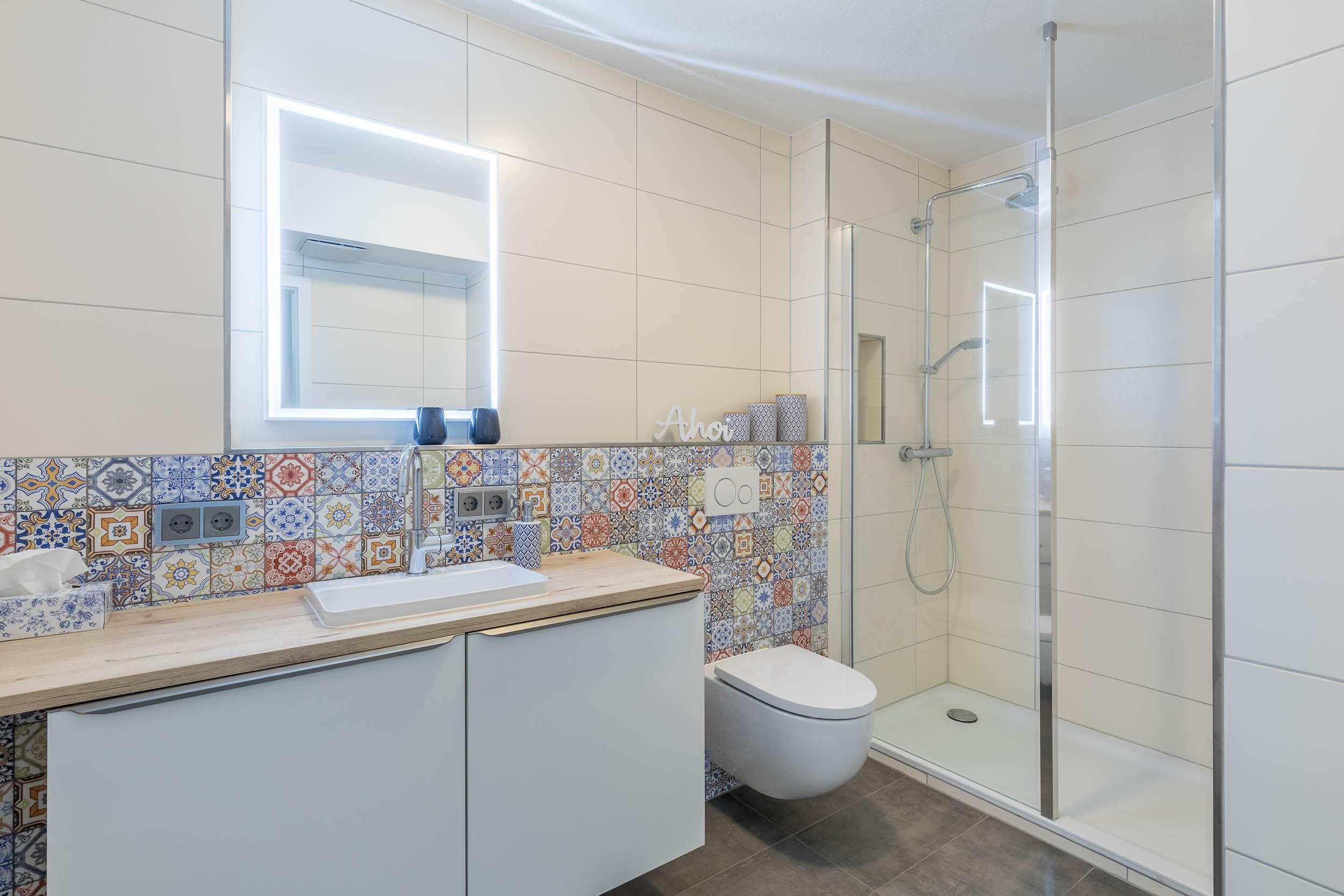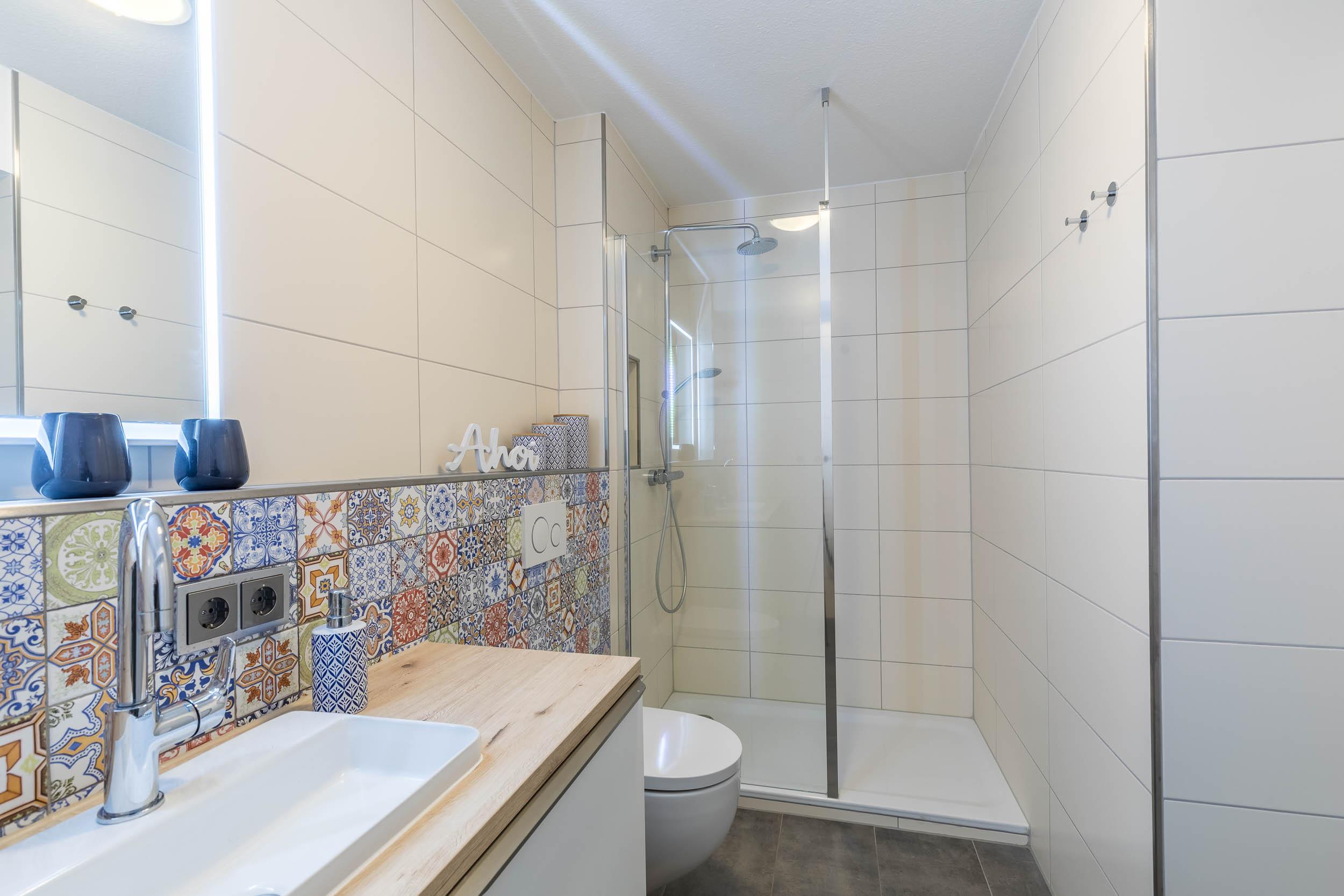 Im hellen, exklusiv gefliesten Badezimmer finden Sie einen schönen Waschtisch, WC sowie Dusche vor. Eine Handtuchheizung sorgt zusätzlich für wohlige Wärme im Bad.