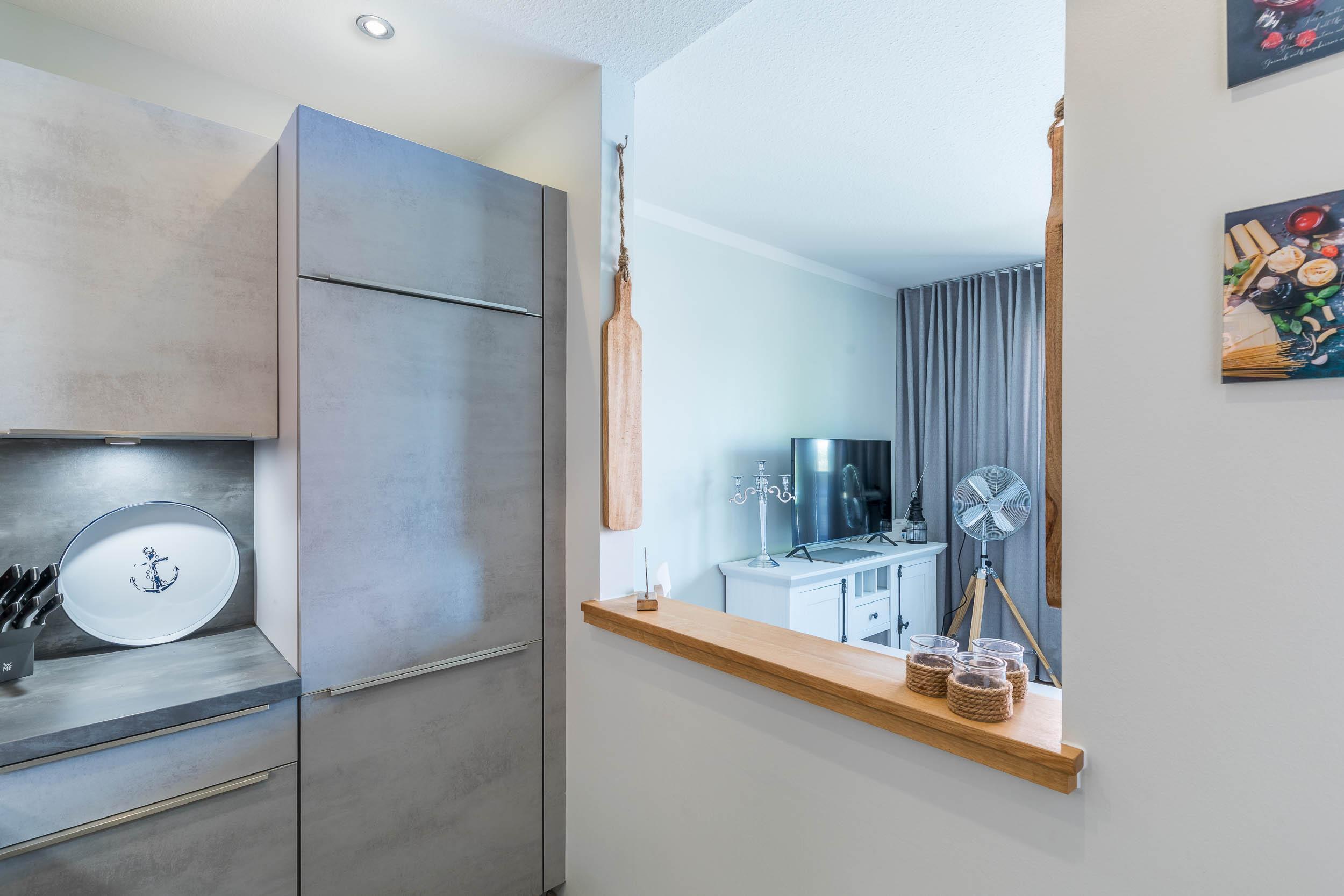 Die moderne, halboffene Küchenzeile bietet eine tolle Ausstattung für Ihre Selbstverpflegung. So finden Sie neben Cerankochfeld, Backofen, Geschirrspüler, Mikrowelle natürlich auch einen Kühlschrank mit Gefrierfach, Kaffeemaschine, Wasserkocher uvm.