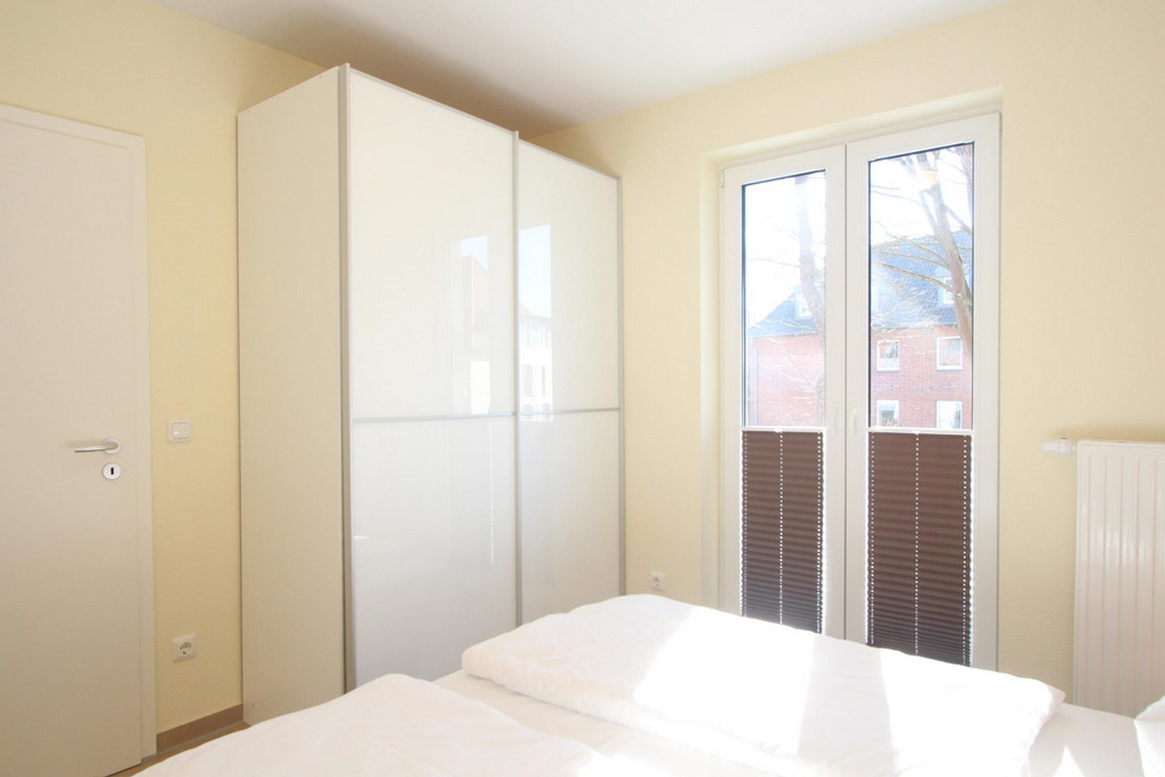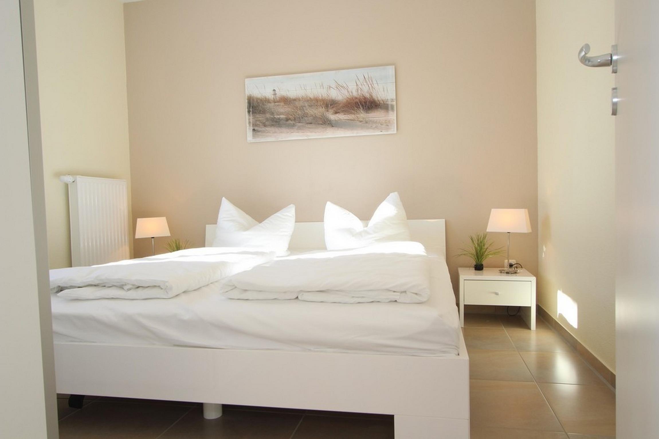 In dieser Wohnung gibt es zwei Schlafzimmer: Das erste Schlafzimmer (180x200cm) verfügt über ein Doppelbett und über einen Kleiderschrank. Das Gäste-/ Kinderzimmer ist mit zwei Einzelbetten (je 90x200cm) möbliert.