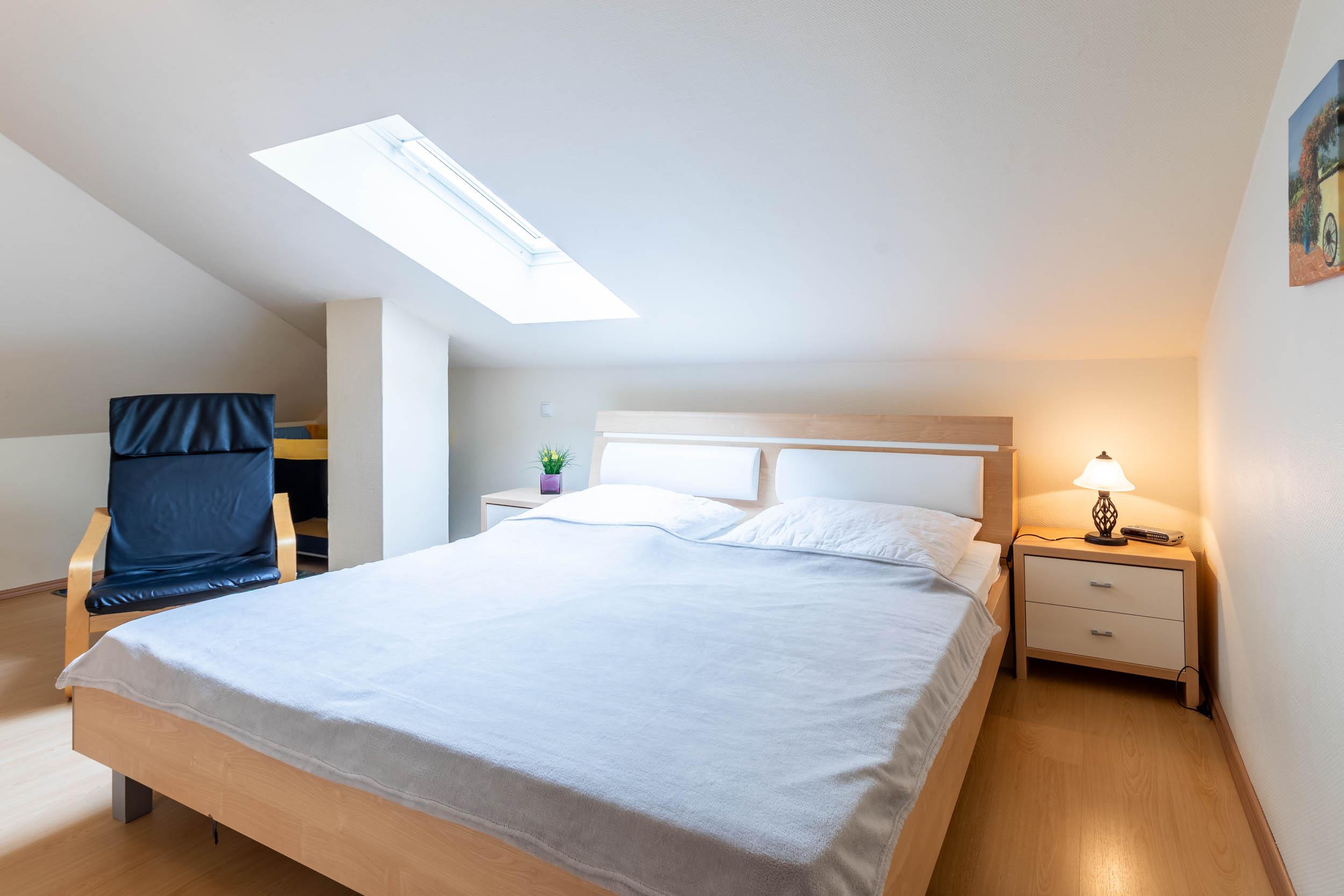 Sowohl das Schlafzimmer in der 1. Ebene als auch das 2. Schlafzimmer im DG der Wohnung bieten ein gemütliches Doppelbett (je 180x200cm) sowie einen Kleiderschrank.