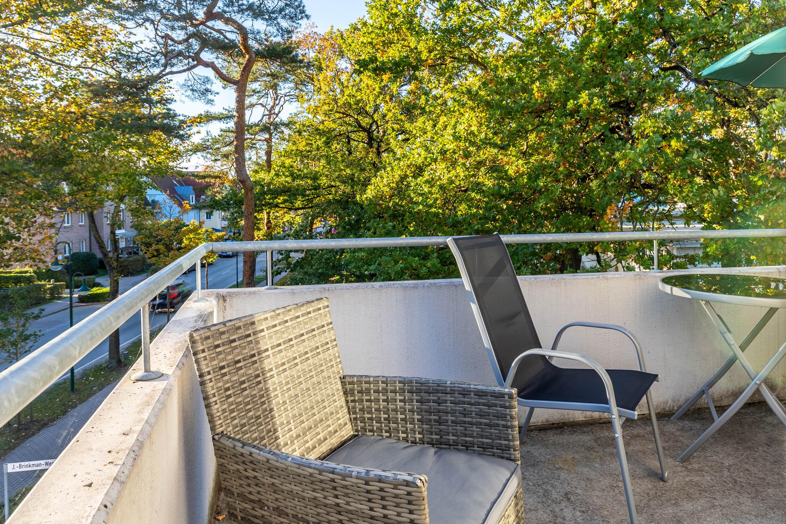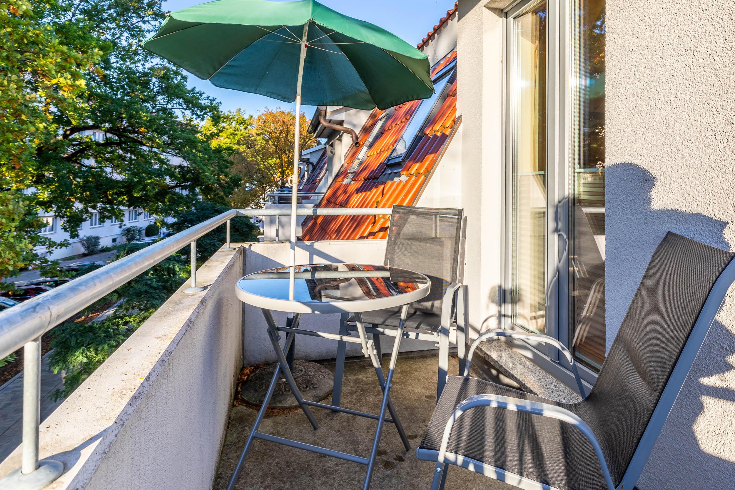 Über diesen Wohn- und Essbereich gelangen Sie auf den möblierten Südwest-Eckbalkon.