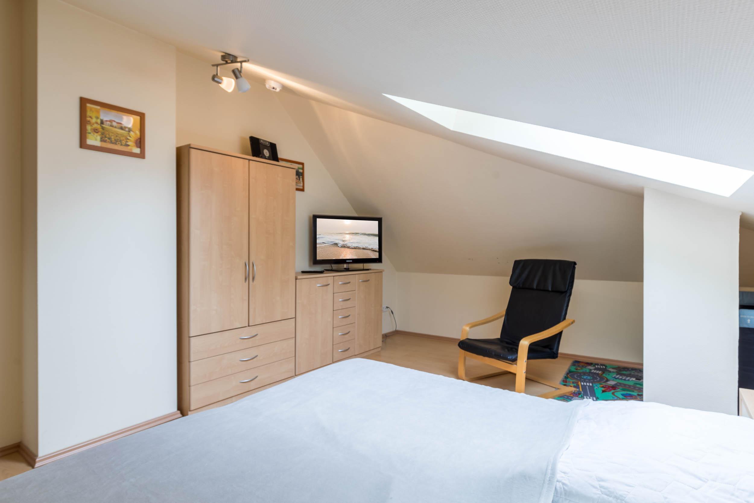 Das zweite Schlafzimmer im oberen Bereich (DG) ist zudem mit einem weiteren Fernseher ausgestattet. Hier lässt sich z.B. auch bequem das Reisebettchen aufstellen.