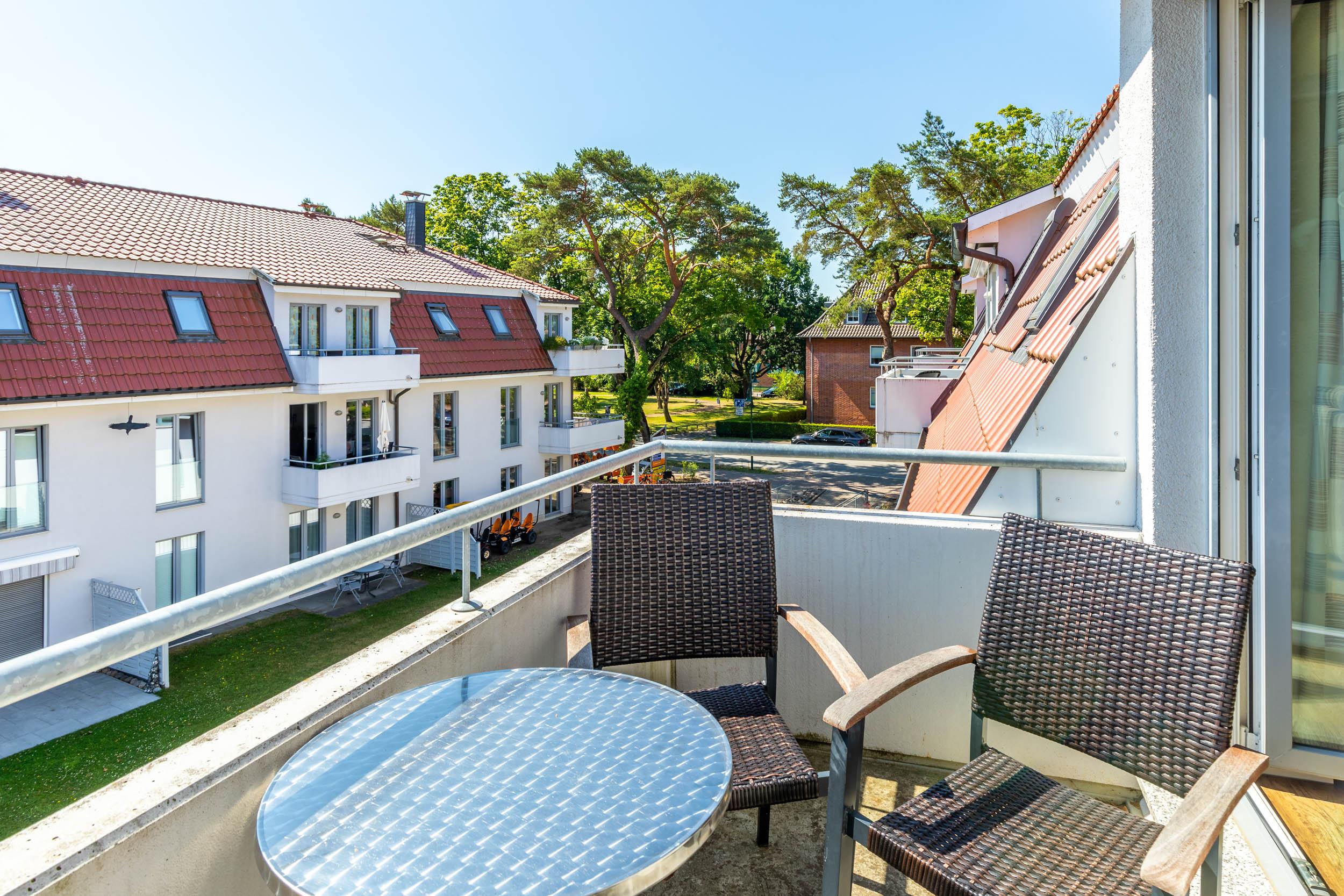 Nutzen Sie den möblierten Nordost-Balkon, welchen Sie vom Wohnzimmer aus begehen können, um die frische Ostseelust genießen zu können.