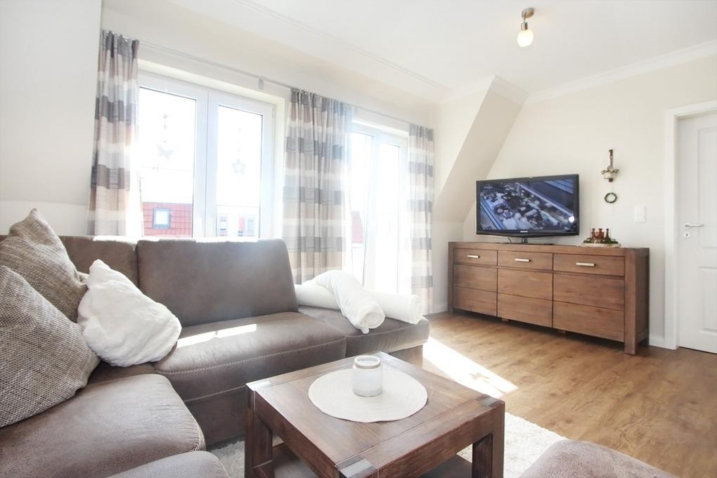 In einem rundum geschmackvollen Ambiente genießen die Gäste zeitgemäßen Komfort. Der offene Wohn- und Essbereich in der 1. Wohnebene enthält u.a. eine hervorragend bestückte Küchenzeile sowie eine strapazierfähige Polsterlandschaft, die zu gemütlichen Gesprächsrunden und entspannenden Lesestunden einlädt. Für Unterhaltung sorgen hier ein großer moderner Flatscreen SAT-TV und ein DVD-Player.