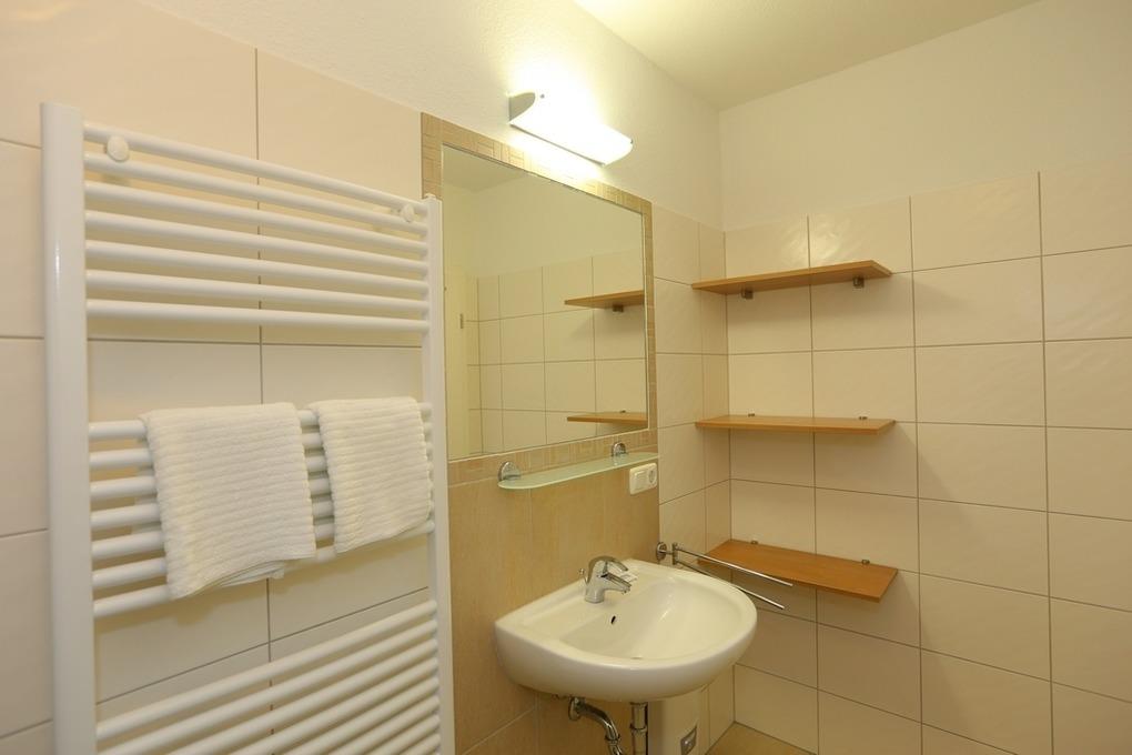 Im praktischen Bad mit ebenerdiger Dusche befinden sich auch eine Waschmaschine und ein Handtuchtrockner.