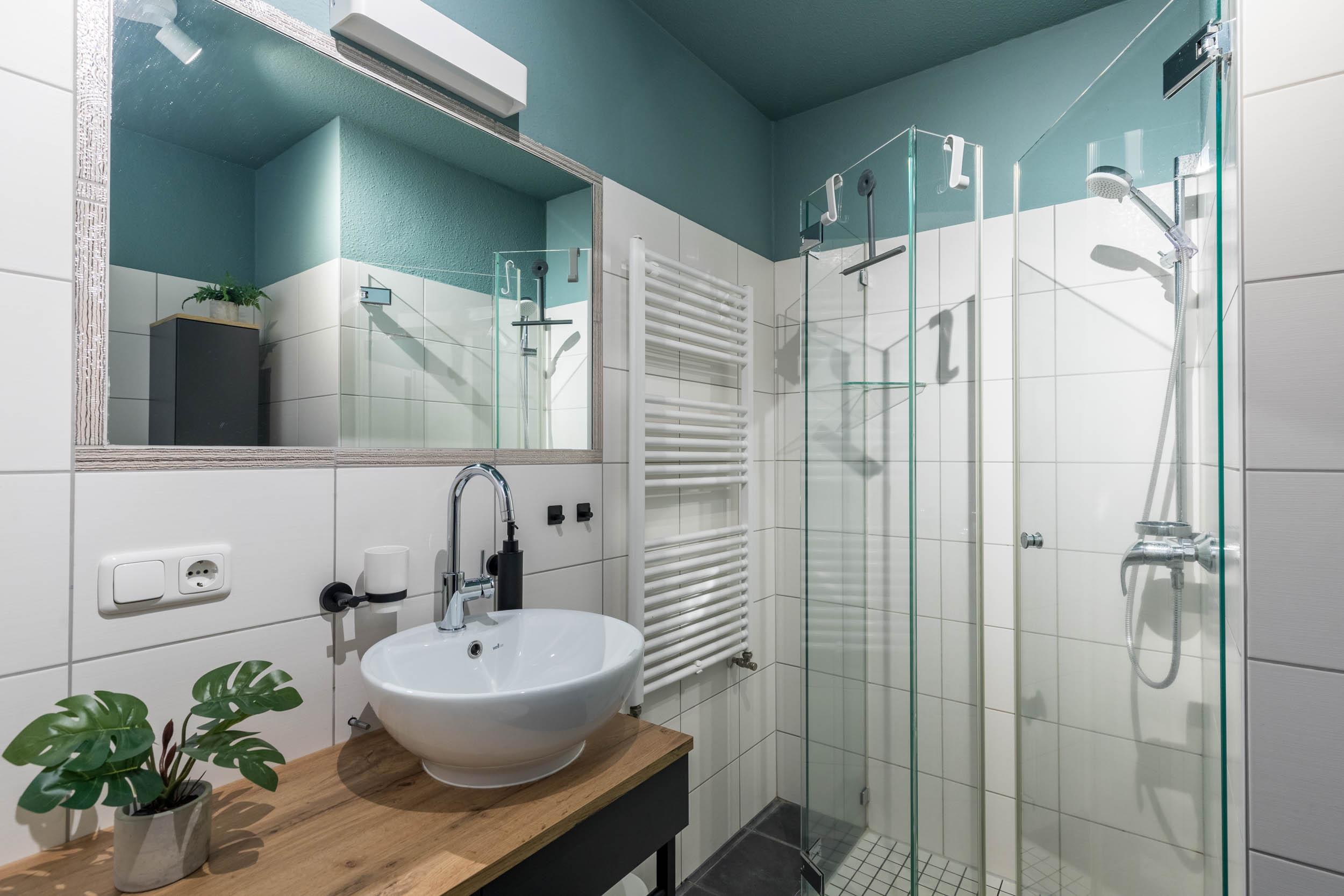 Das moderne Bad bietet eine ebenerdiger Dusche, WC, Fön und Handtuchtrockner.