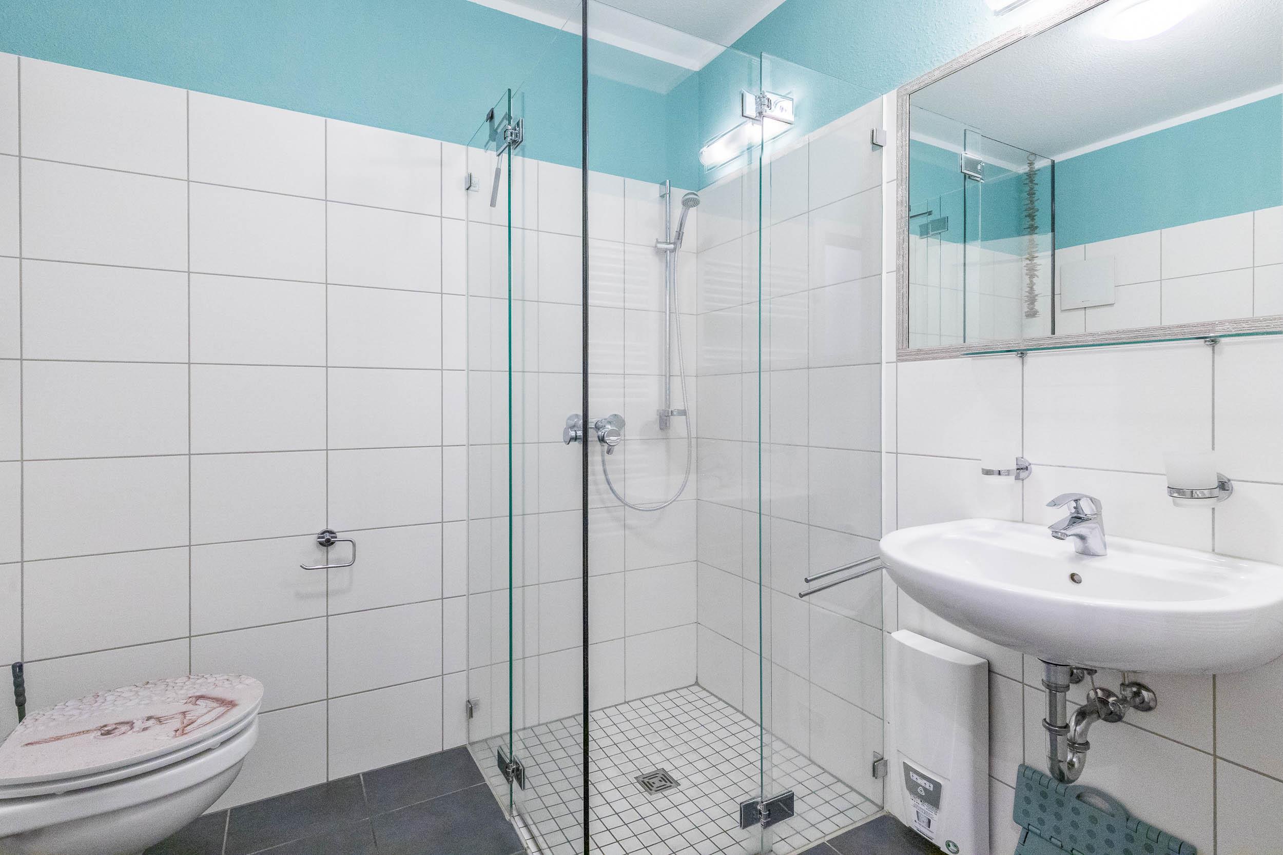 Das moderne Bad ist mit einer ebenerdigen Dusche, WC, Föhn und Radio ausgestattet. Die Fußbodenheizung und der Handtuchtrockner sorgen für wohlige Wärme.