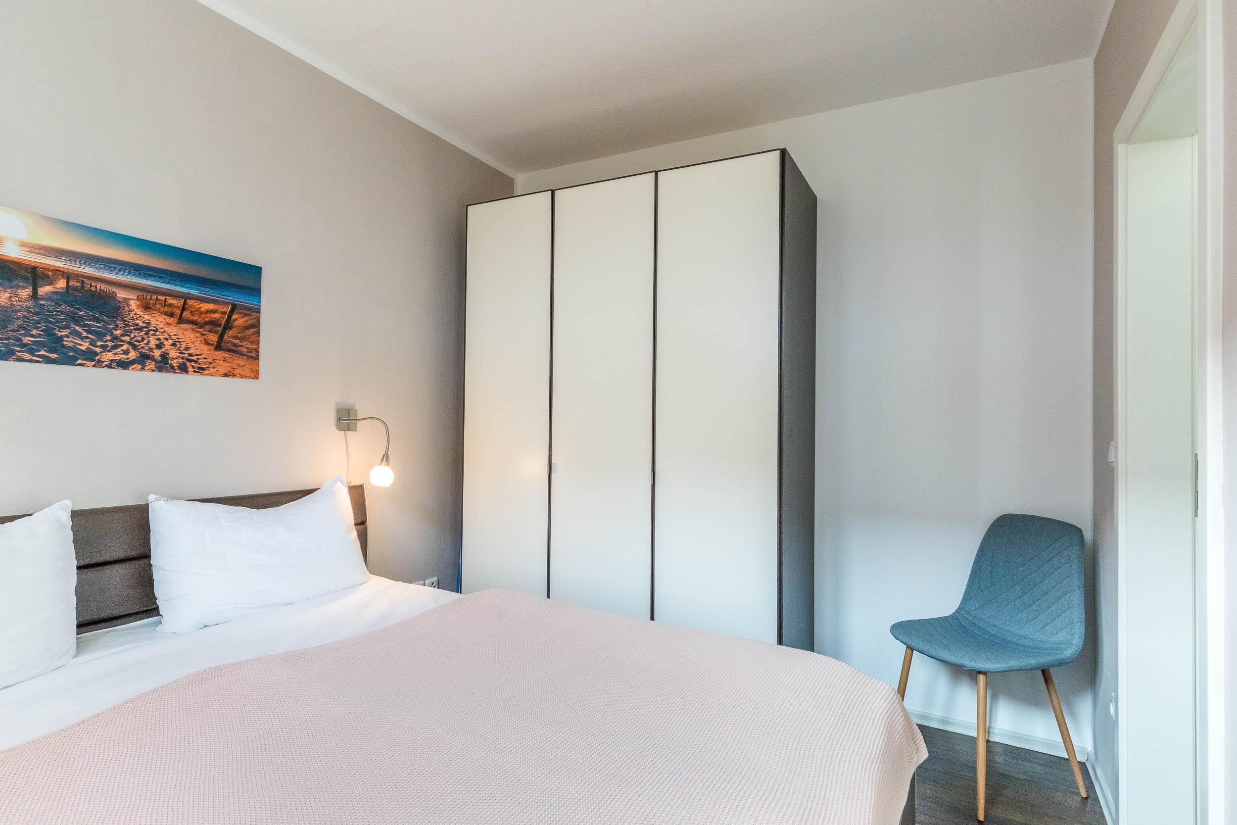 Das Schlafzimmer mit dem gemütlichen Doppelbett (mit Topper für extra Komfort) und dem geräumigen Kleiderschrank verspricht erholsame Nächte.