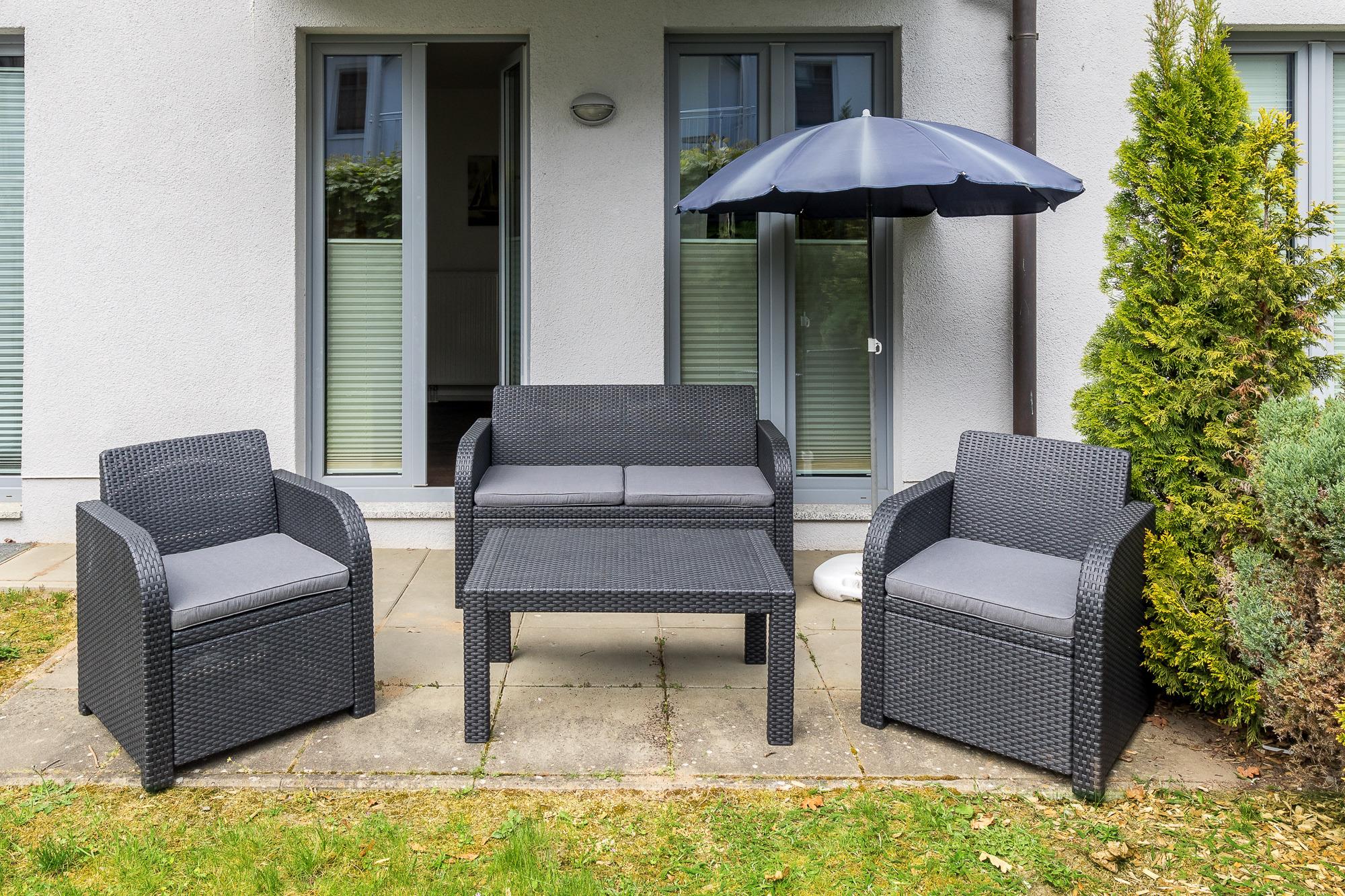 Die einladende Terrasse, direkt vom Wohnzimmer aus zugänglich, ist mit Tisch, Stühlen und gemütlichen Loungemöbeln ausgestattet. Genießen Sie hier die Sonne, entspannen Sie bei einem Glas Wein oder lassen Sie den Abend mit einem gemütlichen Grillabend ausklingen.