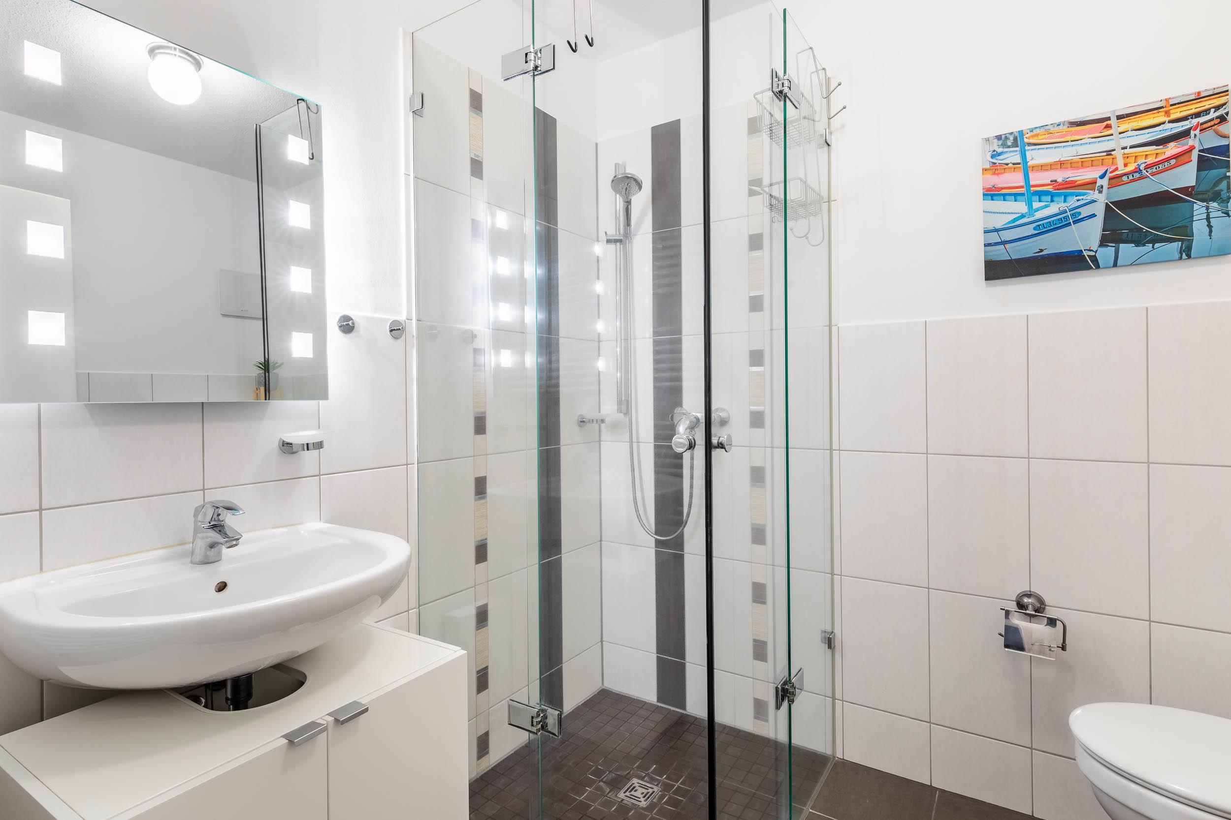 Das Bad ist mit der bodengleichen Dusche seniorengerecht. Auch steht Ihnen hier eine kostenfreie Waschmaschine zur Verfügung. Weitere bereitgestellte Haushaltsgegenstände sind Wäscheständer und Staubsauger.