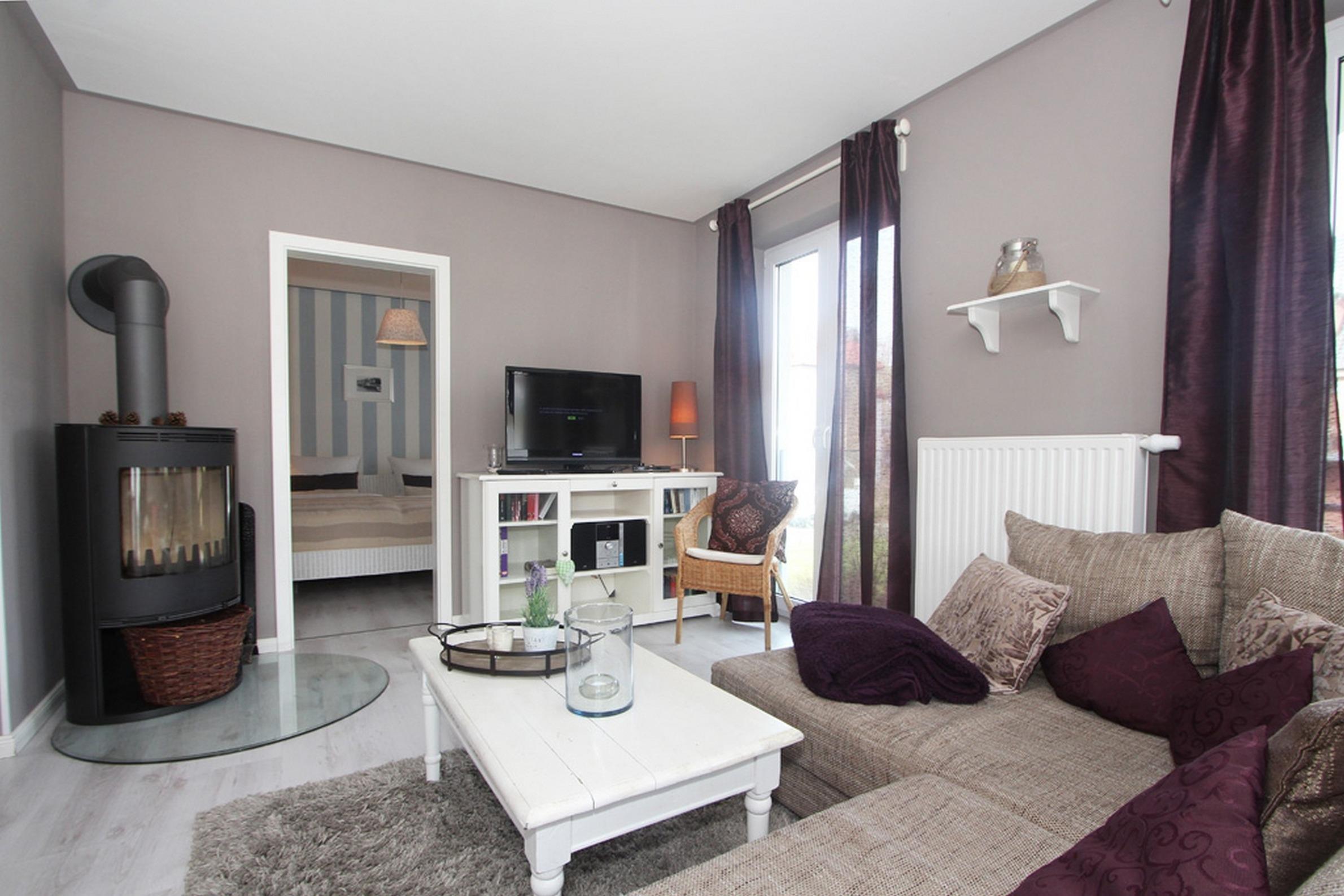 Im Wohnbereich gibt es neben dem schönen Kamin ein Ecksofa sowie ein TV-Gerät mit Flatscreen. Von hier ist auch der Gang auf den möblierten Balkon, der einen Blick auf den Garten erlaubt, möglich.