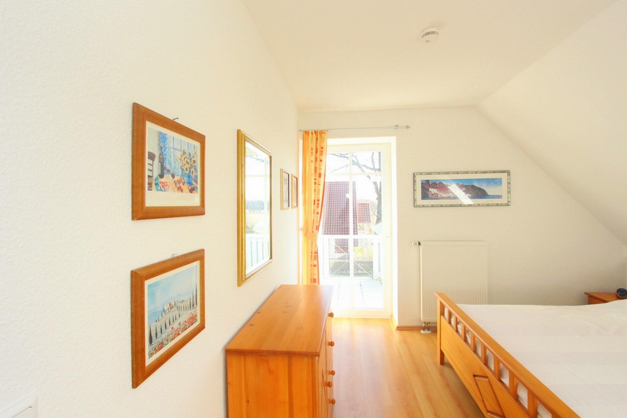 Das separate Schlafzimmer auf dieser Etage mit Doppelbett und einem großen Einbaukleiderschrank ist hell und freundlich möbliert.