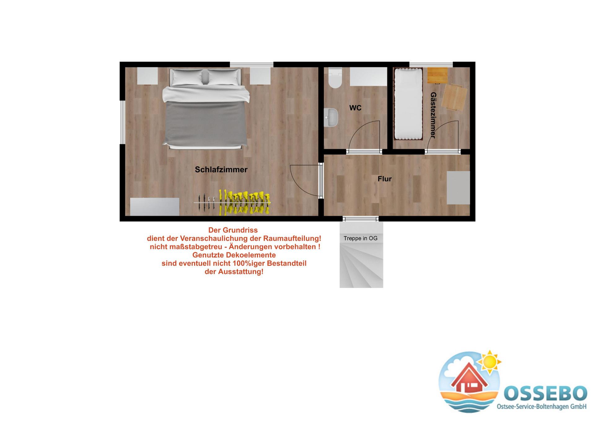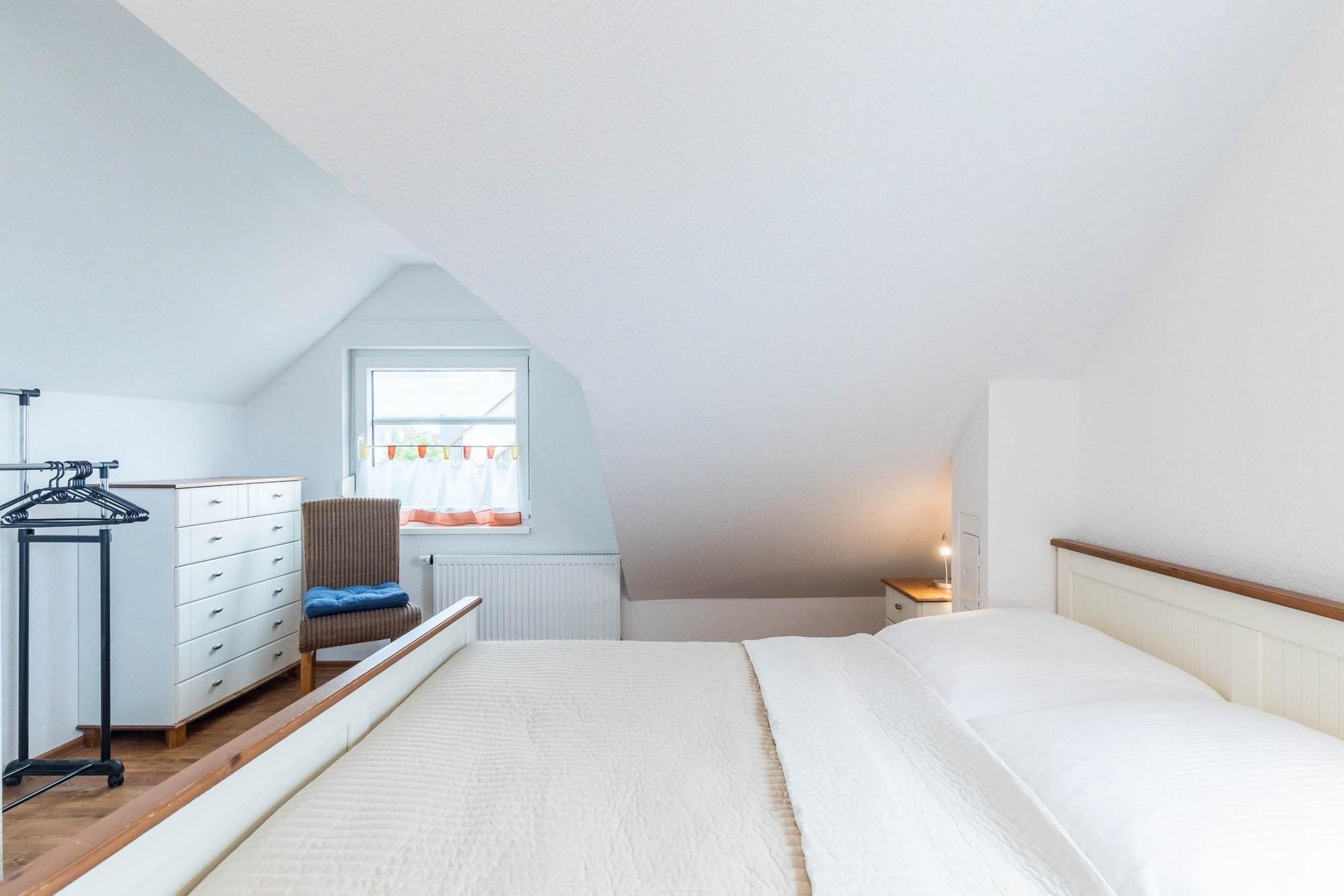 Die 2. Ebene (im DG) beherbergt neben einem Schlafzimmer mit Doppelbett einen zusätzlichen Schlafraum mit einem Einzelbett und zusätzlich ausziehbarem 2. Bett sowie ein Gäste-WC.