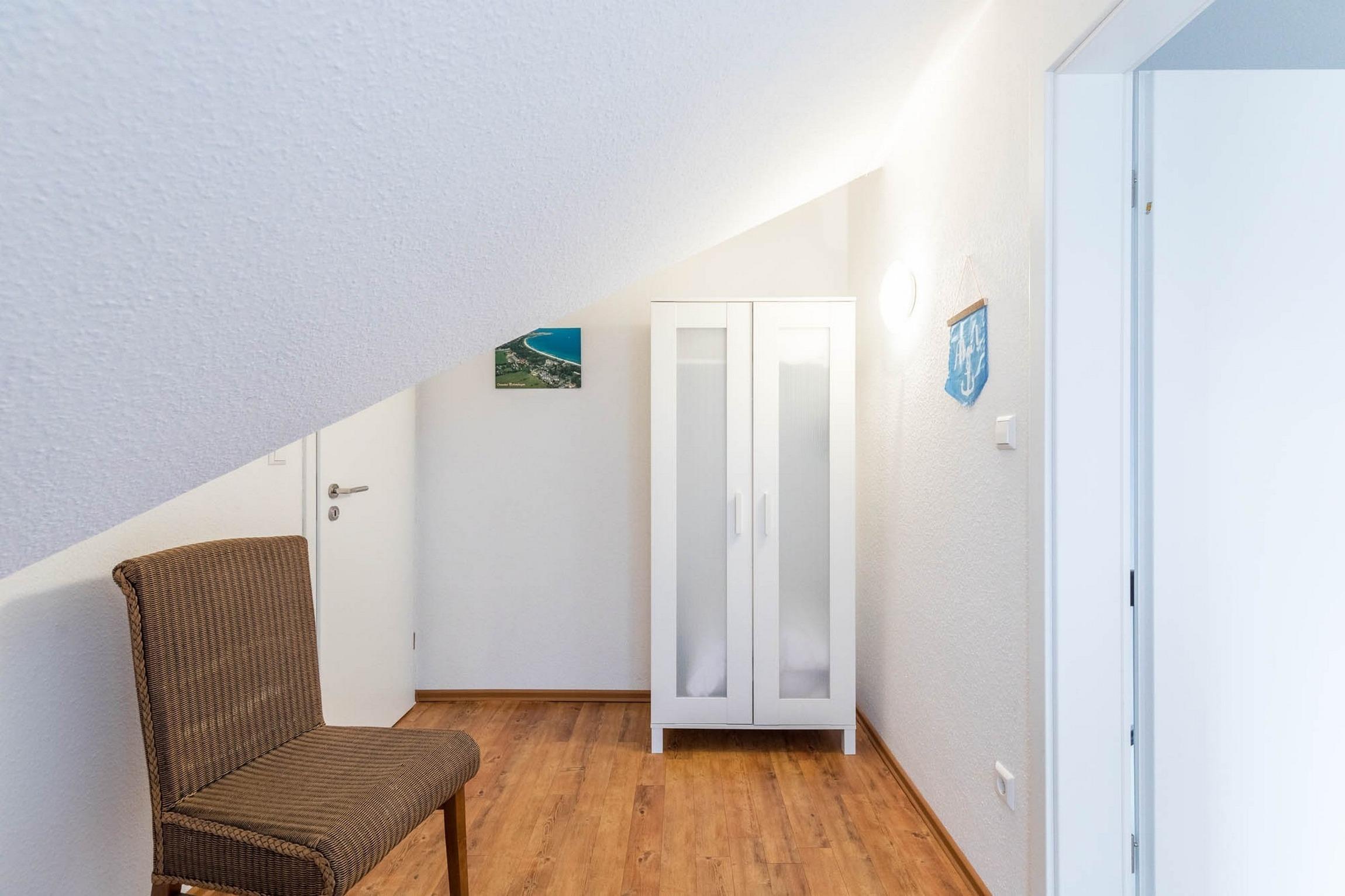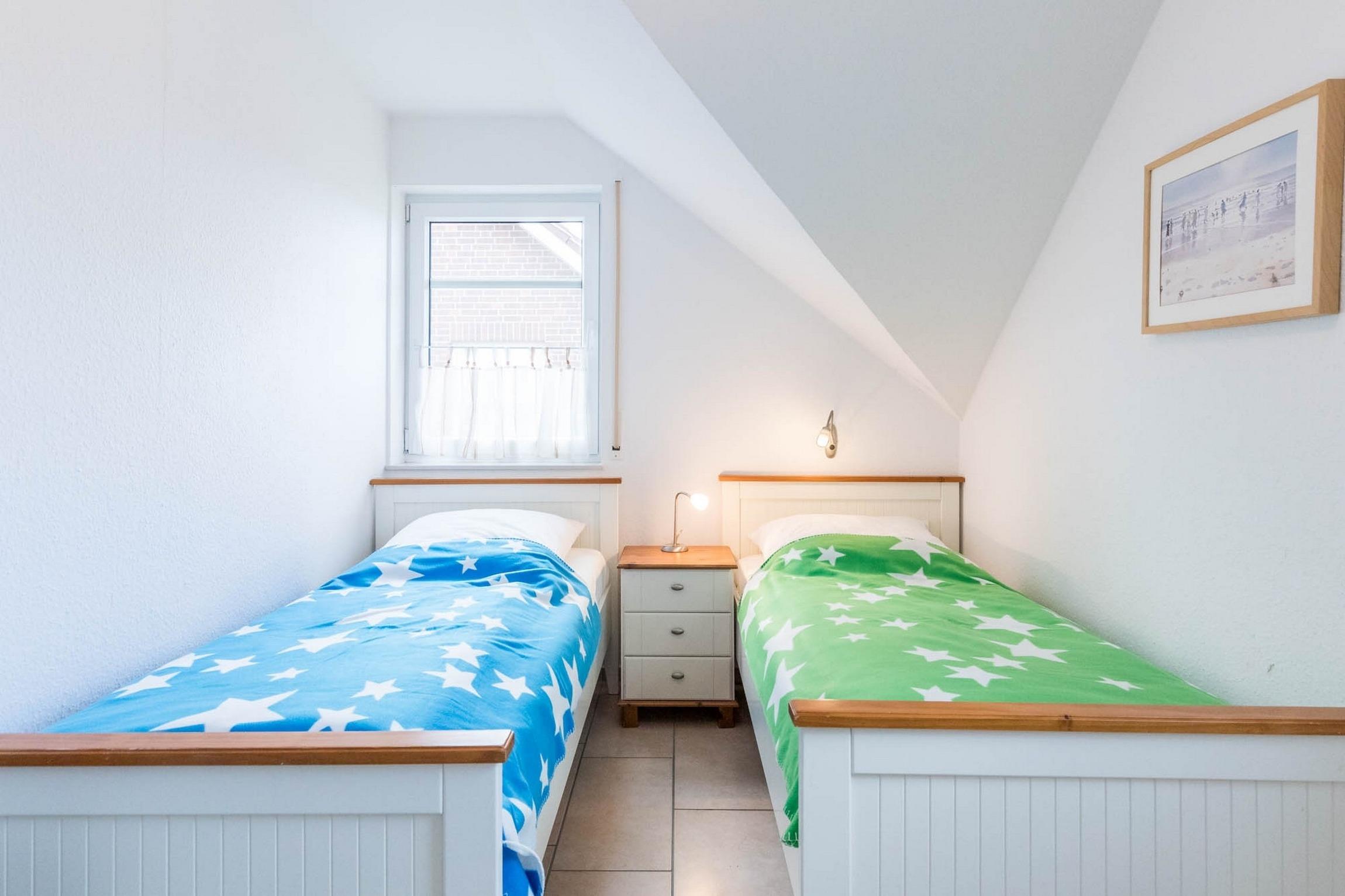 Ebenso befindet sich auf dieser ersten Wohnebene bereits eines der insgesamt 3 Schlafzimmer. Hier stehen 2 Einzelbetten und ein Kleiderschrank für Sie bereit.