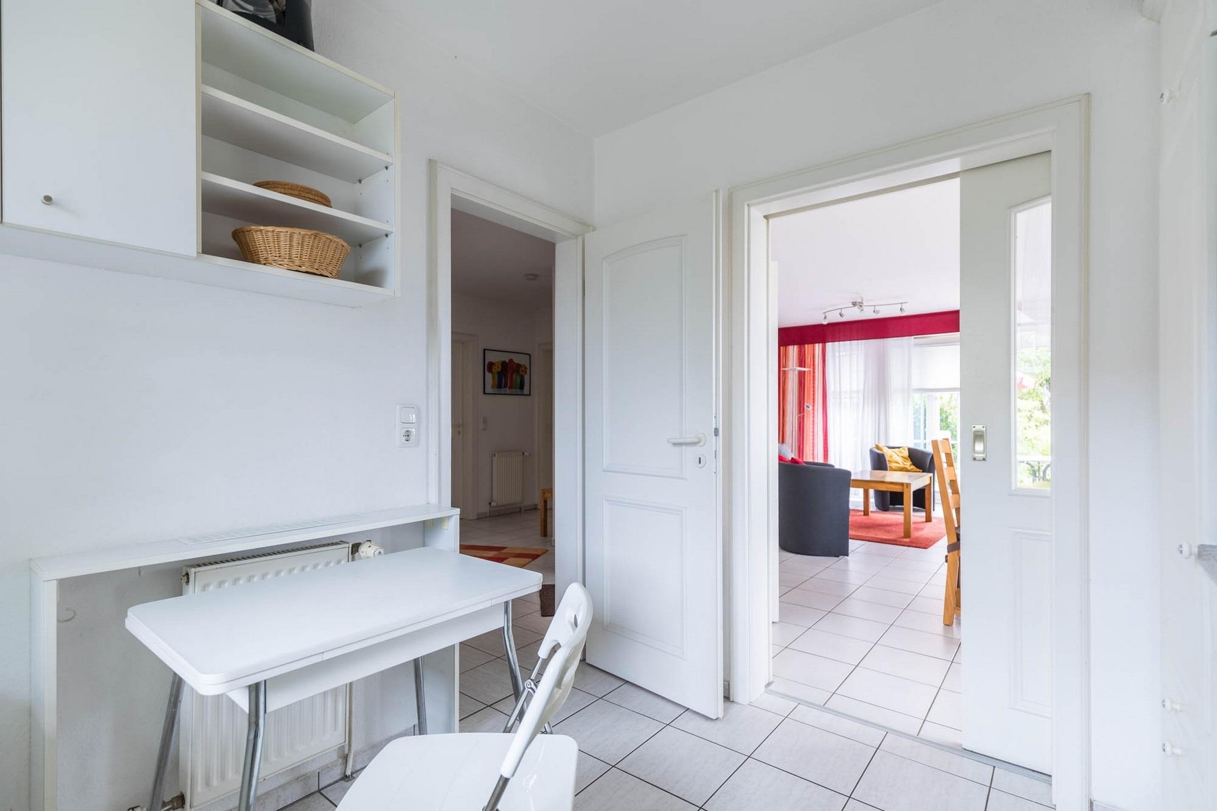 Die weiße Küche im Landhausstil ist mit allen Annehmlichkeiten und nützlichen Gerätschaften komplett ausgestattet. Am großen Esstisch finden 6 Personen Platz, bei Bedarf kann der Tisch noch vergrößert werden.