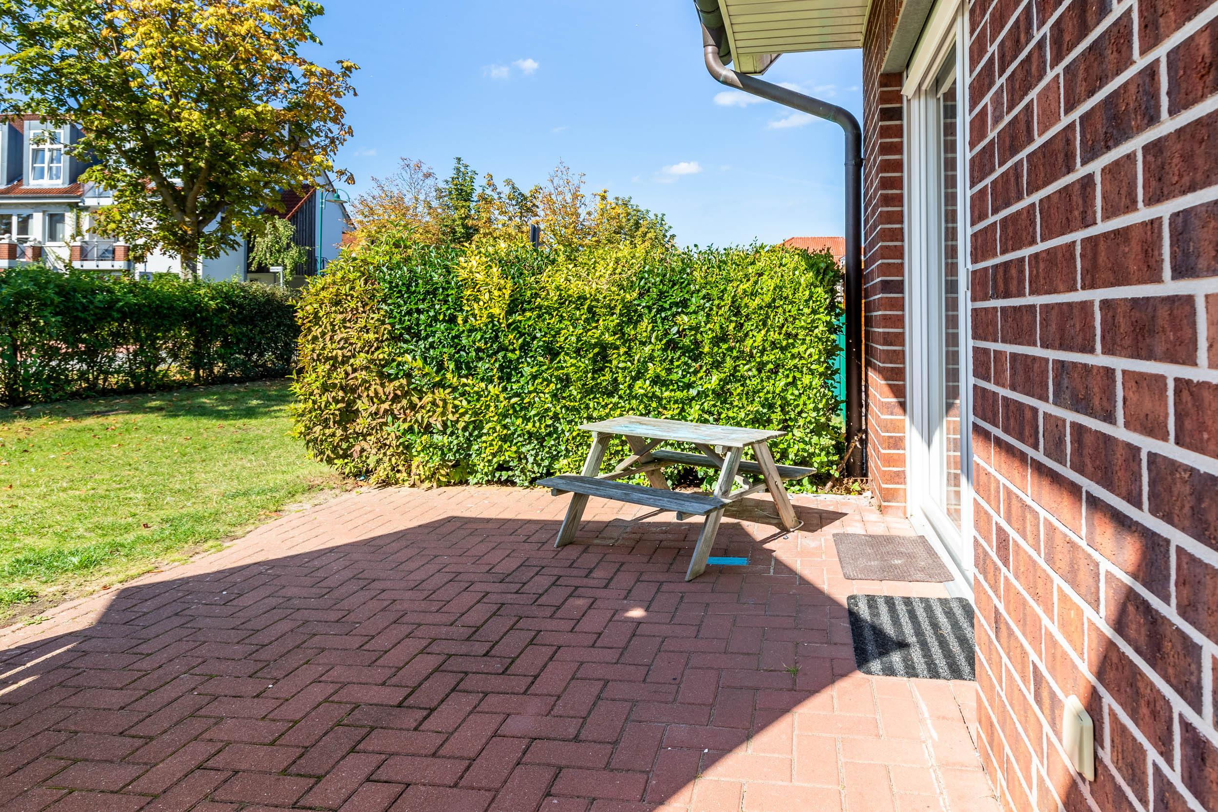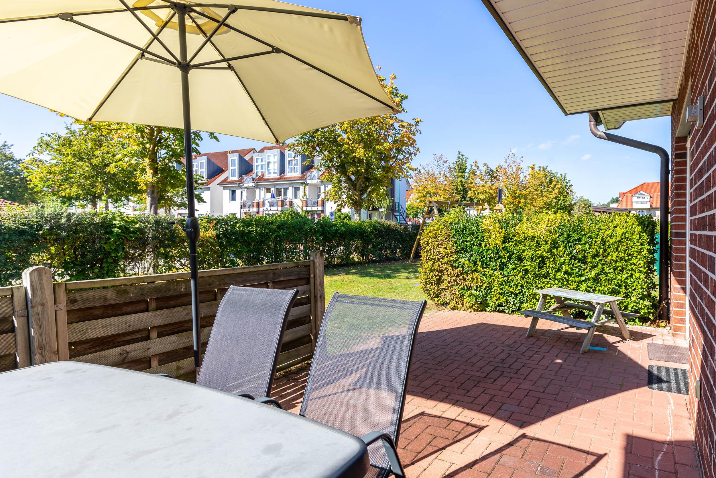 Die möblierte Südwest-Terrasse können Sie vom Wohnbereich aus erreichen. Eine kleine Hecke umrahmt den Gemeinschafts-Garten. Zusätzlich ist die möblierte Terrasse teilweise mit einem Sichtschutz zum Grundstück sowie einer Trennwand zur Nachbar-Terrasse aus Holz ausgestattet.