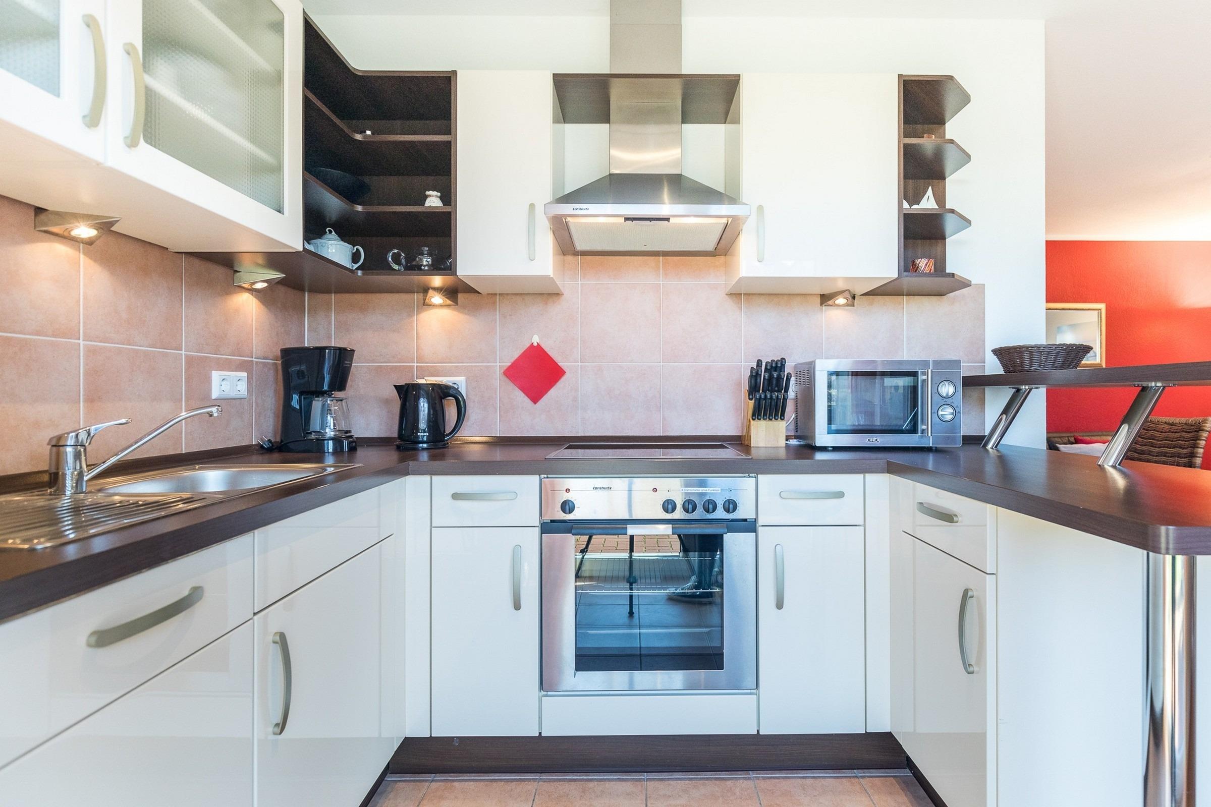 Die offene Küche beinhaltet neben einem Geschirrspüler und einer Mikrowelle viele weitere nützliche Geräte. Nehmen Sie Ihre Mahlzeiten bequem an der Essecke ein.