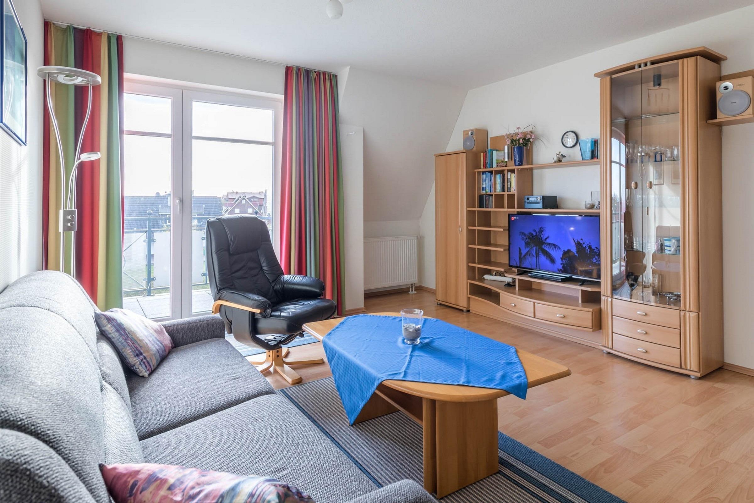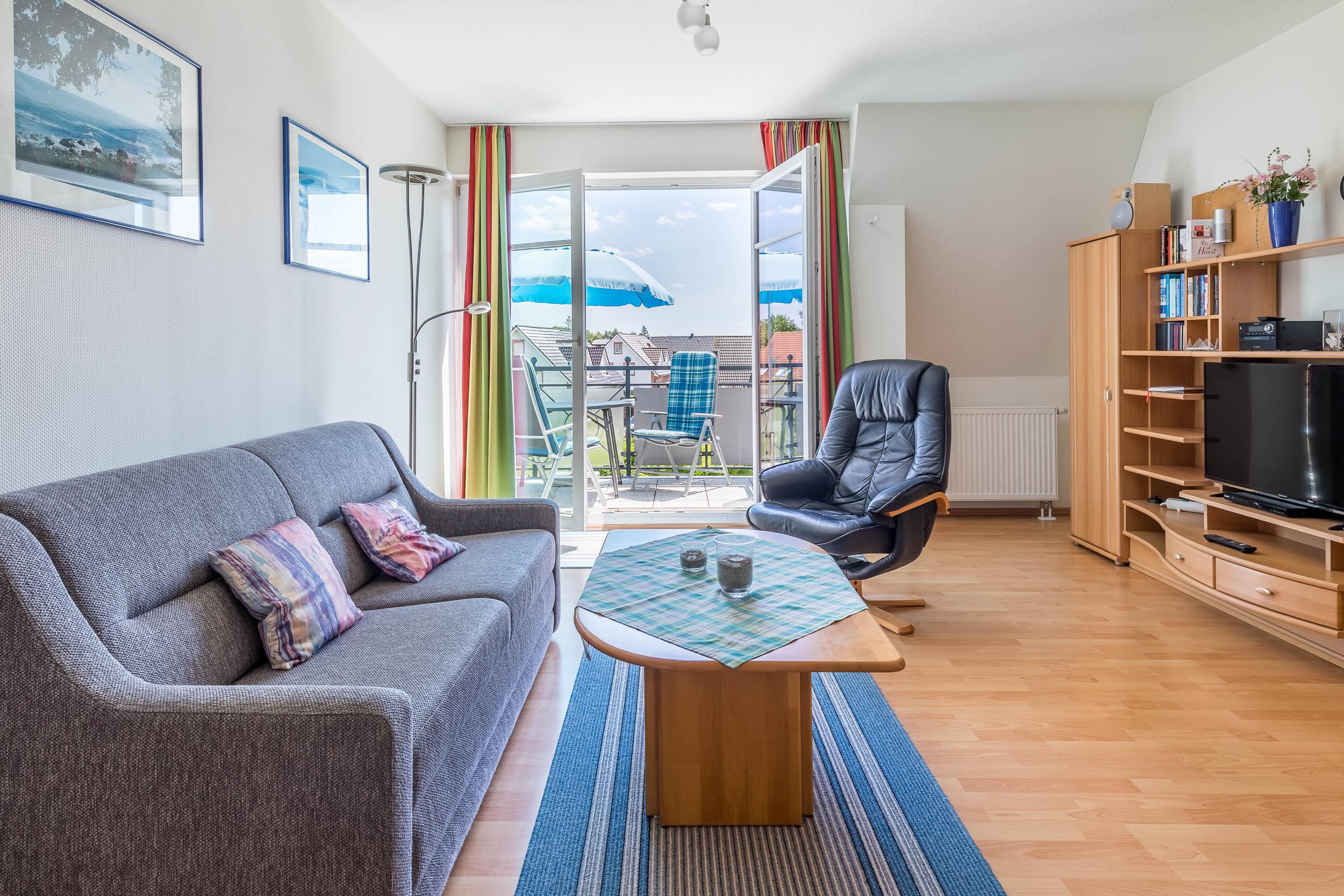 Sehr einladend ist der offen gestaltete Wohn- und Essbereich mit angrenzendem möbliertem Balkon. Flatscreen-TV, Stereoanlage und DVD-Player stehen für Sie bereit. Die ausziehbare Schlafcouch im Wohnbereich bietet Platz für zwei weitere Personen.