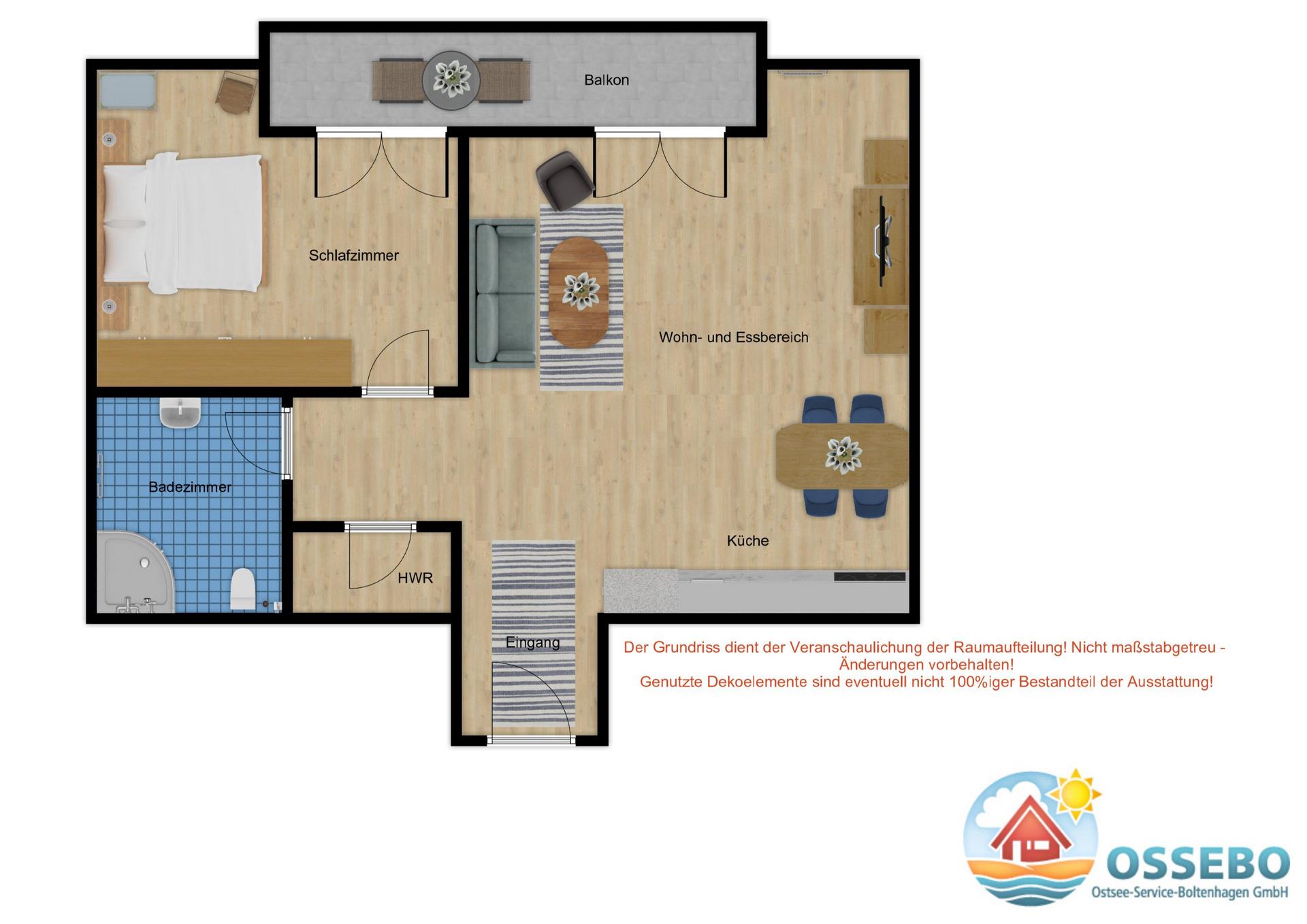Diese 2-Zimmer-Wohnung im 2. Obergeschoss (DG) bietet auf etwa 47qm Wohnfläche eine Ausstattung für 4 Personen + Kleinkind.