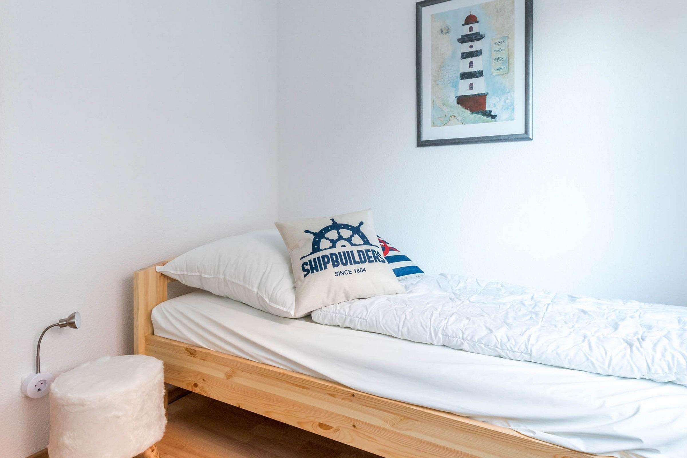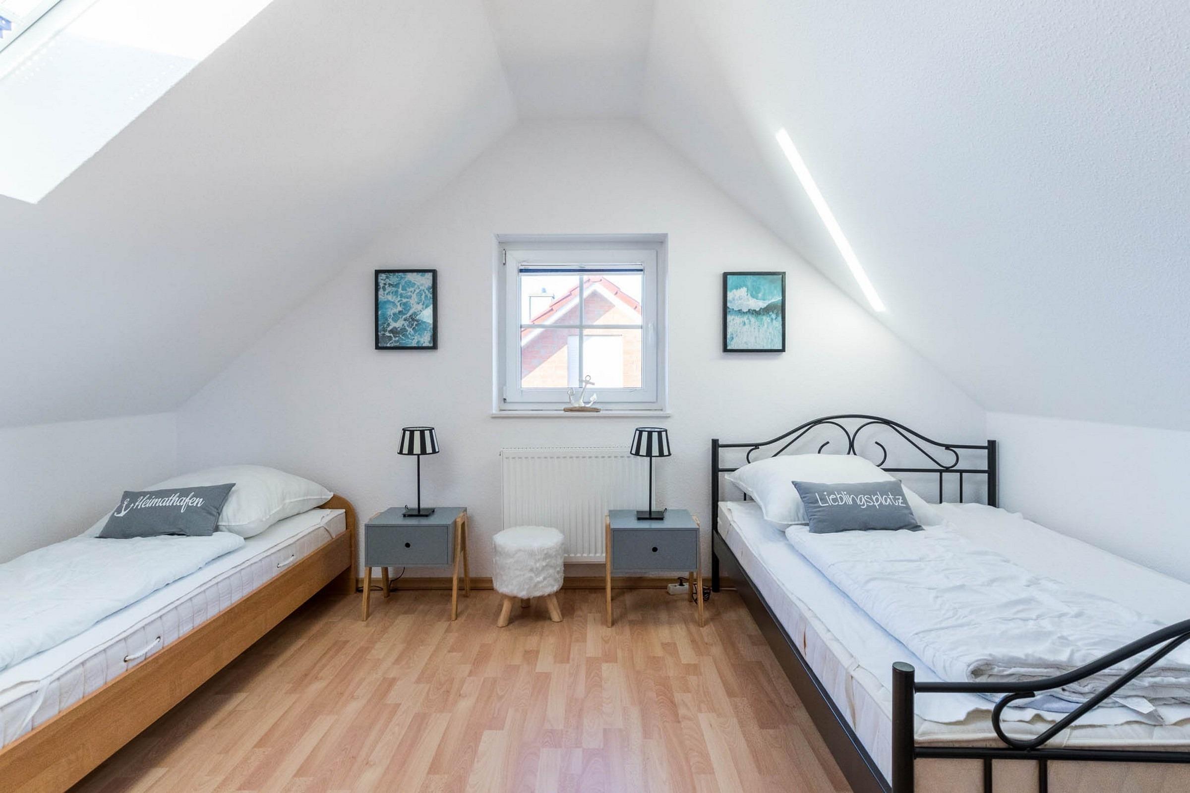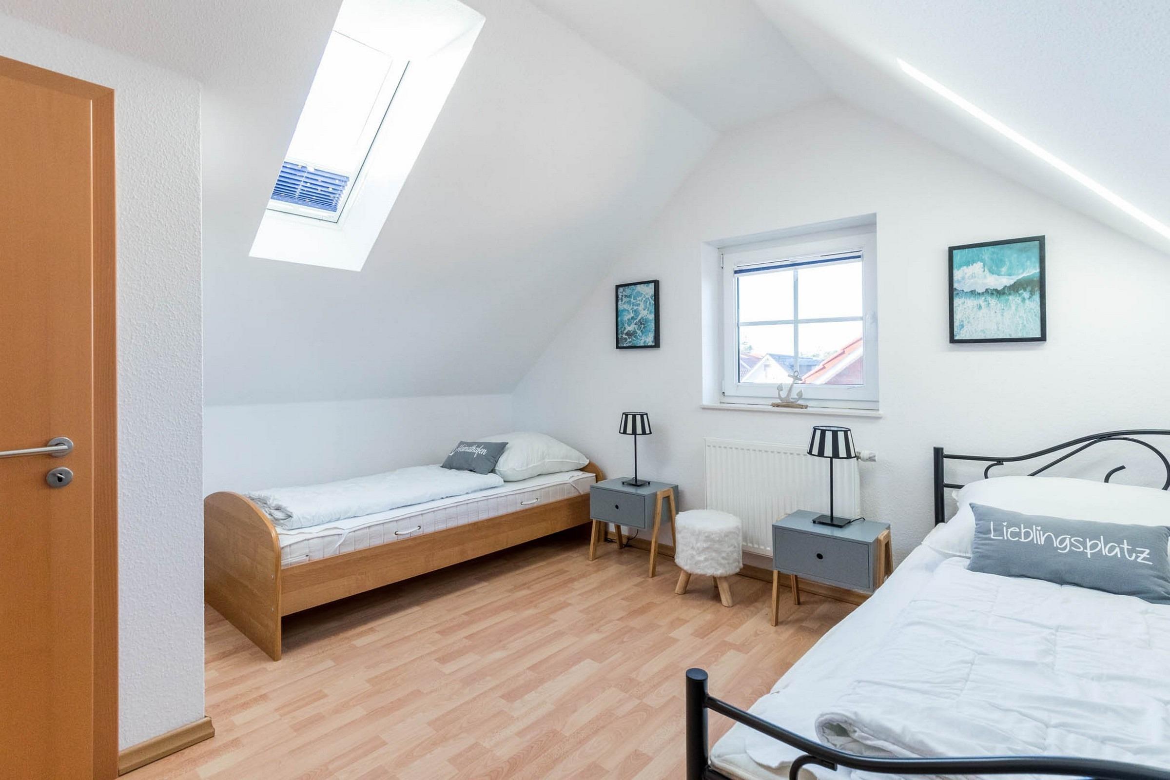 Auf rund 65qm über 2 Ebenen bietet das 1. Obergeschoss dieser Haushälfte eine Ausstattung für bis zu 4 Erwachsene + 1 Kind auf 3 modern eingerichteten Zimmern sowie Küche, Bad, Sauna und möblierten Südwest-Balkon.