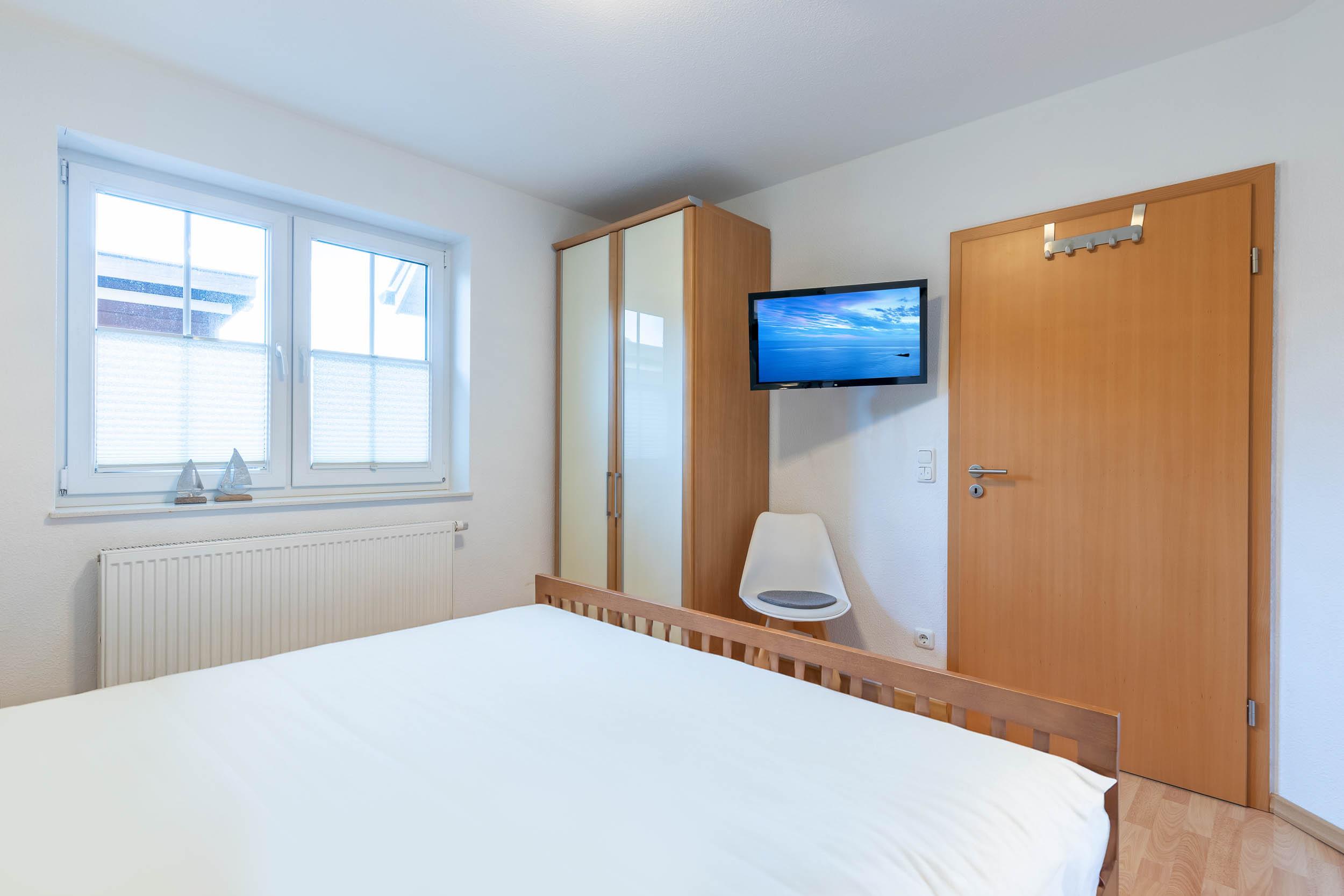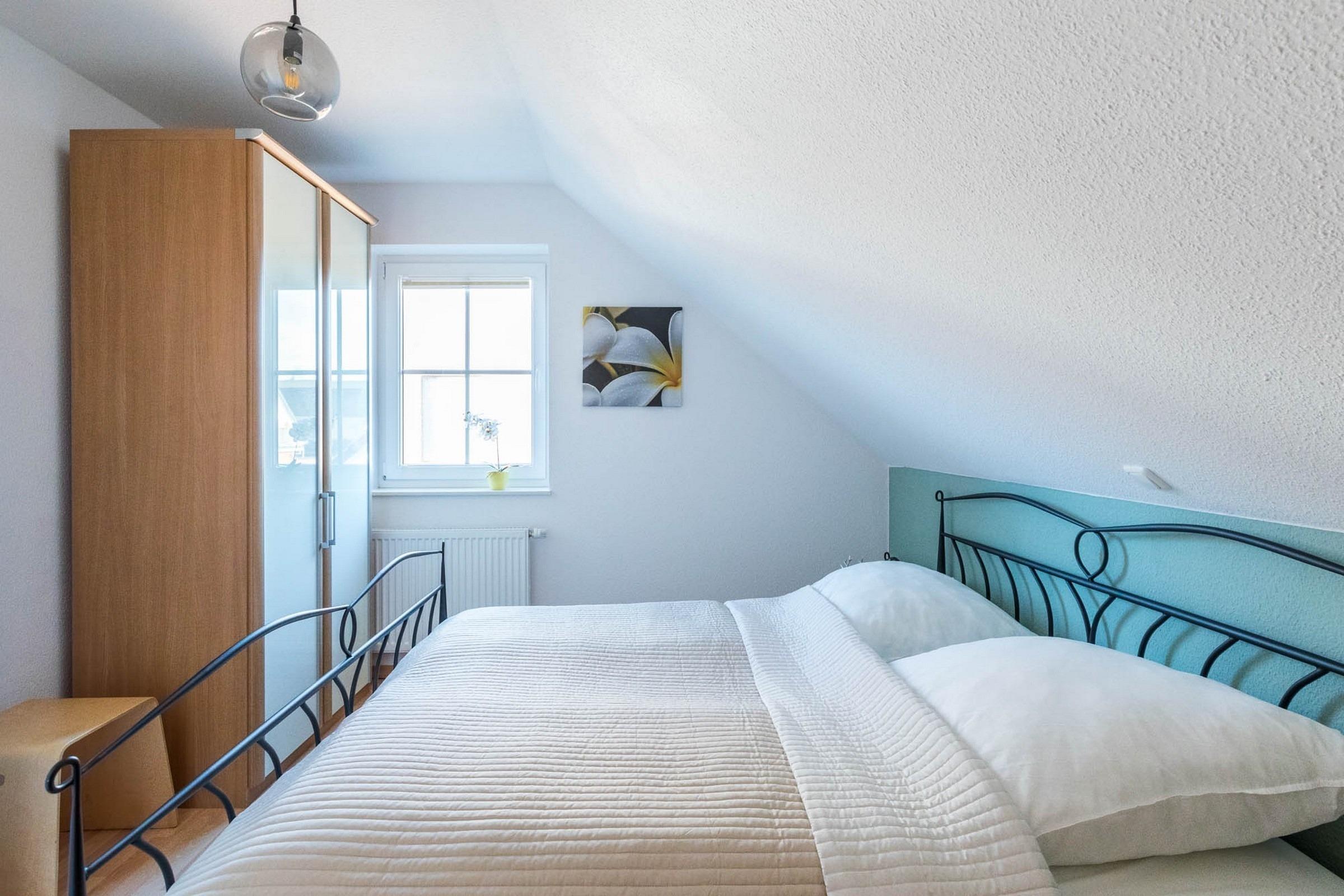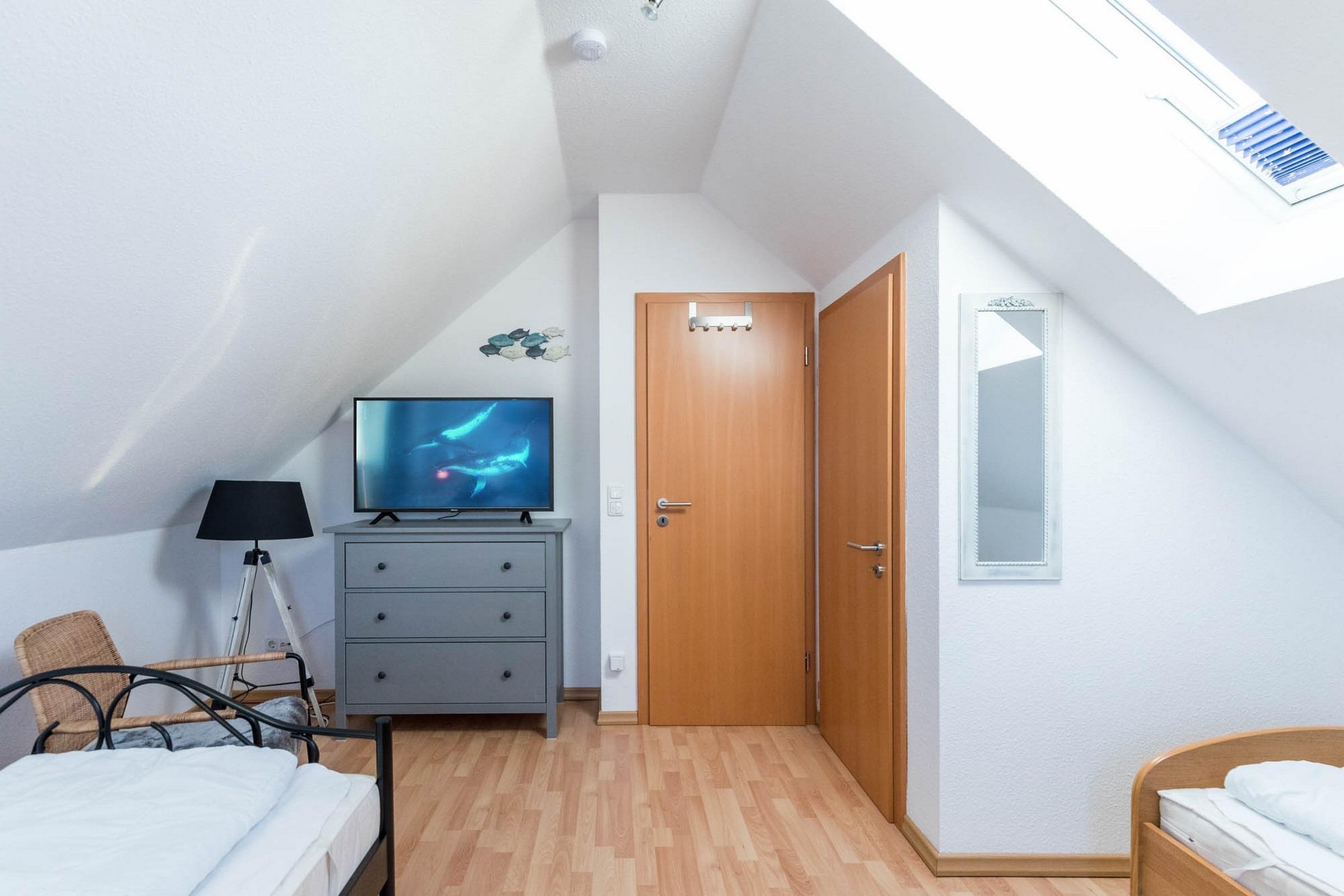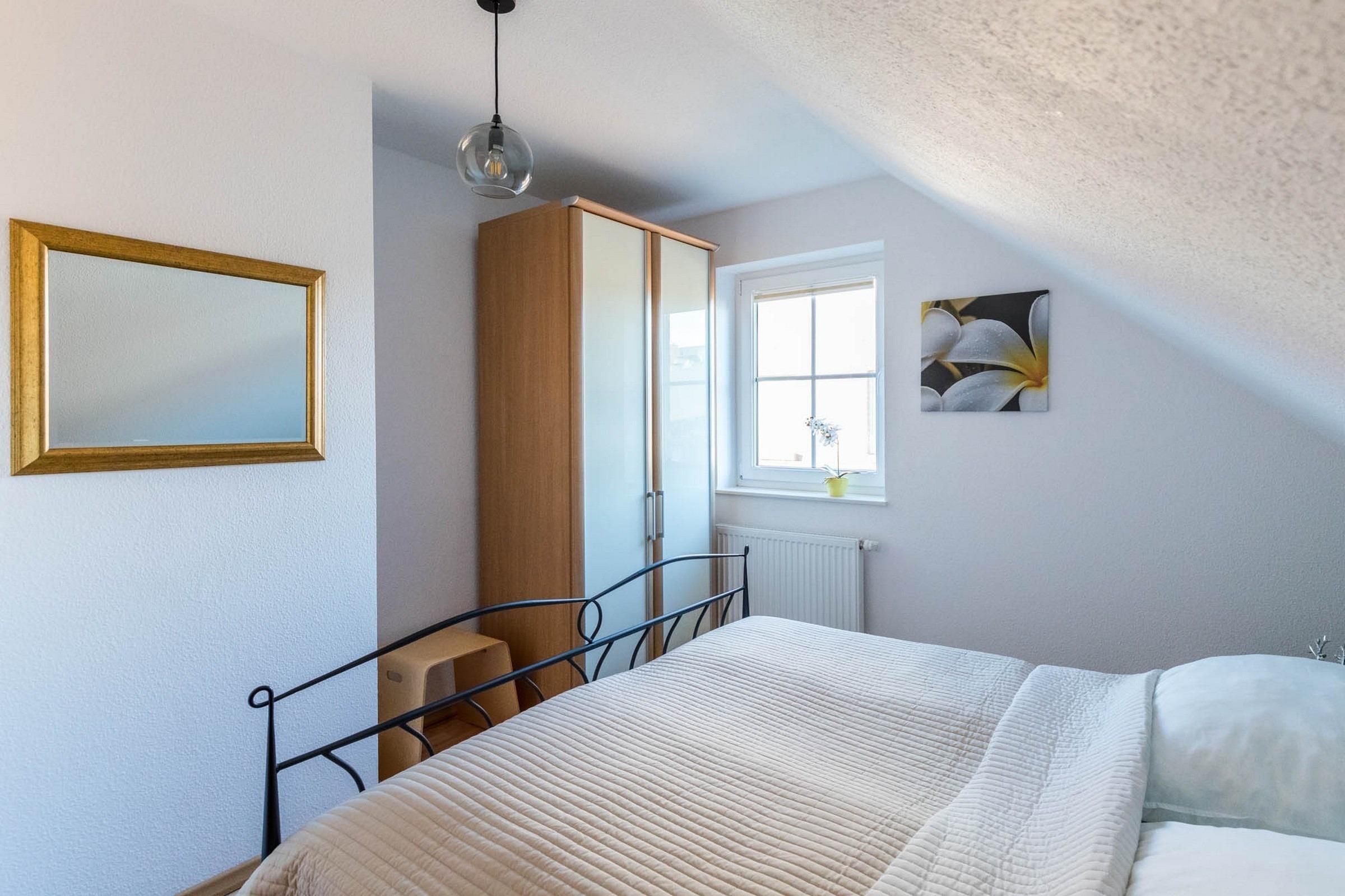Weiterhin beherbergt das Obergeschoss ein Schlafzimmer mit Doppelbett und das Dachgeschoss ein Gästezimmer mit französischen Doppelbett (140x200) und einem Einzelbett sowie eigenem Flatscreen-TV. Diverse Ablagemöglichkeiten für Ihre Kleidung finden Sie beiden Räumlichkeiten.
