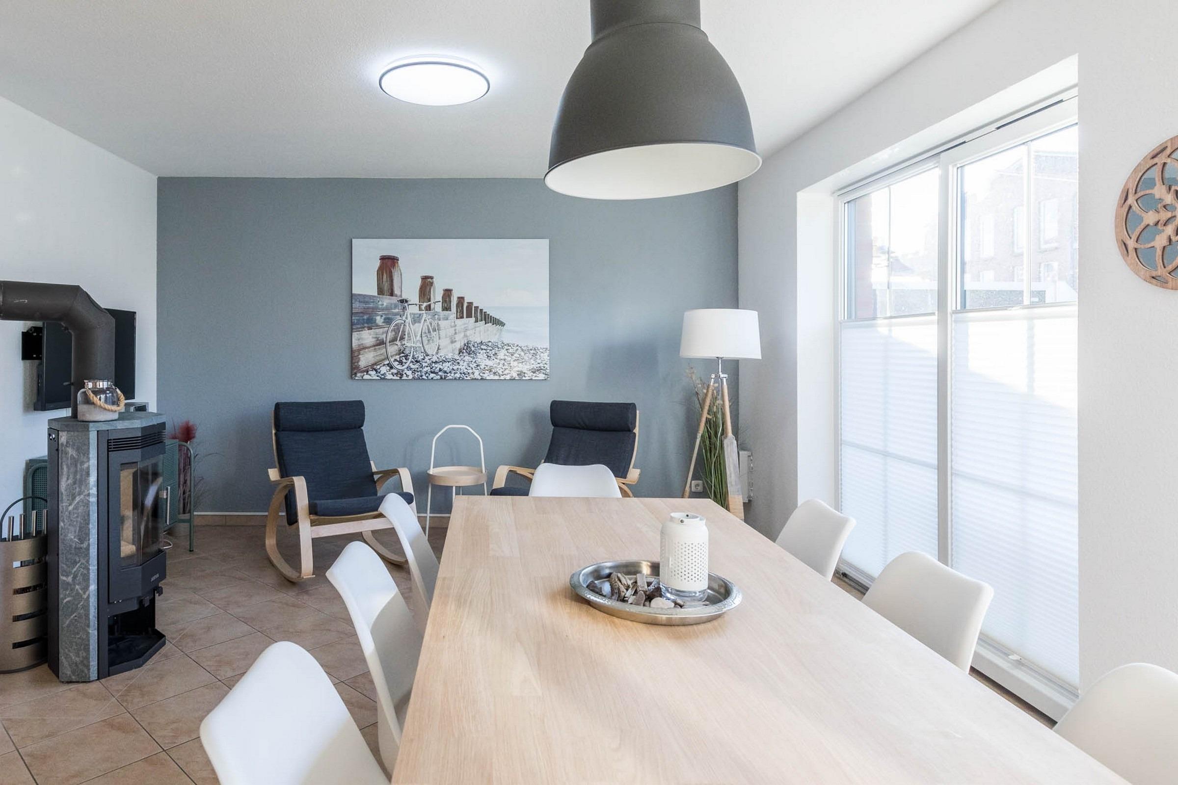 Die für insgesamt 8 Erwachsene + 1 Kind eingerichtete Ferienhaushälfte verfügt über eine Fußbodenheizung und kostenloses WLAN.