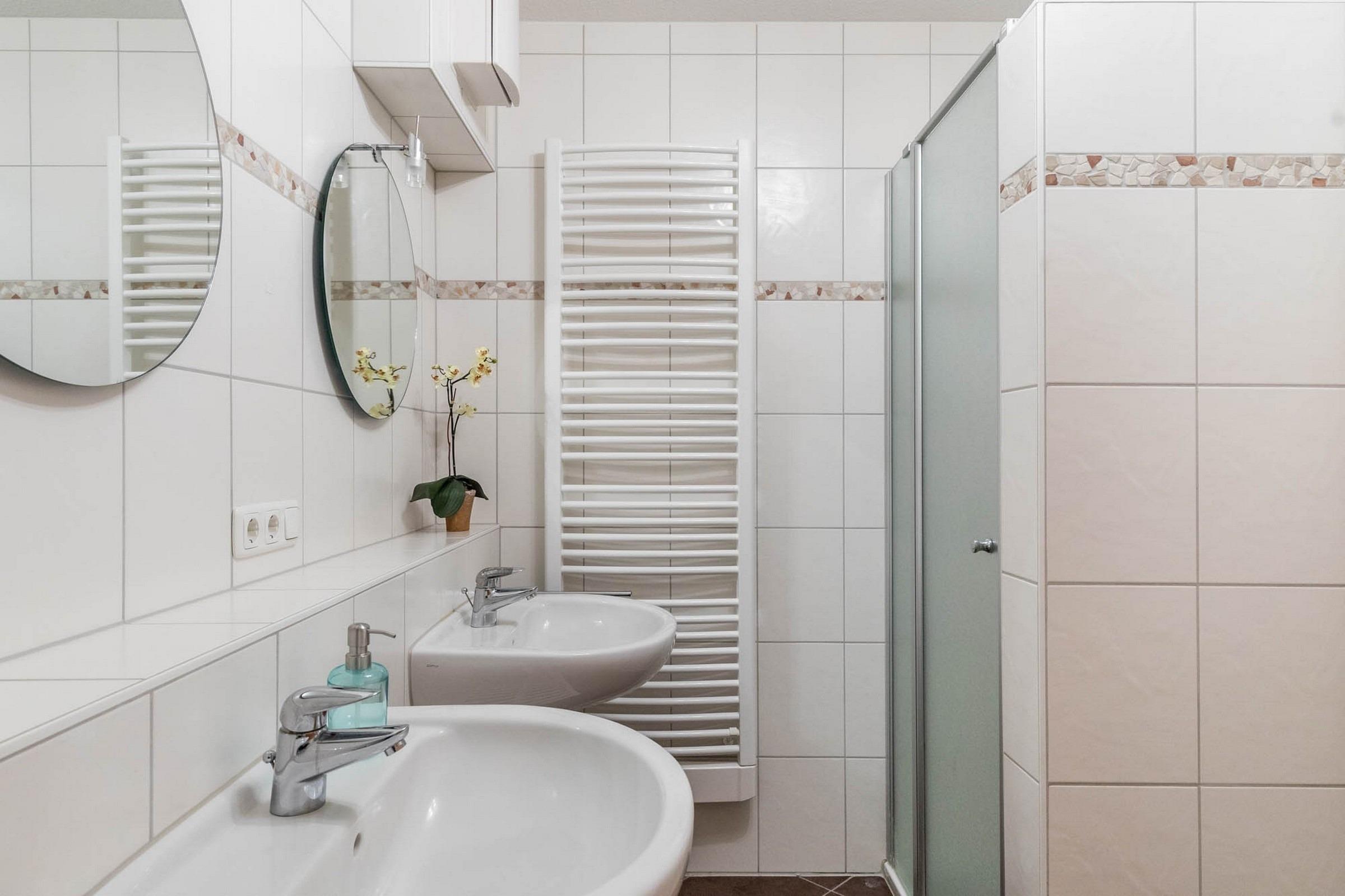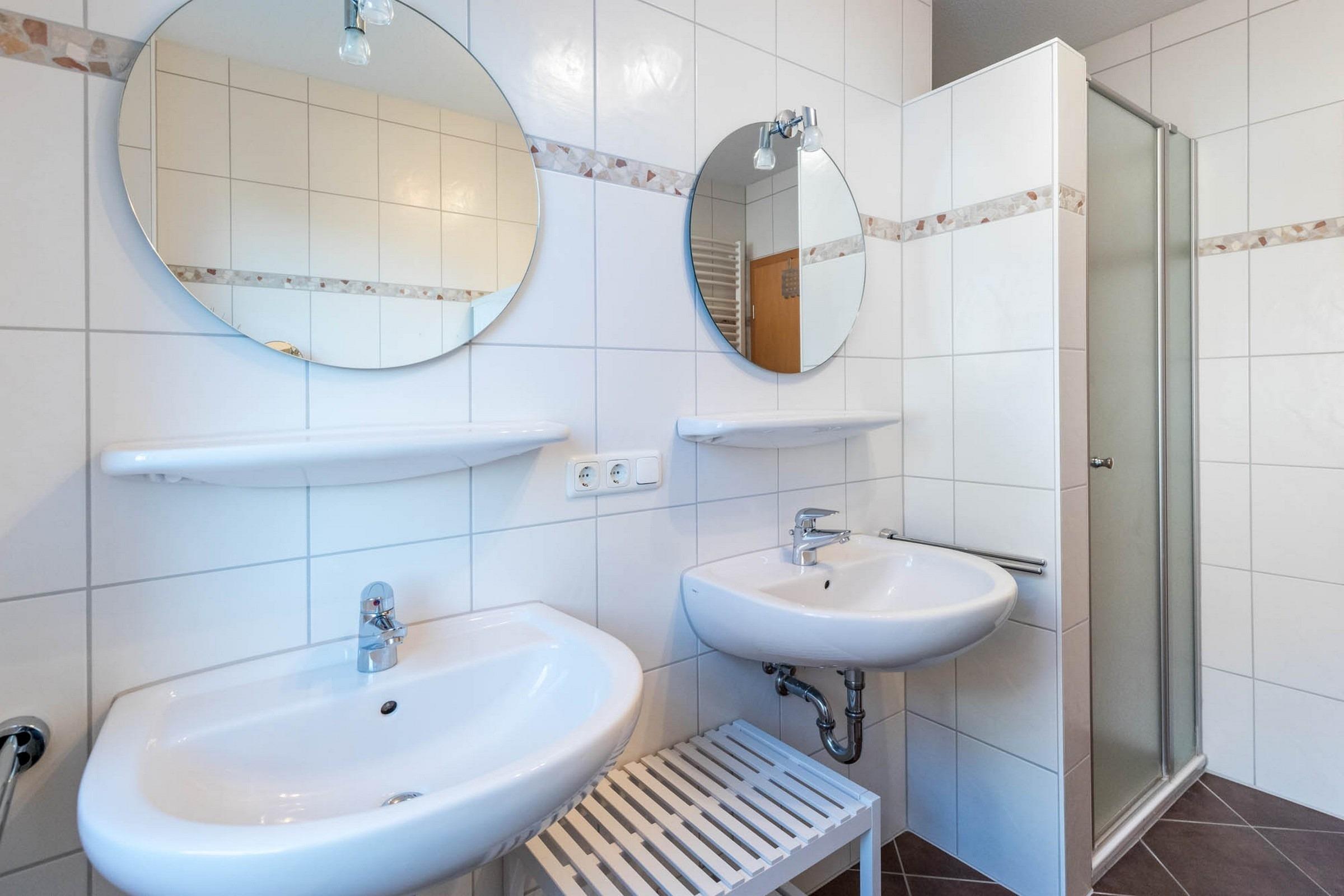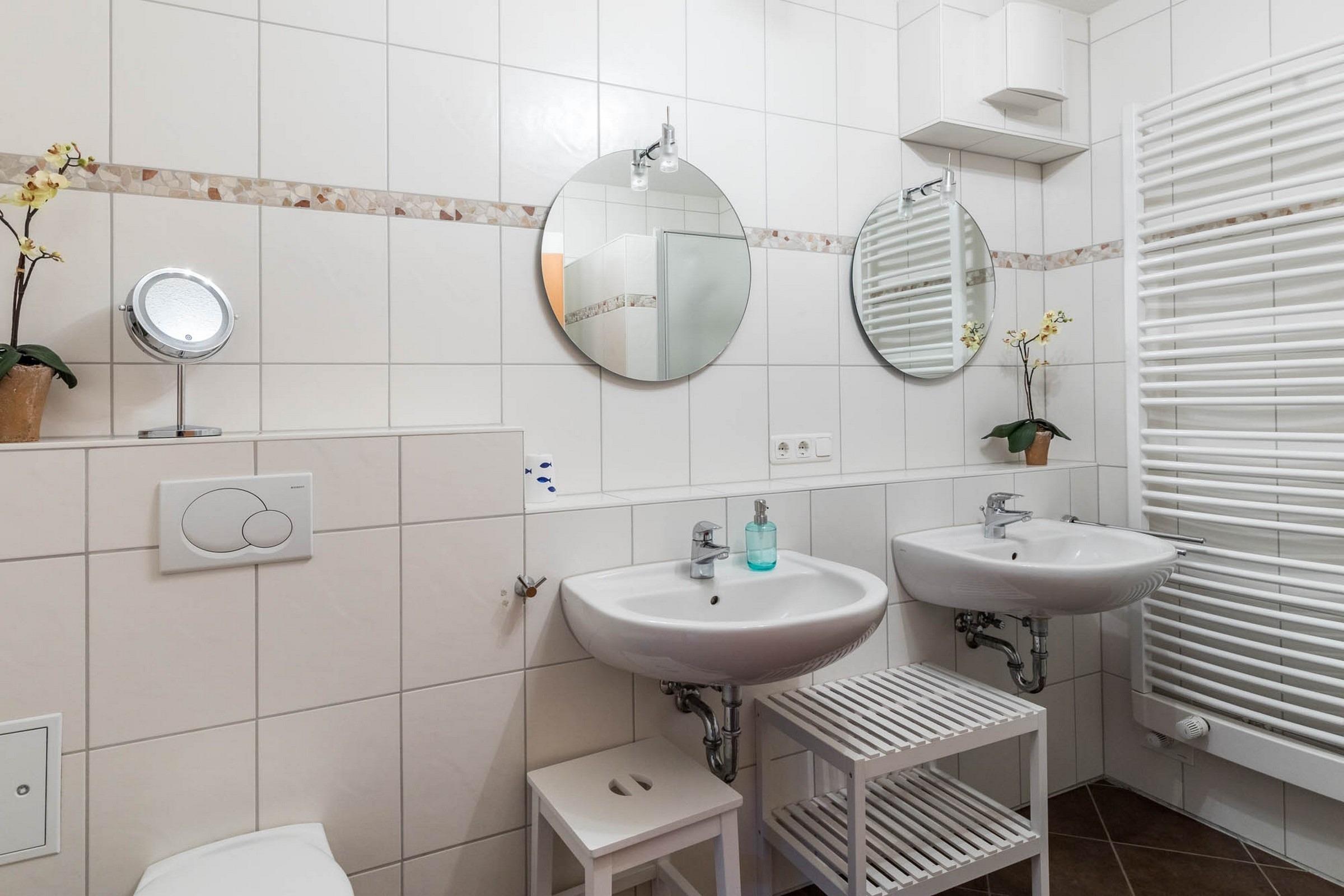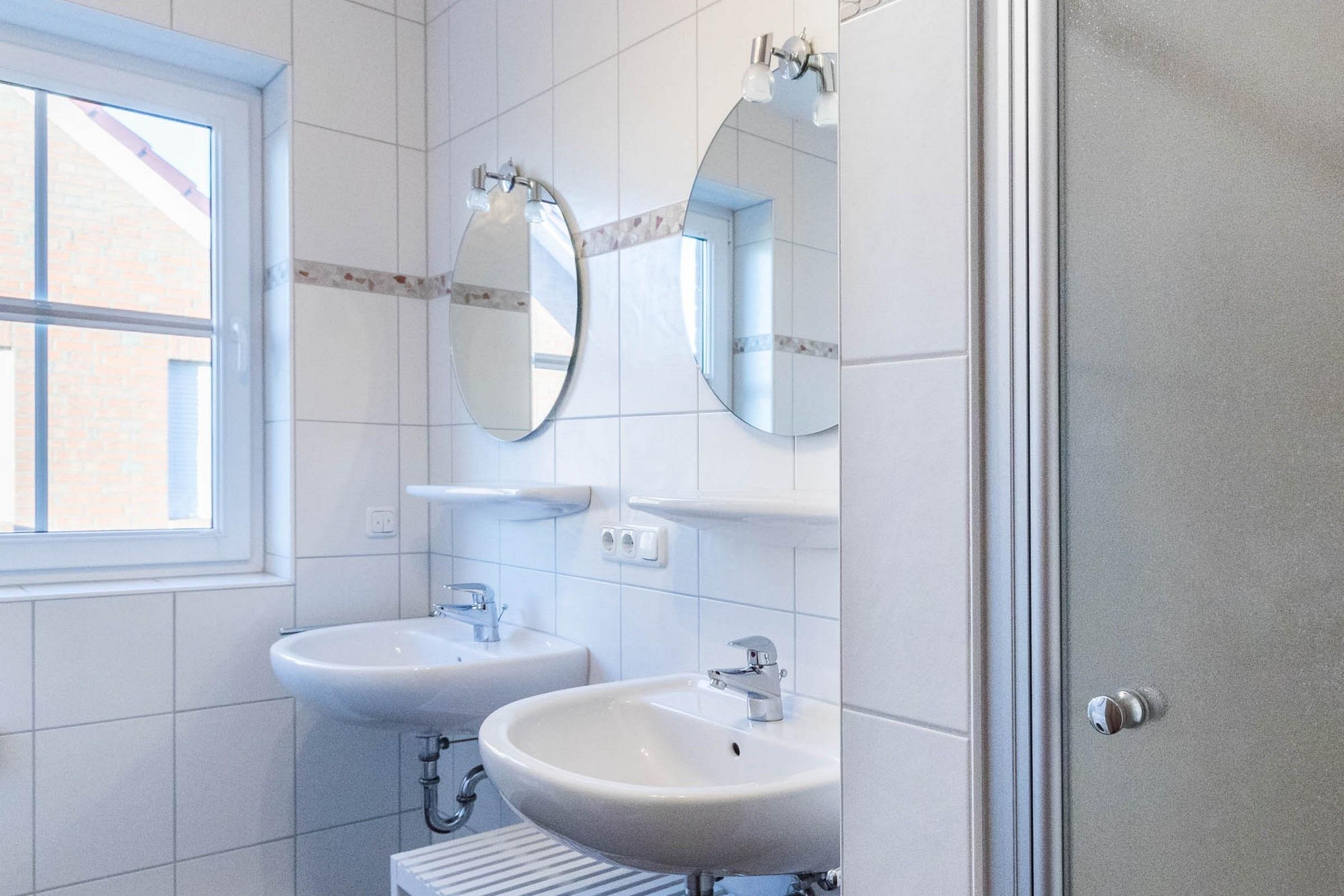 Auch das Badezimmer hält für den Familienaufenthalt an der Ostsee perfekte Bedingungen bereit: So stehen neben Dusche und WC auch zwei Waschtische zur Verfügung.