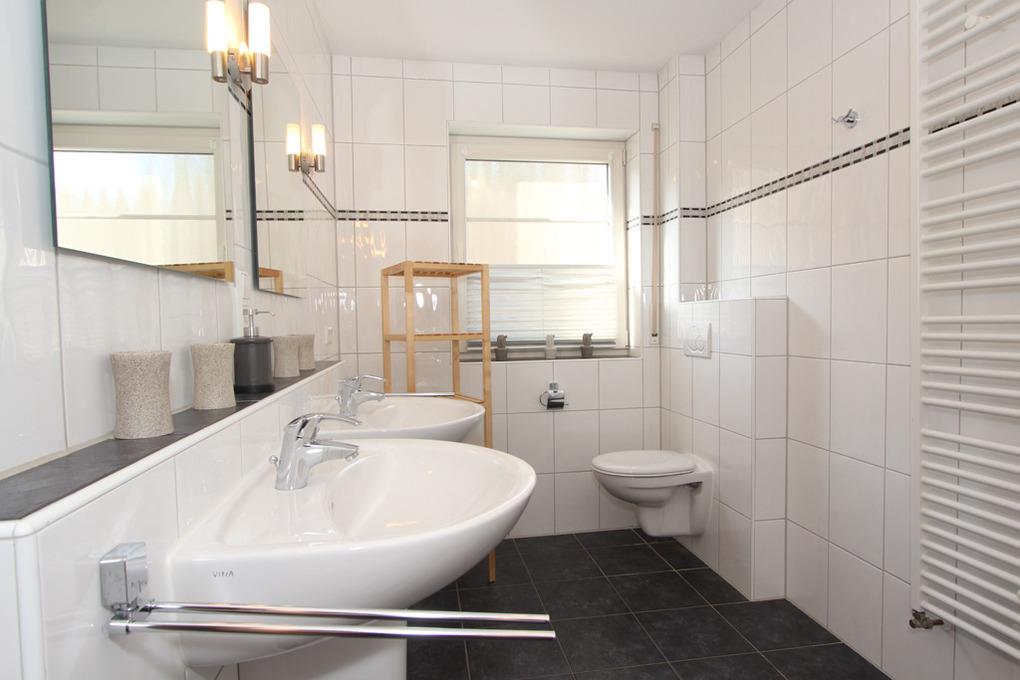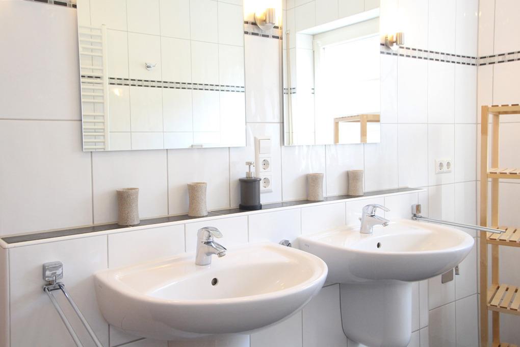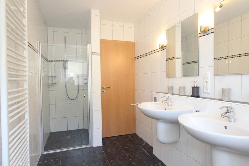 Im modernen Bad mit Tageslicht finden Sie eine ebenerdige Dusche, 2 Waschbecken und natürlich auch ein WC.