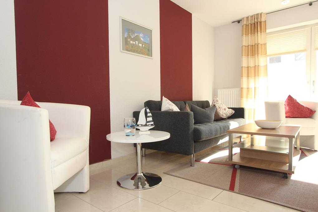 Das lichterfüllte Wohnzimmer ist neben geschmackvollen Möbeln mit einem gemütlichen Sofa, zwei Cocktailsesseln und Sat-TV ausgestattet.