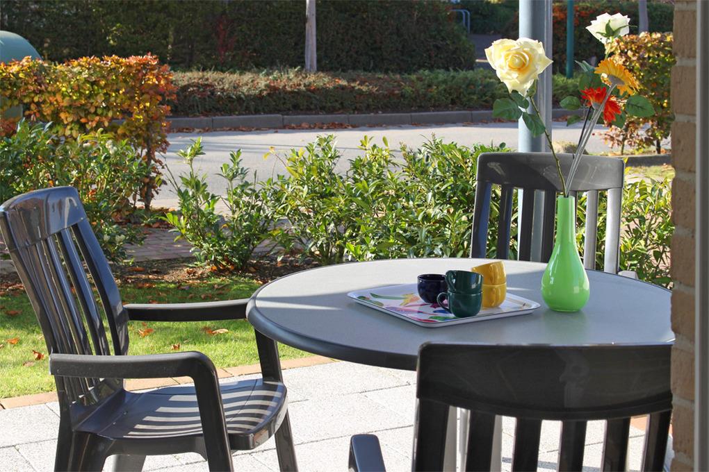 Zur möblierten Südwest-Eckterrasse gelangen Sie bequem vom Wohnbereich aus.