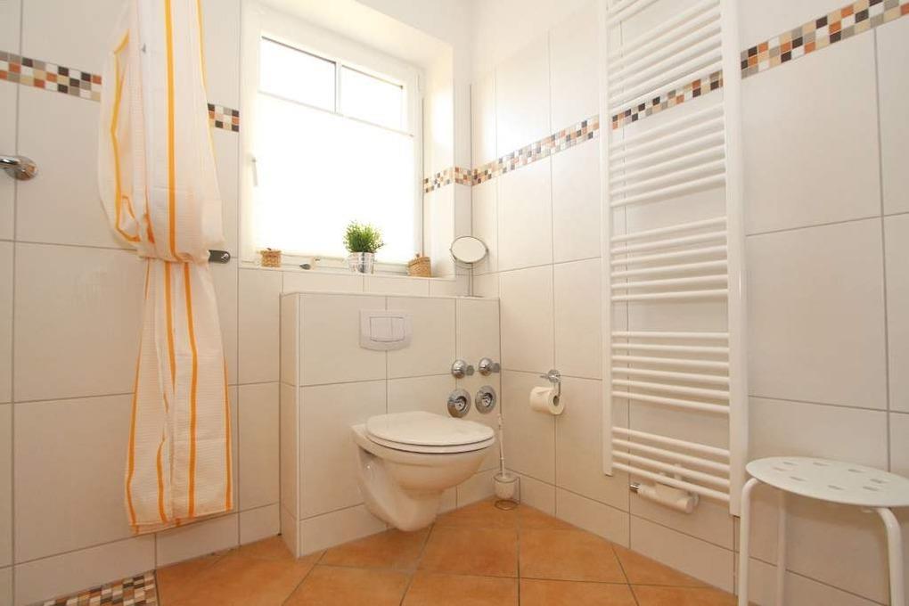 Zudem gehört ein großes Bad mit ebenerdiger Dusche und WC zum Ferienappartement. Das Fenster sorgt für angenehmes Tageslicht und hilft beim Lüften nach dem Duschen. Die Handtuchheizung sorgt hier für wohlige Wärme.