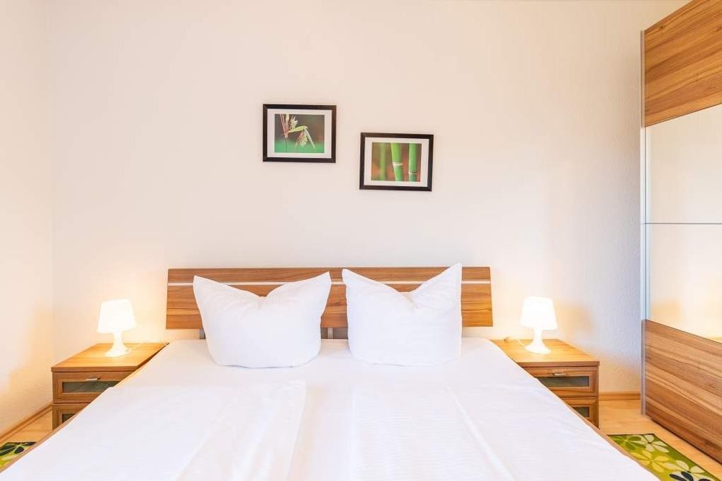 Zum Schlafen bietet die Wohnung ein Schlafzimmer mit Doppelbett (180x200cm/ Höhe 50cm), Kleiderschrank und LED Smart TV sowie ein Gäste-/ Kinderzimmer mit zwei Einzelbetten (je 90x200cm/ Höhe 53cm), Kleiderschrank und Schreibtisch.