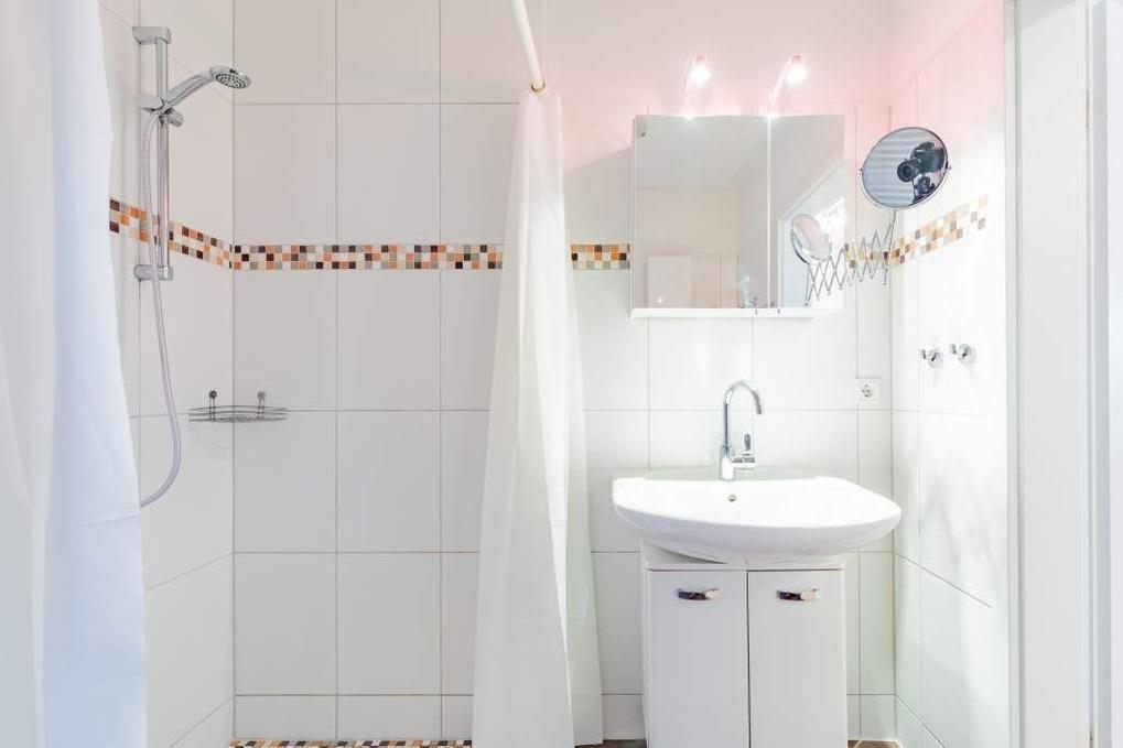 Das Bad ist mit einer barrierefreien Dusche und WC ausgestattet. Eine große Handtuchheizung sorgt für wohlige Wärme.
