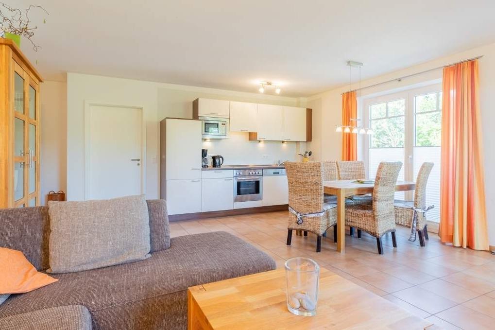 Im Wohnbereich befindet sich sowohl eine gemütliche Sofaecke für alle mit Sat-TV als auch eine gemütliche Essecke mit ausreichend Sitzmöglichkeiten. Die Küchenzeile bietet eine vorteilhafte Ausstattung für eine komplette Selbstverpflegung.