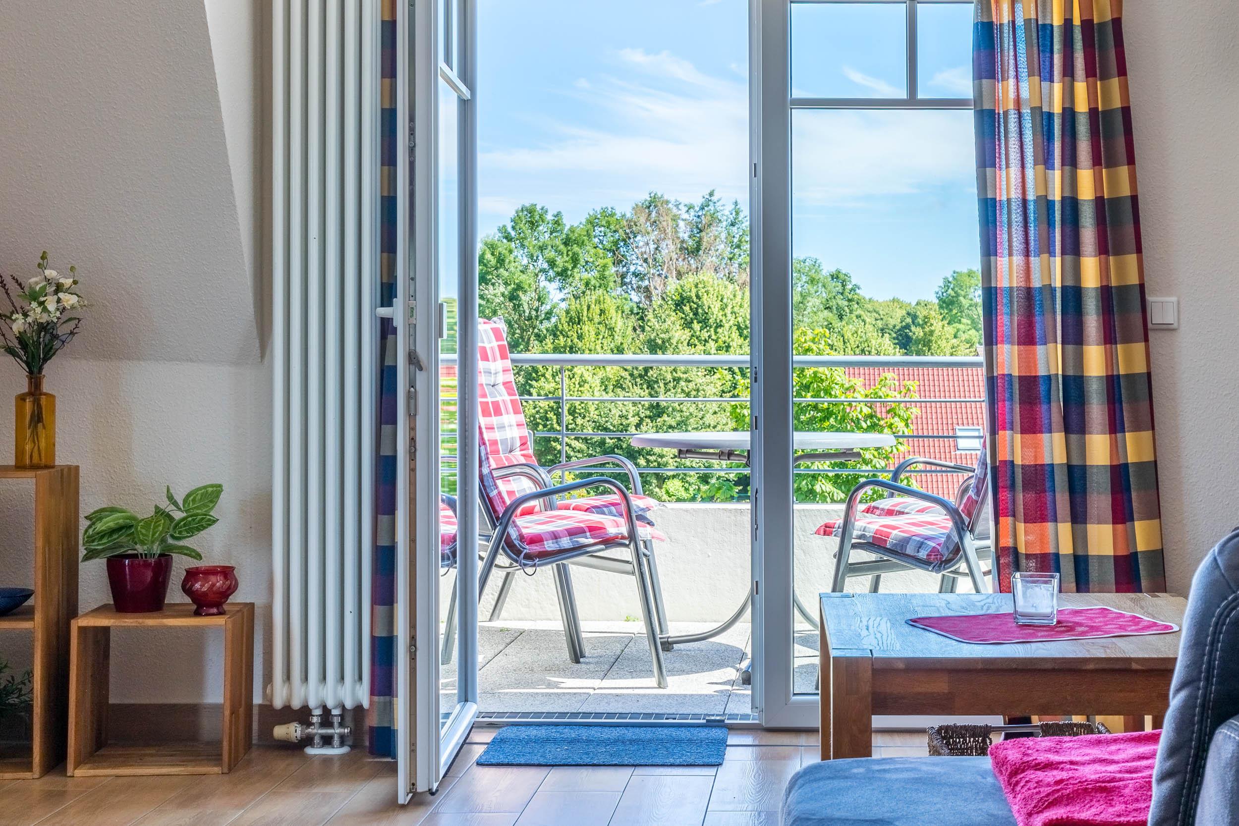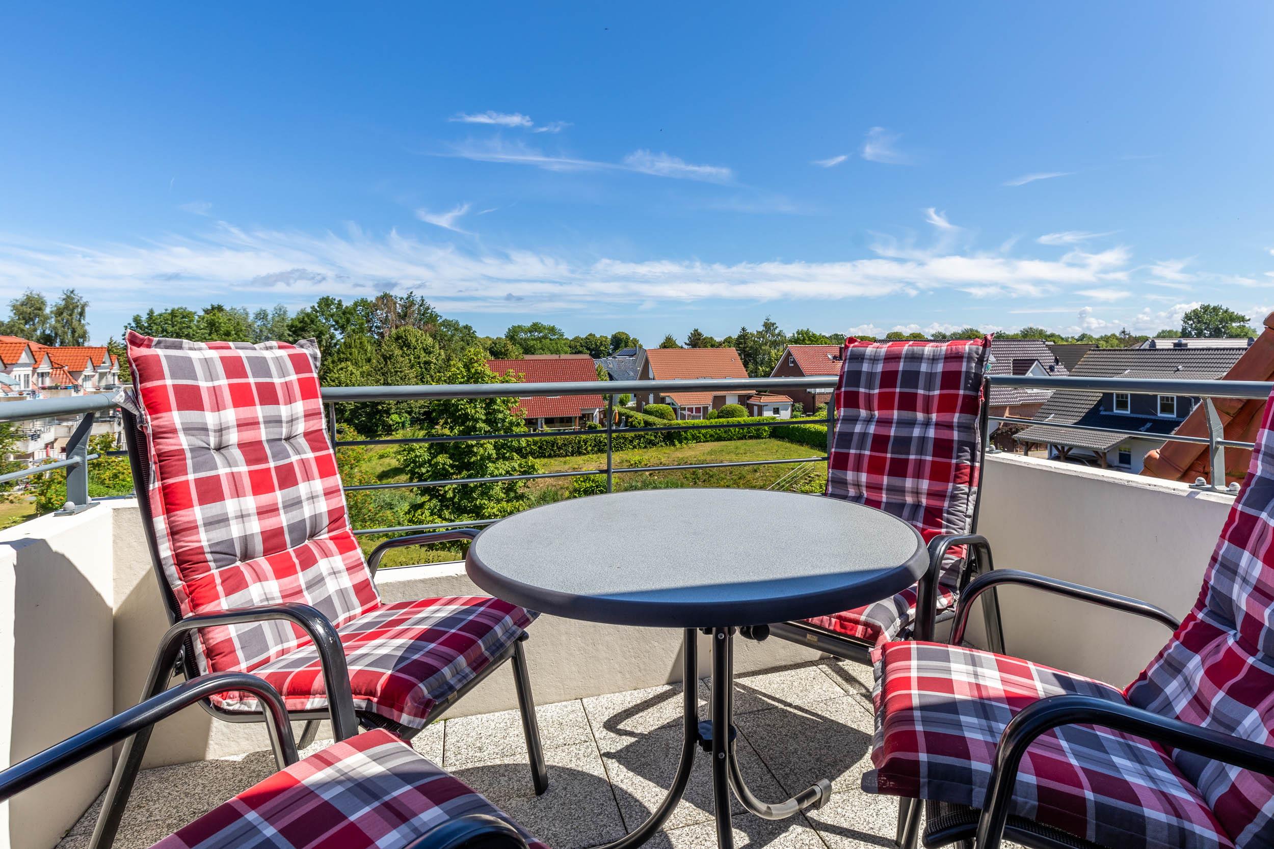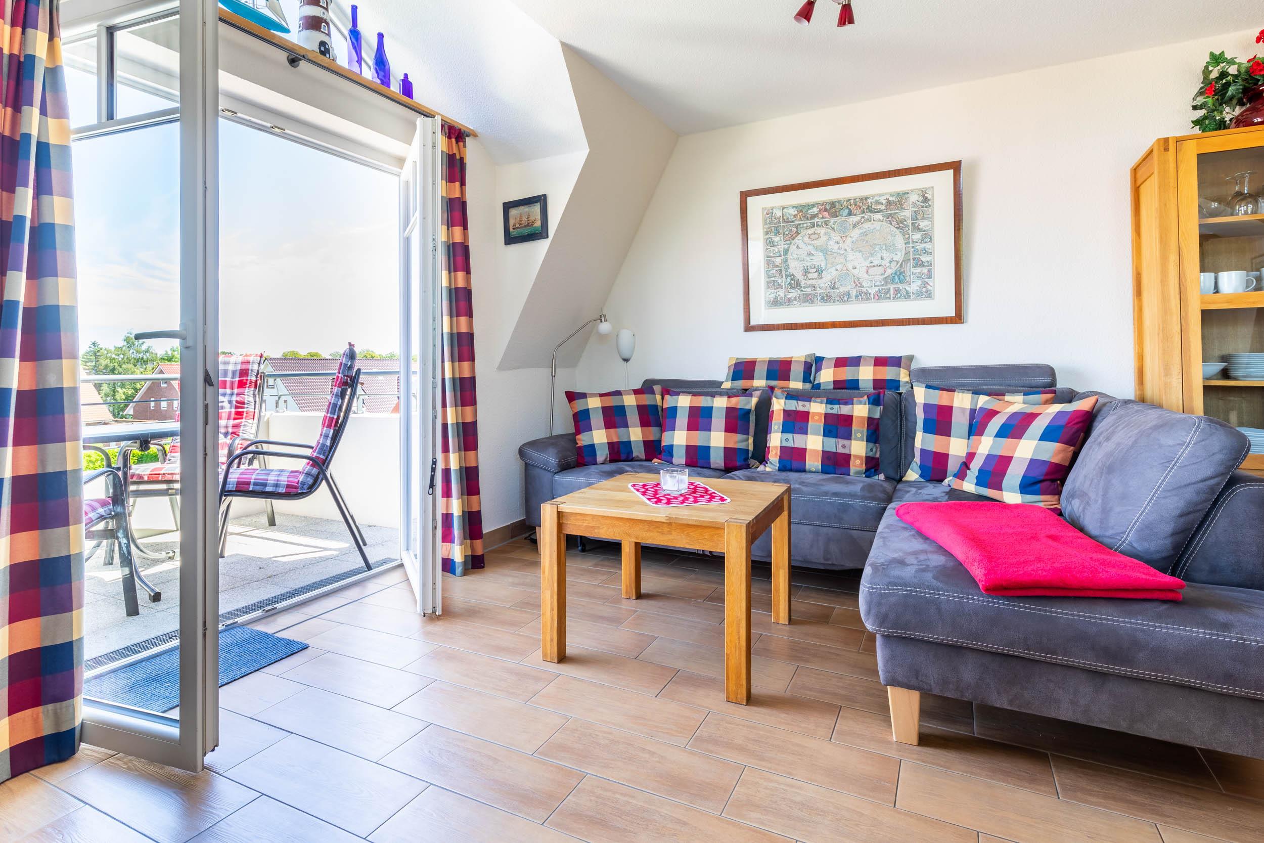 Der Wohnbereich mit SAT-TV und DVD-Player gibt die Möglichkeit her, auf beide möblierten Balkone (Nordost + Nordwest) zu gelangen. Die bequeme Sofaecke sorgt für die nötige Entspannung im Urlaub.