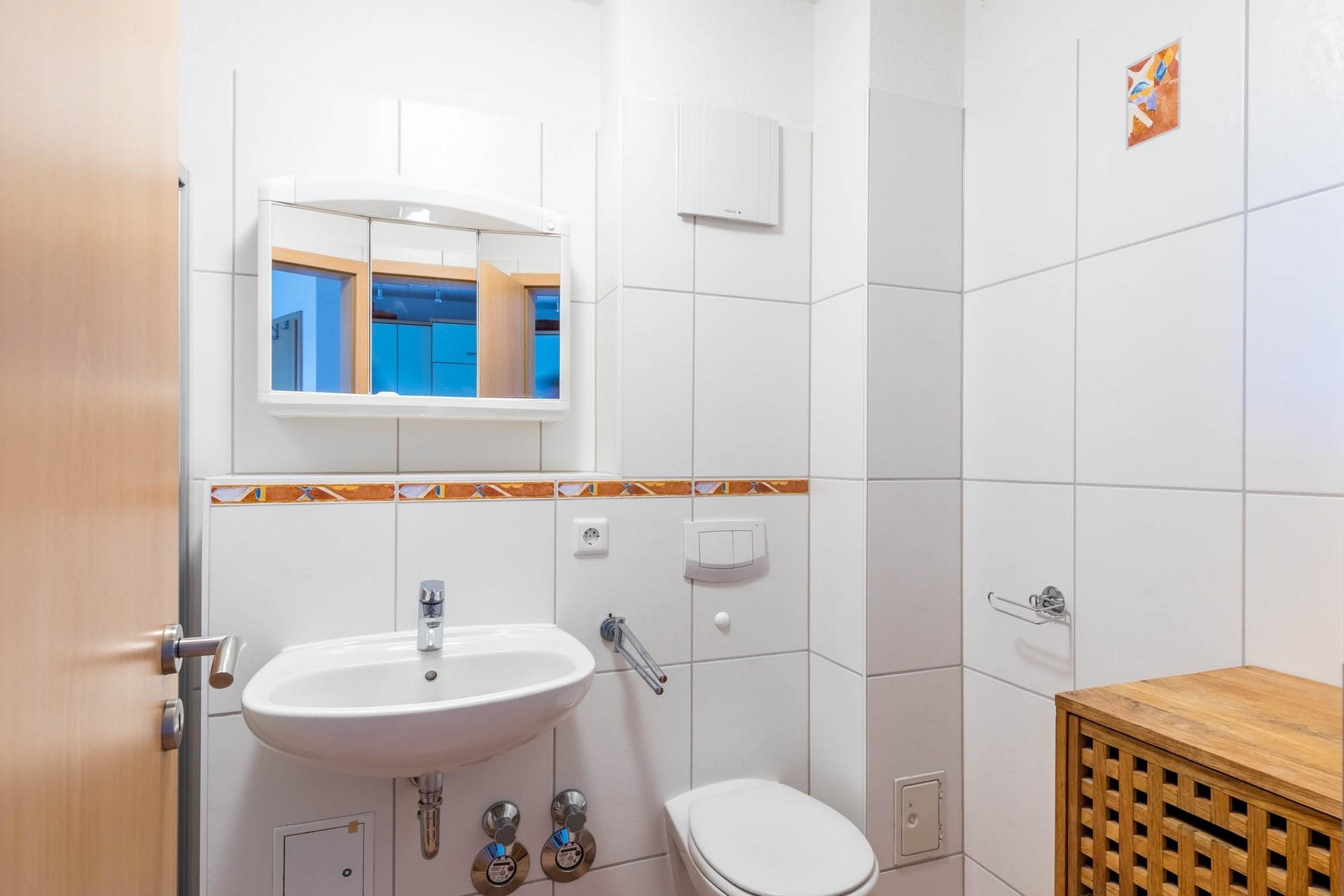 Das innenliegende Badezimmer bietet eine ebenerdige Dusche und WC. Auch steht Ihnen hier eine Waschmaschine sowie ein Trockner kostenfrei zur Verfügung.